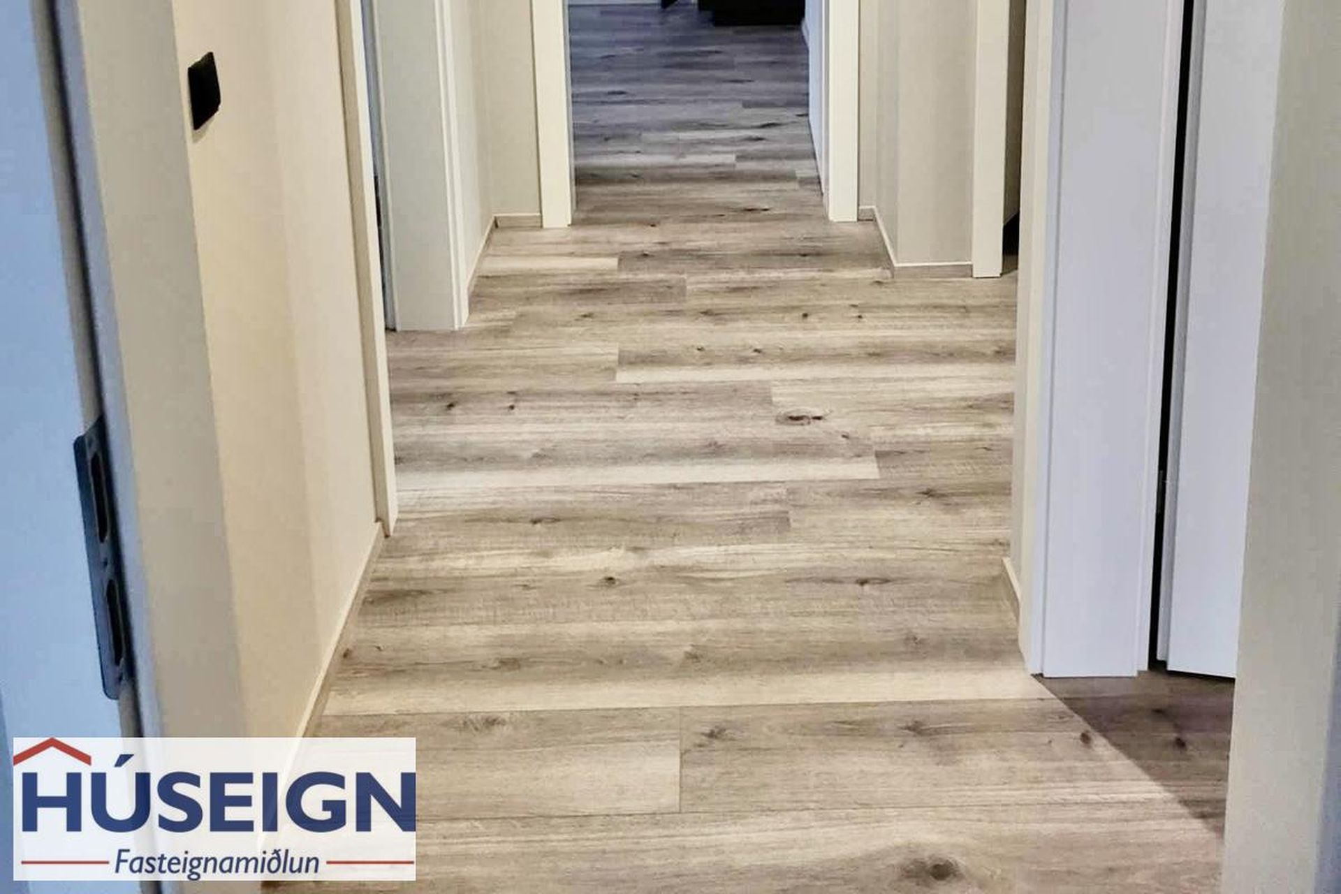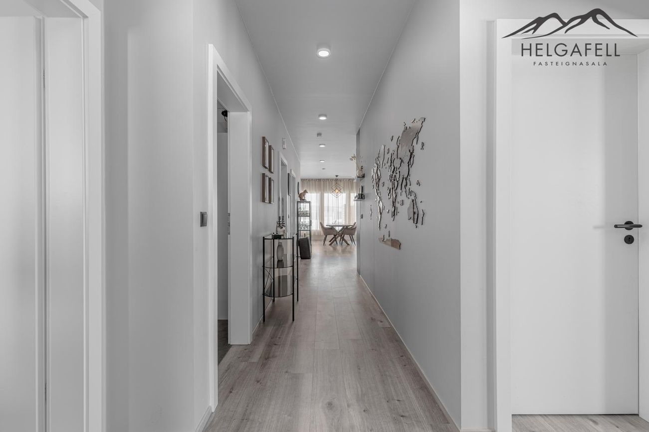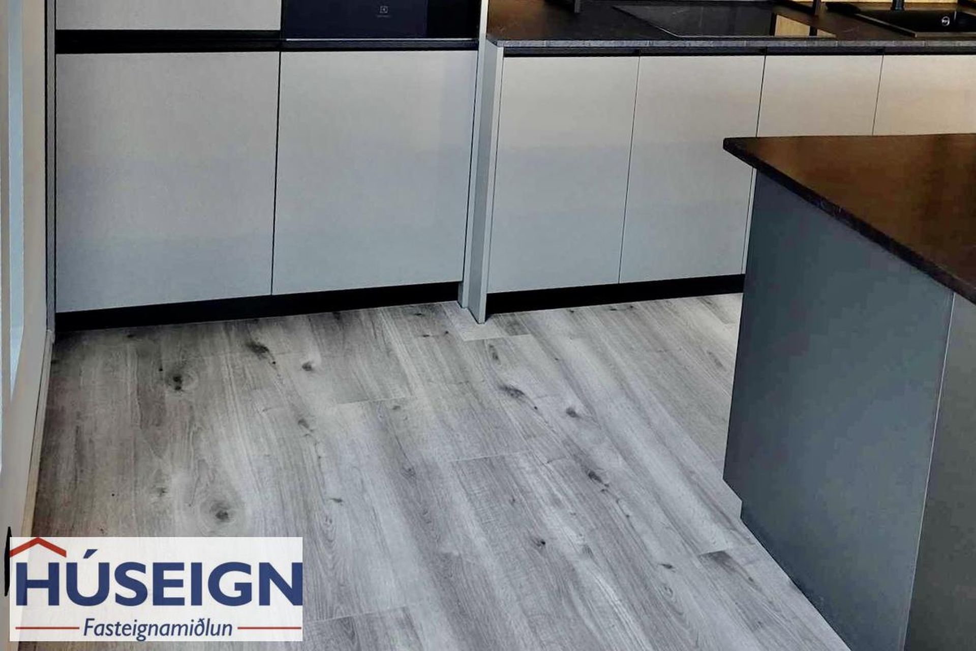 Eldhús: Glæný eldhúsinnrétting. Í alrými með stofu / borðstofu. Ný og glæsileg innrétting frá Axis, stór eyja með skúffum, borðplata og plata milli skápa er frá Fanntófell, tveir bakarofnar (Epoq frá Elko) og er annar þeirra örbylgjuofn og bakaraofn (combi), innbyggð uppþvottavél, ísskápur fylgir ekki með, spanhelluborð á eyju með innbyggðri viftu, parket á gólfi.