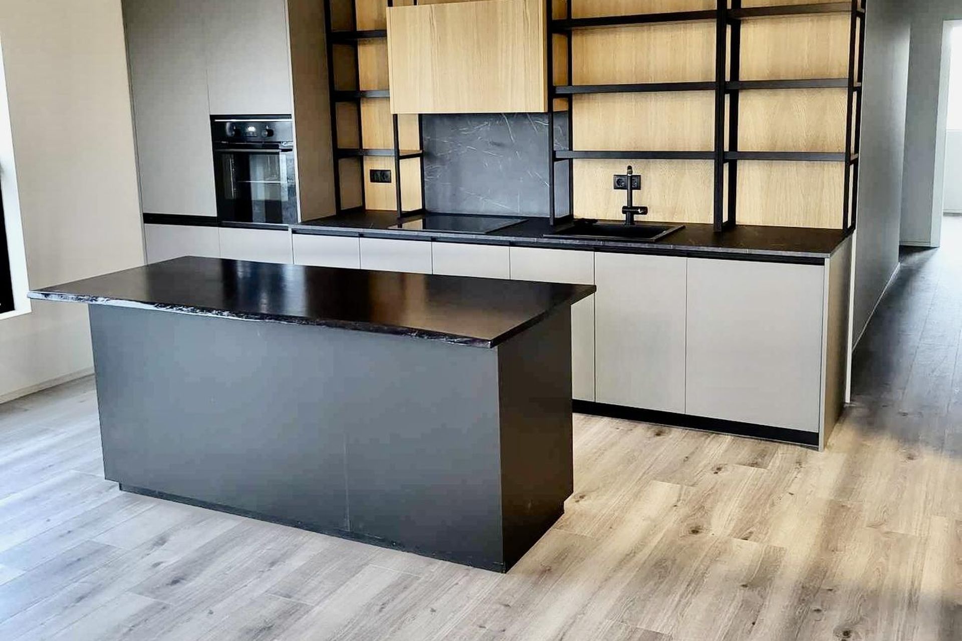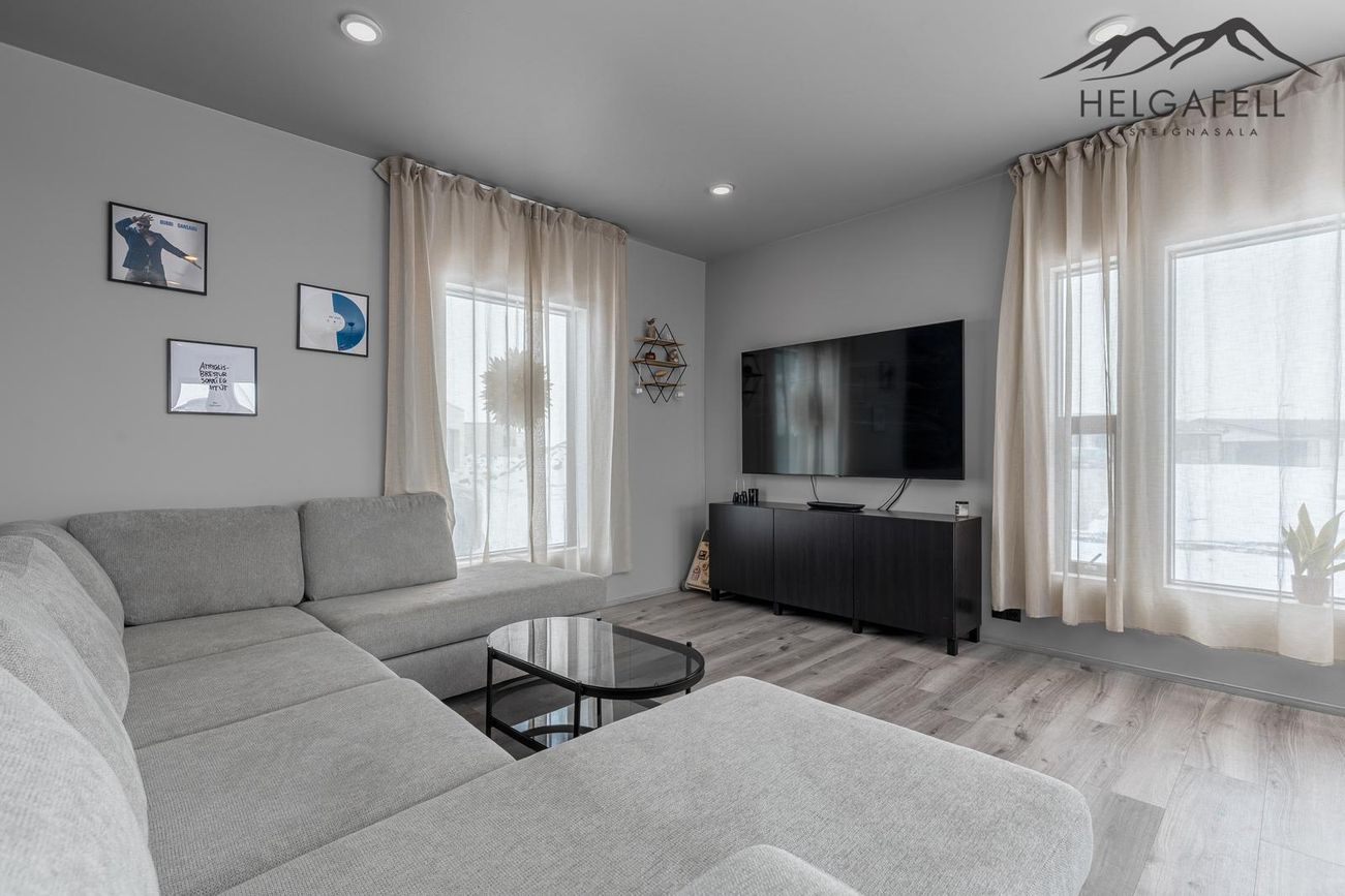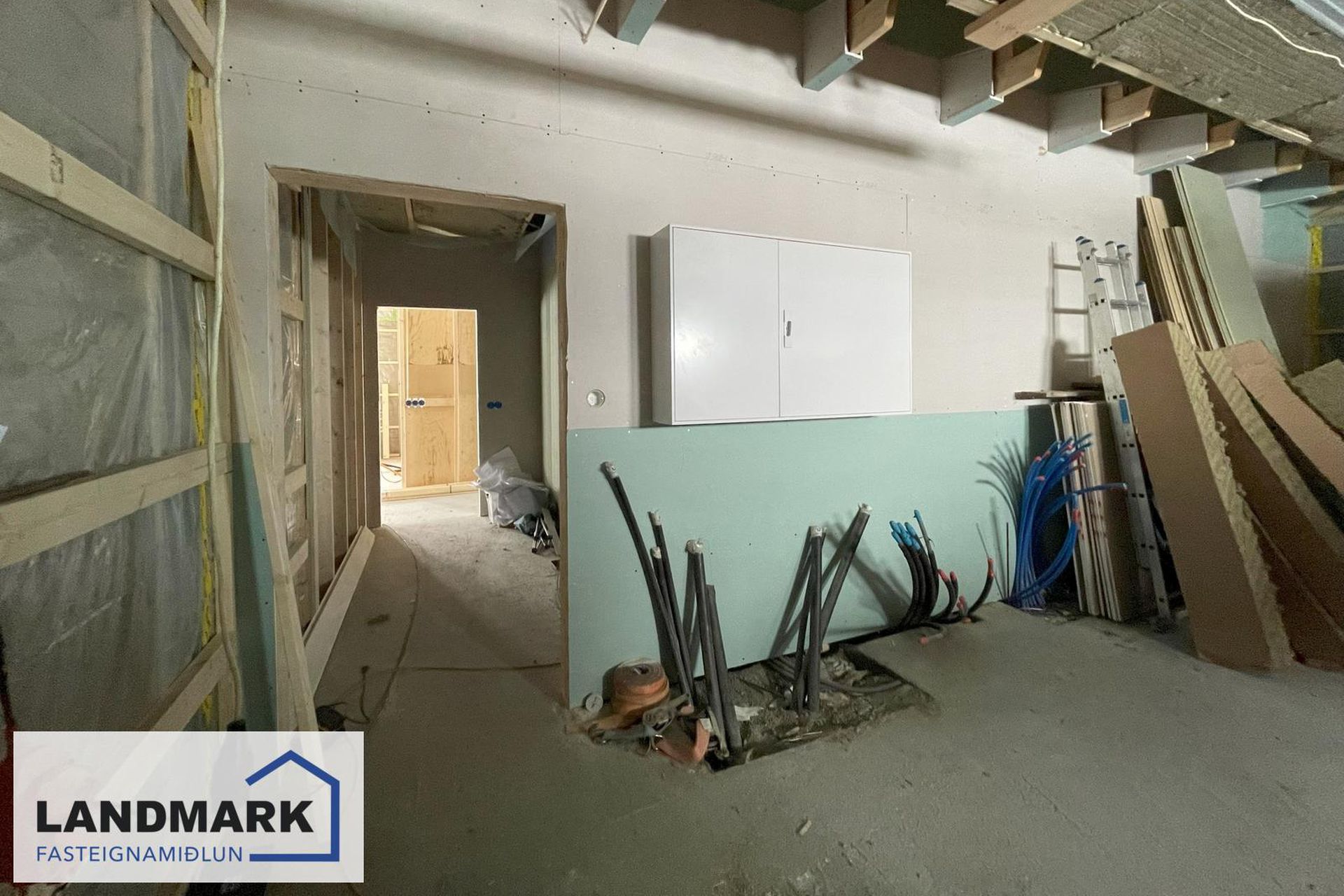 Eldhús: Glæný eldhúsinnrétting. Í alrými með stofu / borðstofu. Ný og glæsileg innrétting frá Axis, stór eyja með skúffum, borðplata og plata milli skápa er frá Fanntófell, tveir bakarofnar (Epoq frá Elko) og er annar þeirra örbylgjuofn og bakaraofn (combi), innbyggð uppþvottavél, ísskápur fylgir ekki með, spanhelluborð á eyju með innbyggðri viftu, parket á gólfi.