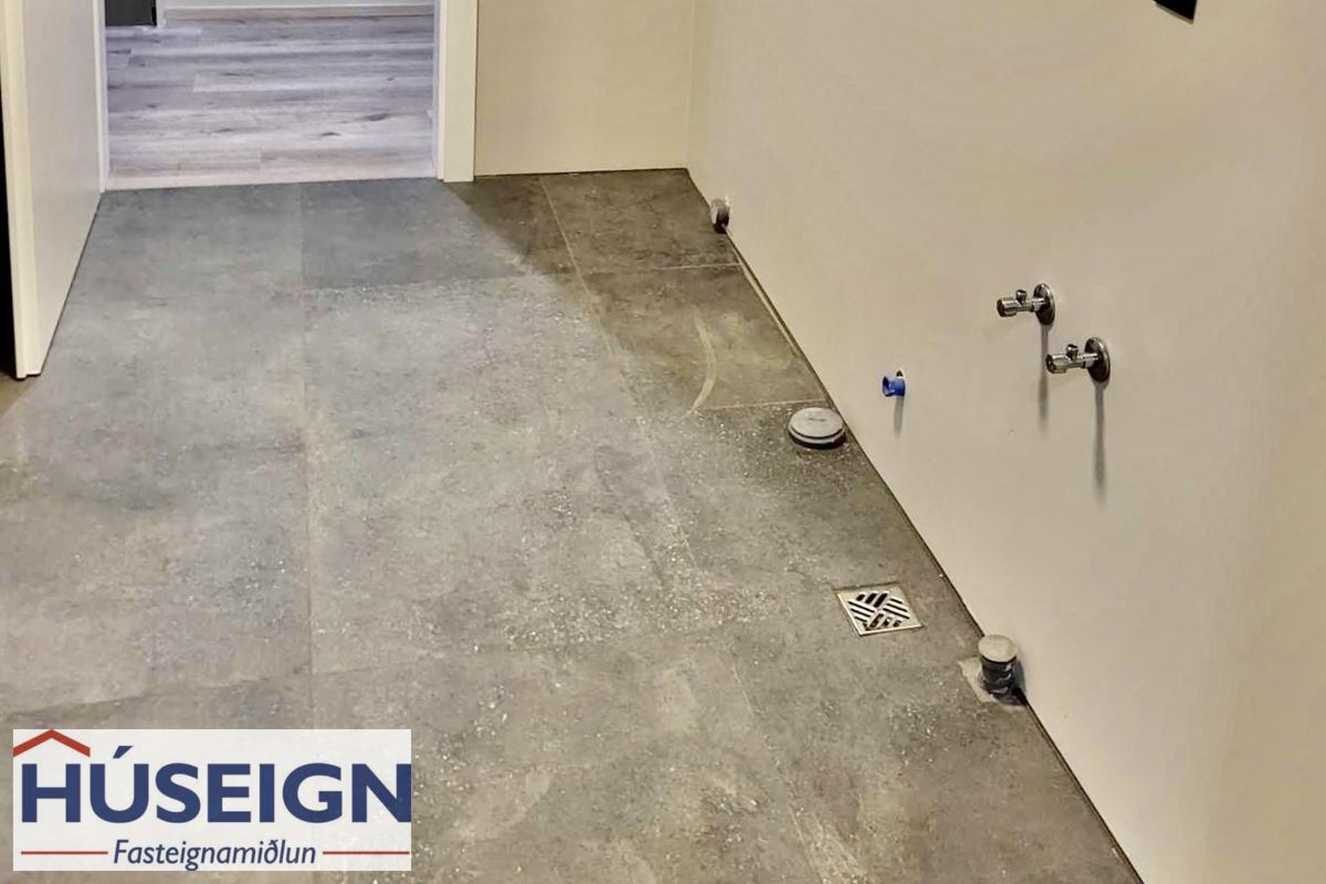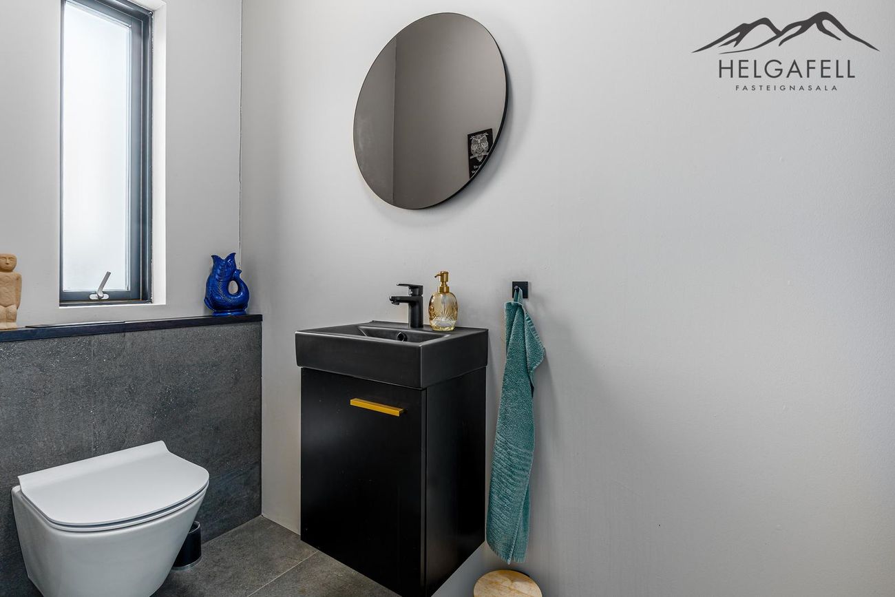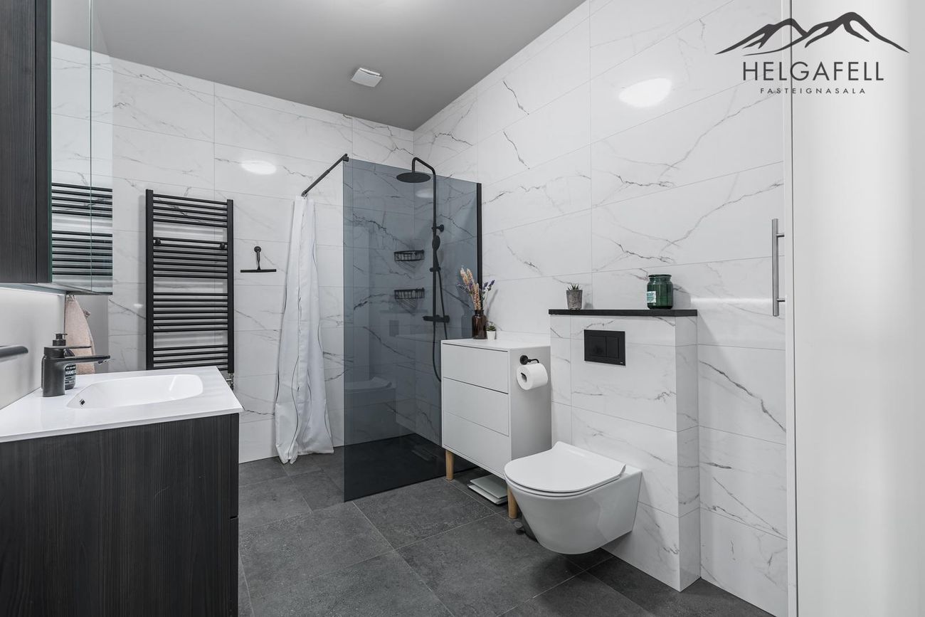 Baðherbergi: Rúmgott, með fallegri svartri innréttingu, speglaskápur með innfelldri lýsingu, hvítur skápur, vegghengt salerni, handklæðaofn, walk in sturta, tengi er fyrir þvottavél og þurrkara, flísalagt í hólf og gólf.