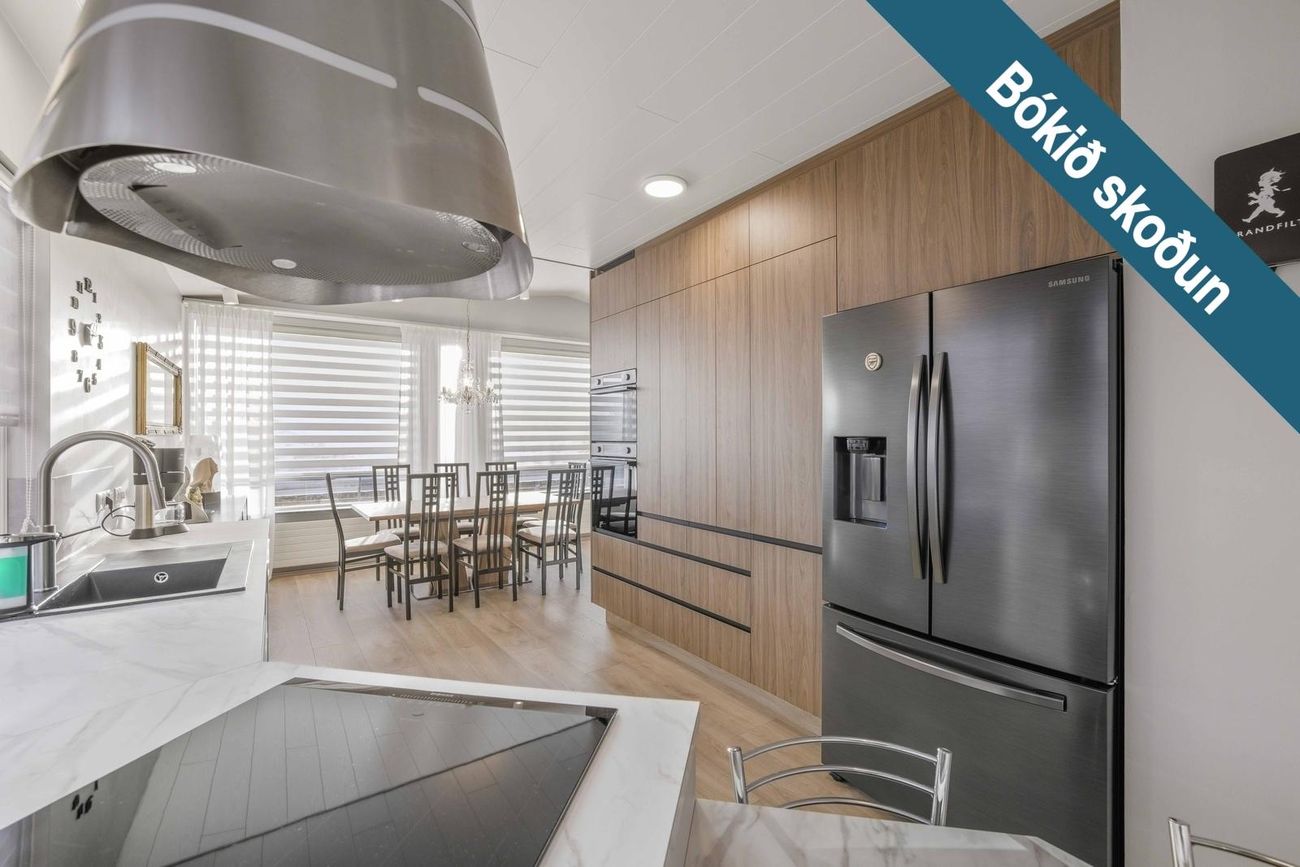 Nánari lýsing eignar:Eldhús: Hefur nýlega, fallega innréttingu með innbyggðum tækjaskáp. Nýlegur tvískiptur bakarofn og combiofn frá Samsung sem bæði er ofn og örbylgjuofn. Nýlegur háfur, keyptur í Rafha og nýlegt helluborð. Vaskur endurnýjaður og nýleg Siemens uppþvottavél. Stór innbyggður búrskápur í vegg í eldhúsi. Gólfefni nýleg frá Birgisson og nýlegar loftaplötur frá Þ. Þorgrímsson