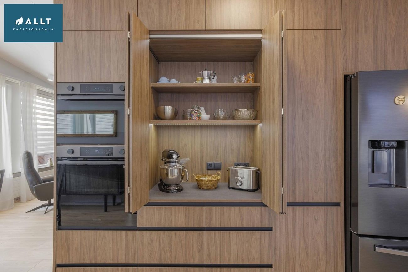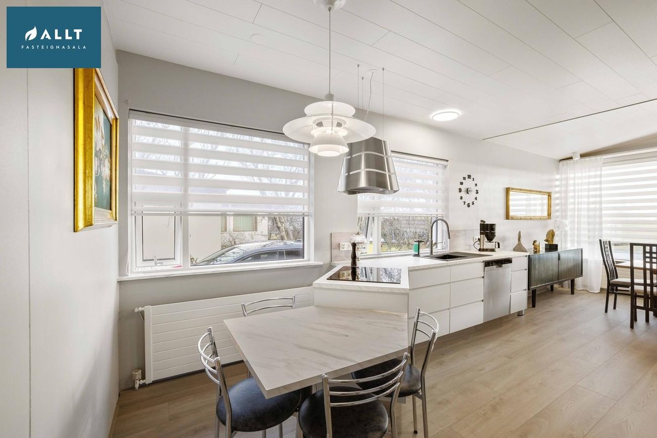 Nánari lýsing eignar:Eldhús: Hefur nýlega, fallega innréttingu með innbyggðum tækjaskáp. Nýlegur tvískiptur bakarofn og combiofn frá Samsung sem bæði er ofn og örbylgjuofn. Nýlegur háfur, keyptur í Rafha og nýlegt helluborð. Vaskur endurnýjaður og nýleg Siemens uppþvottavél. Stór innbyggður búrskápur í vegg í eldhúsi. Gólfefni nýleg frá Birgisson og nýlegar loftaplötur frá Þ. Þorgrímsson