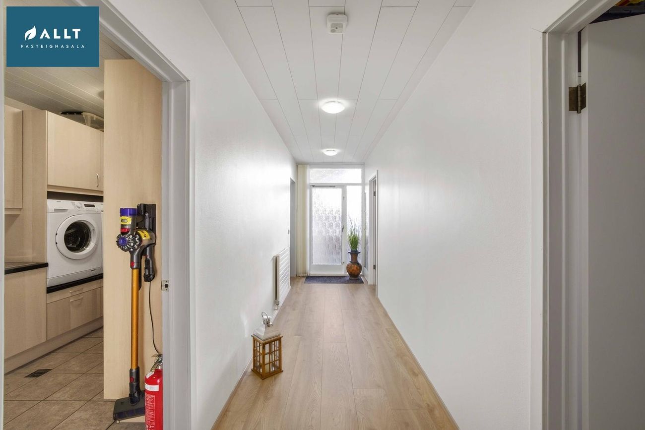 Þvottahús: hefur verið stækkað inn í geymslu og hefur mikið skápapláss, pláss fyrir þvottavél og þurrkara, skolvaskur og þvottasnúrur í lofti.