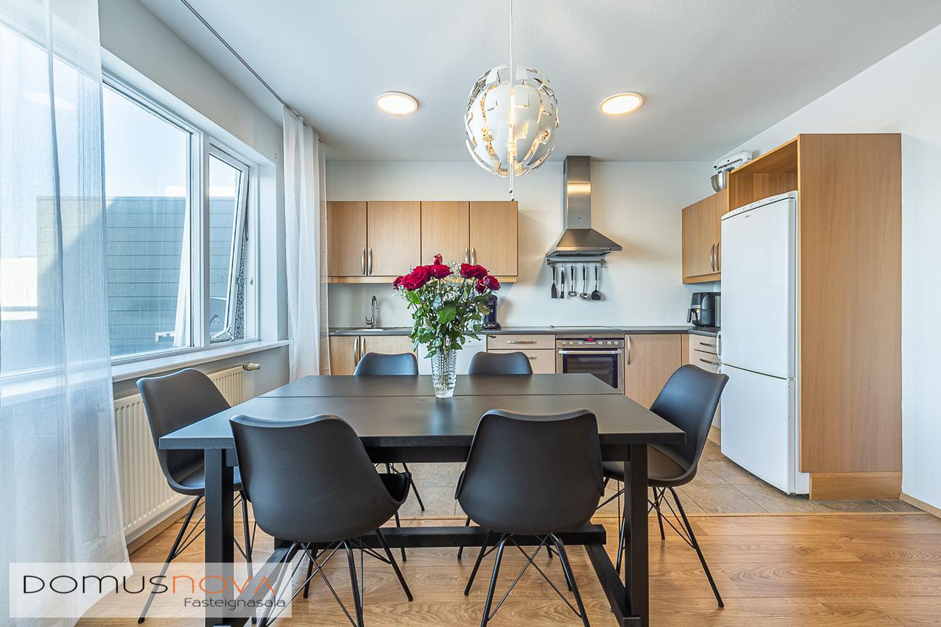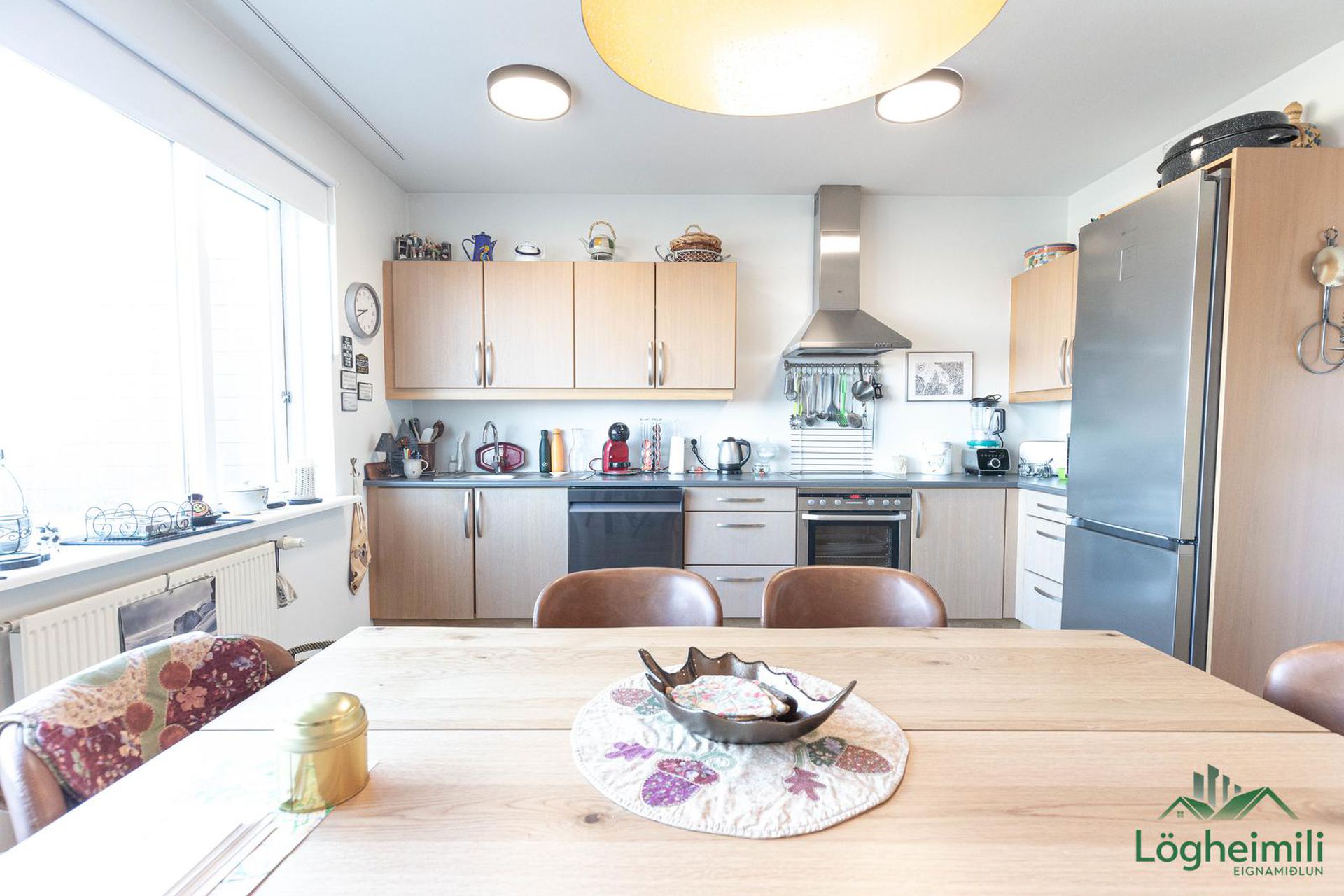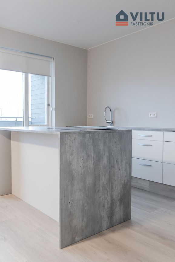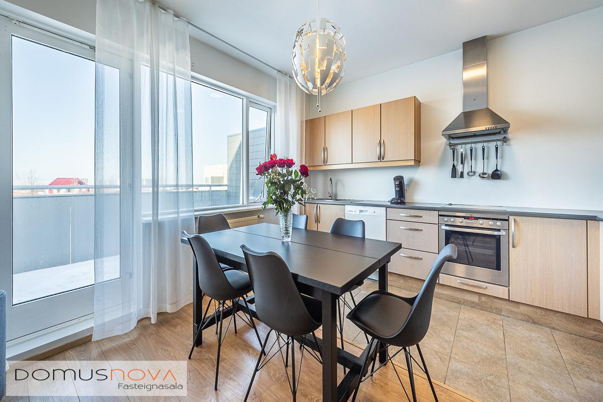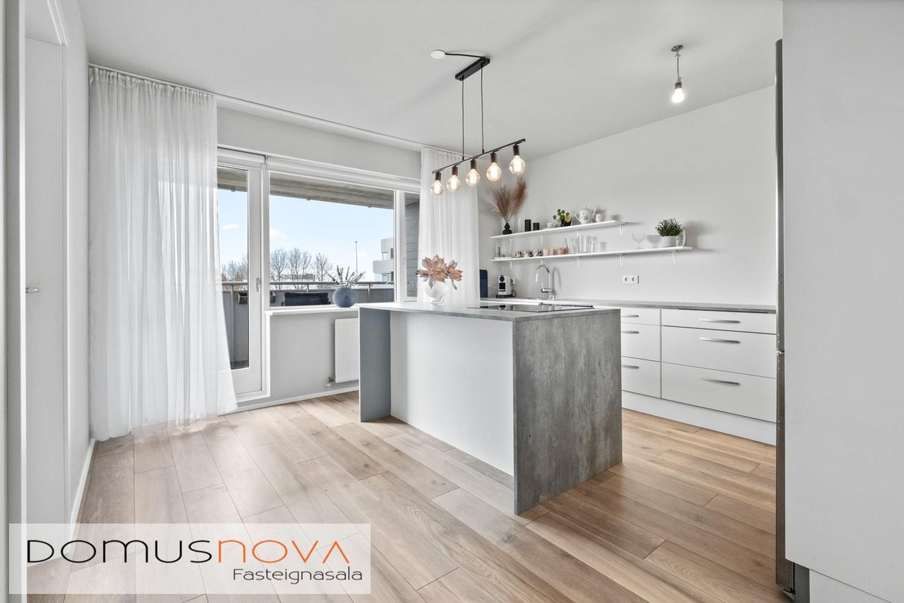 Vel skipulagt eldhús með hvítmálaðri innréttingu, ofni í vinnuhæð. Endurnýjuð borðplata og 'eldunareyja' með keramik helluborði (2021). Parket á gólfi. Útgangur á svalir með timburflísalegu svalagólfi.