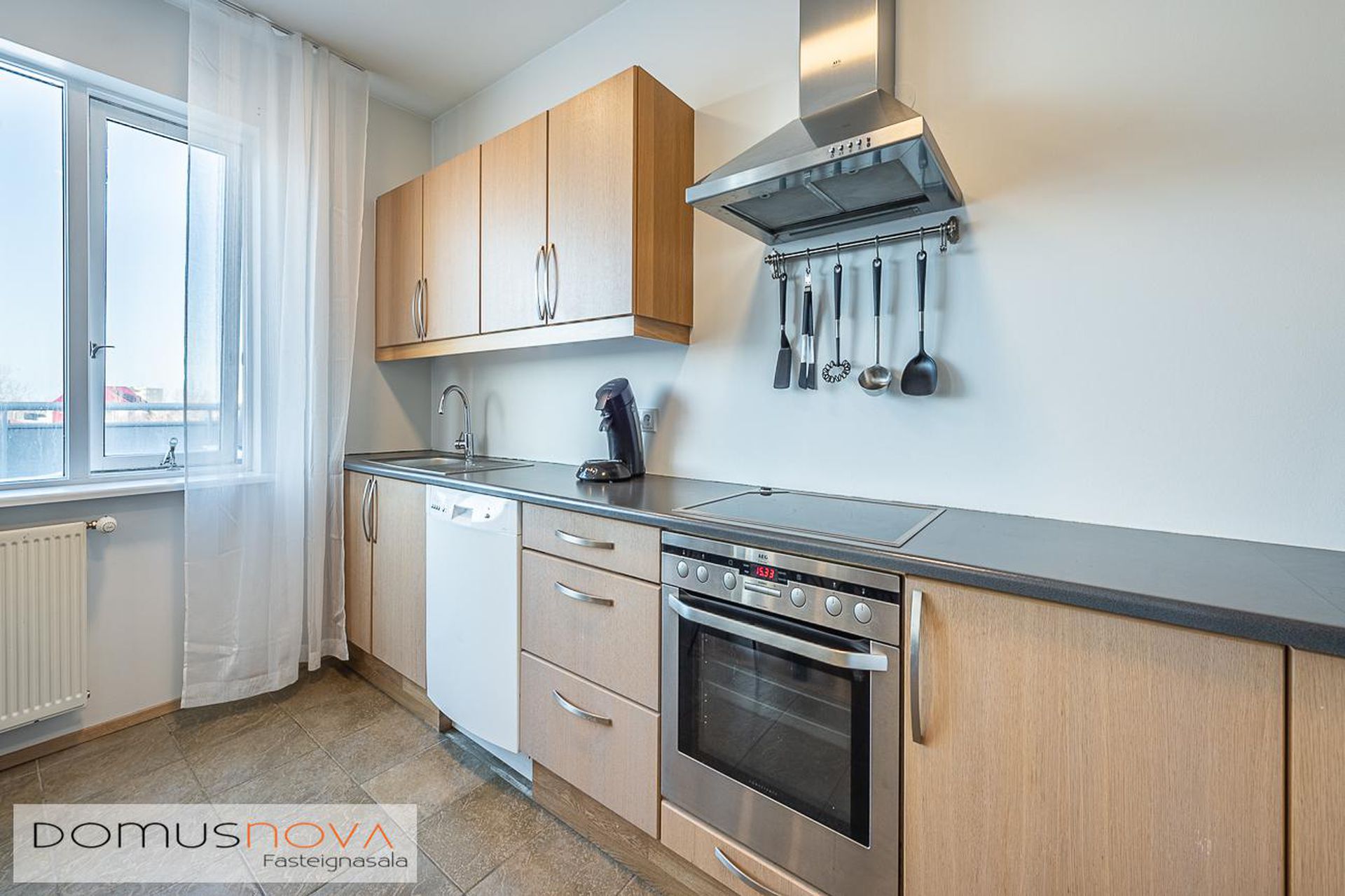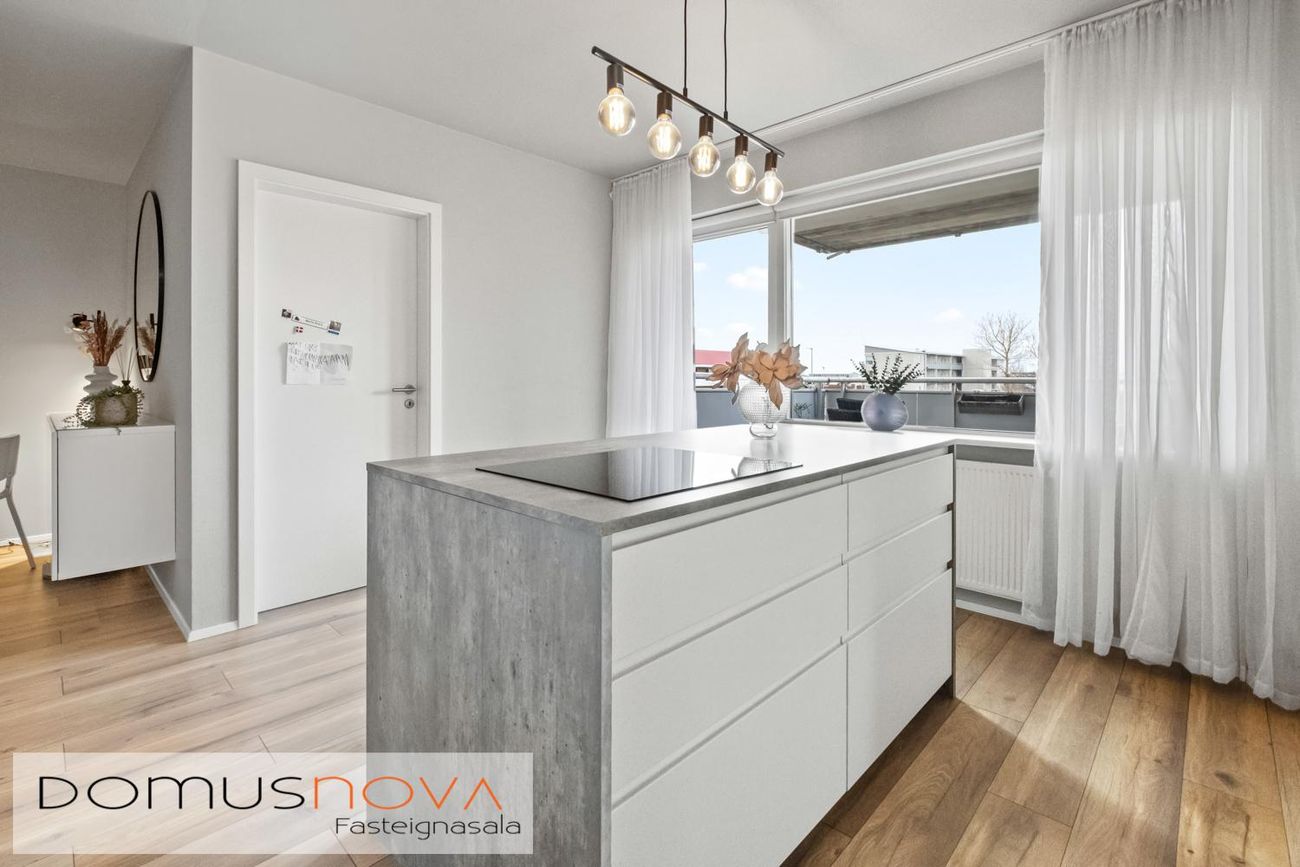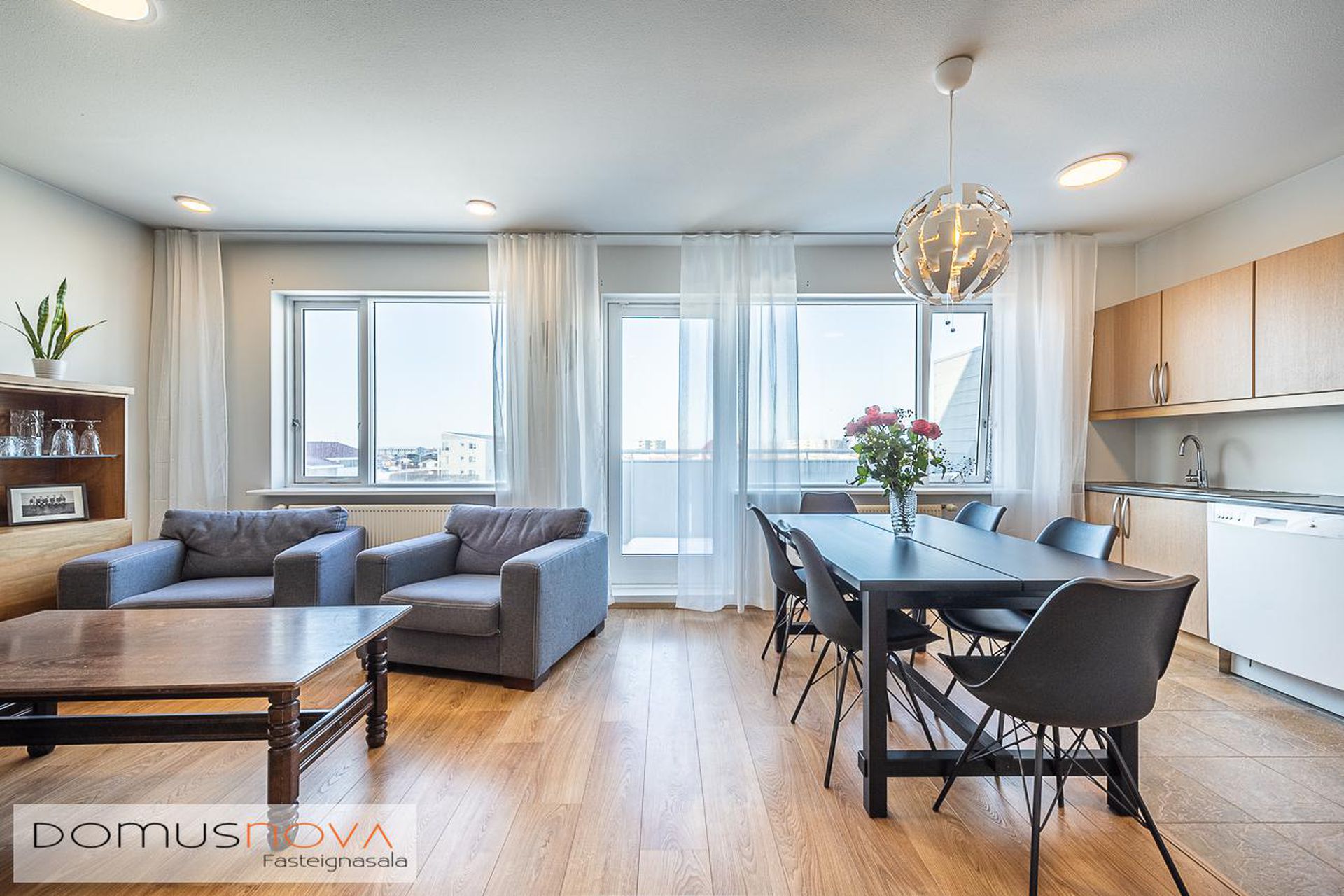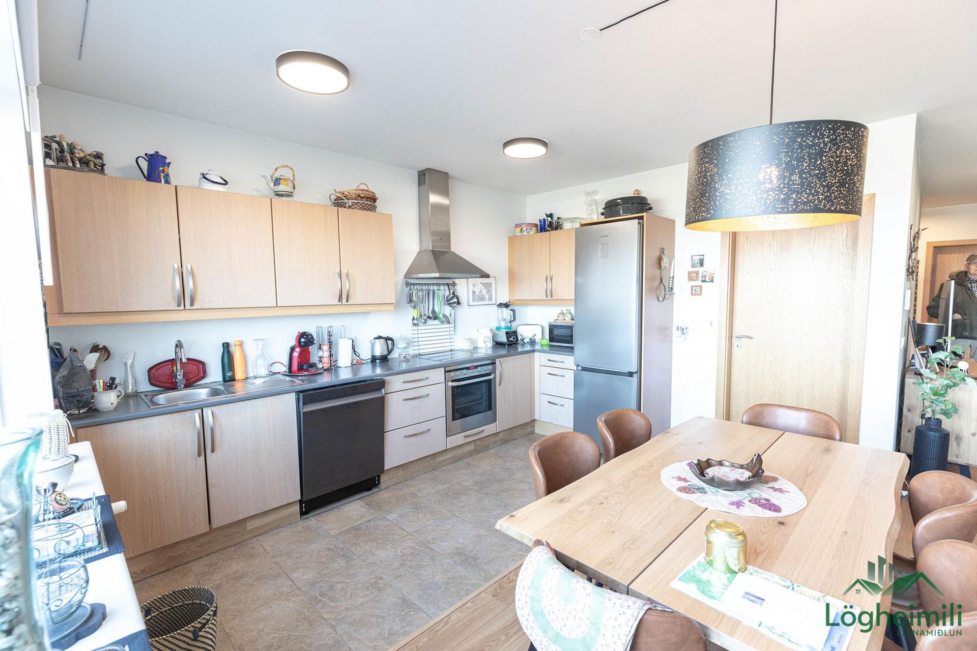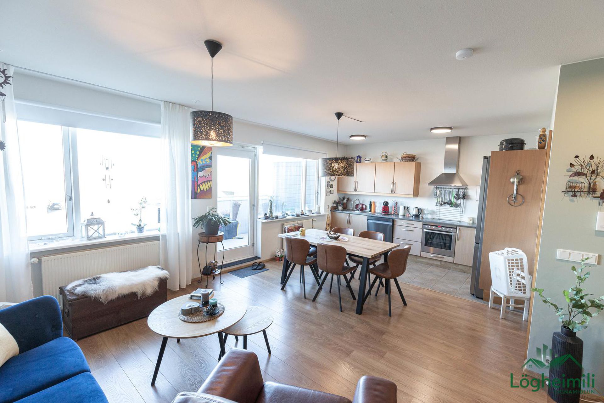 Vel skipulagt eldhús með hvítmálaðri innréttingu, ofni í vinnuhæð. Endurnýjuð borðplata og 'eldunareyja' með keramik helluborði (2021). Parket á gólfi. Útgangur á svalir með timburflísalegu svalagólfi.