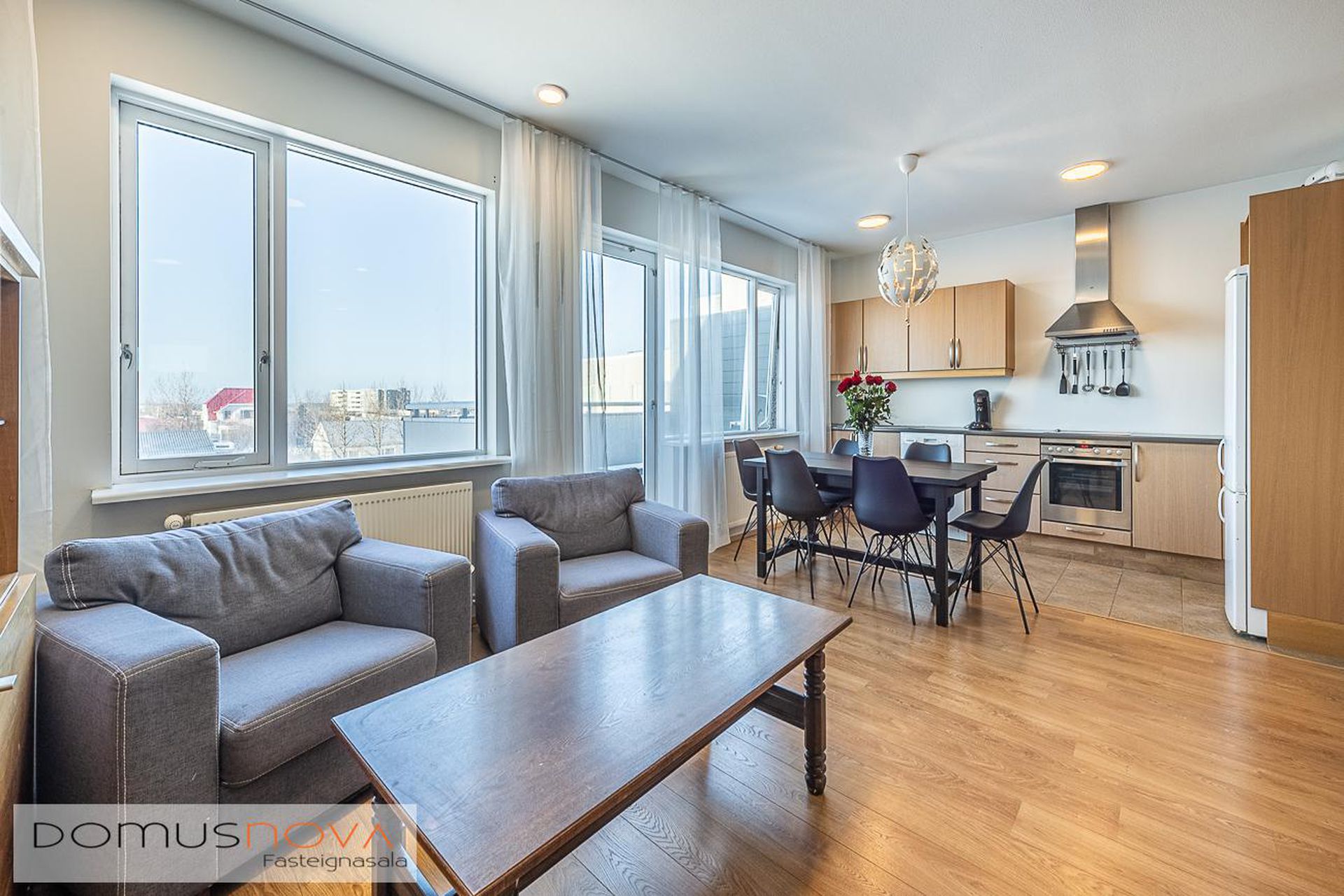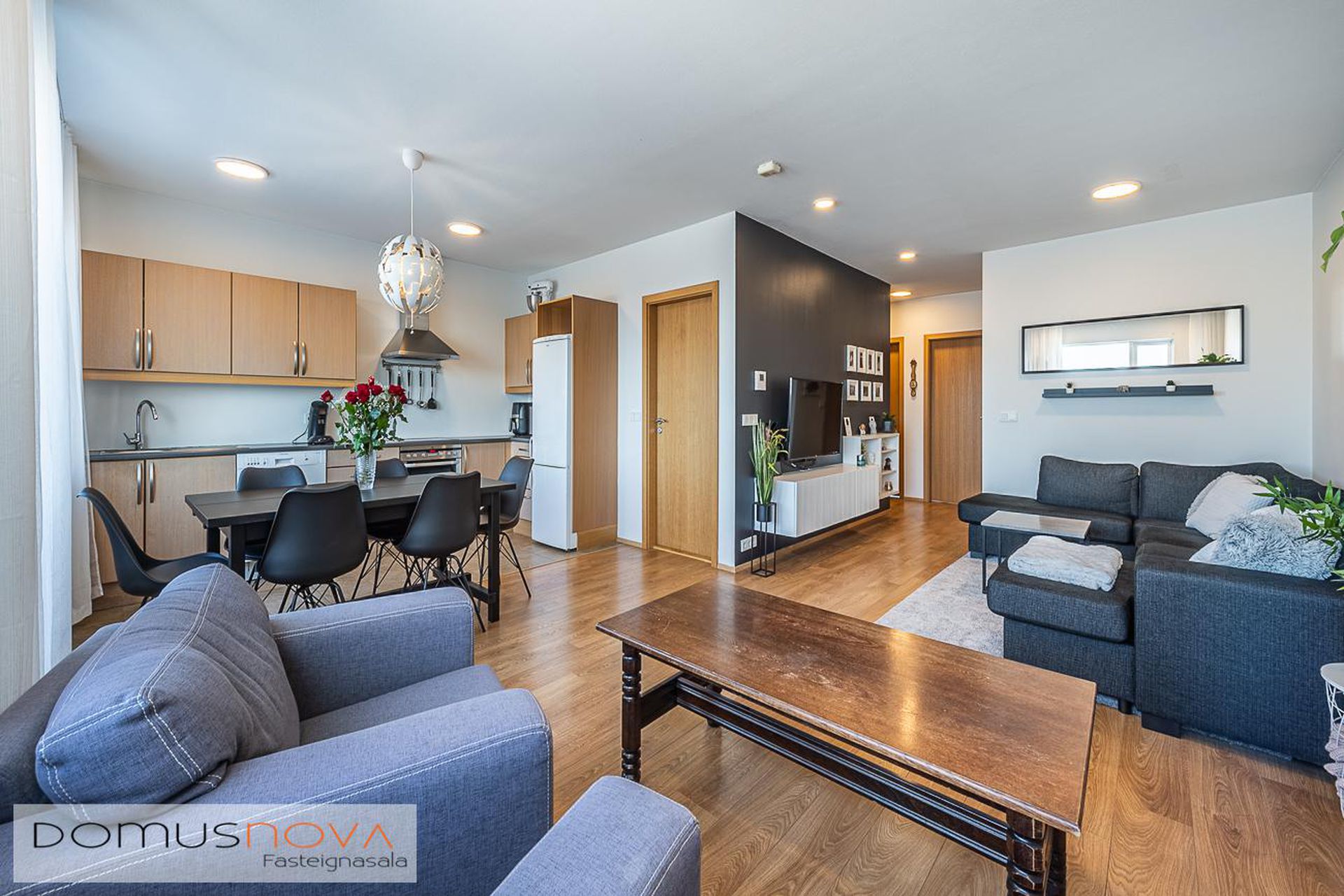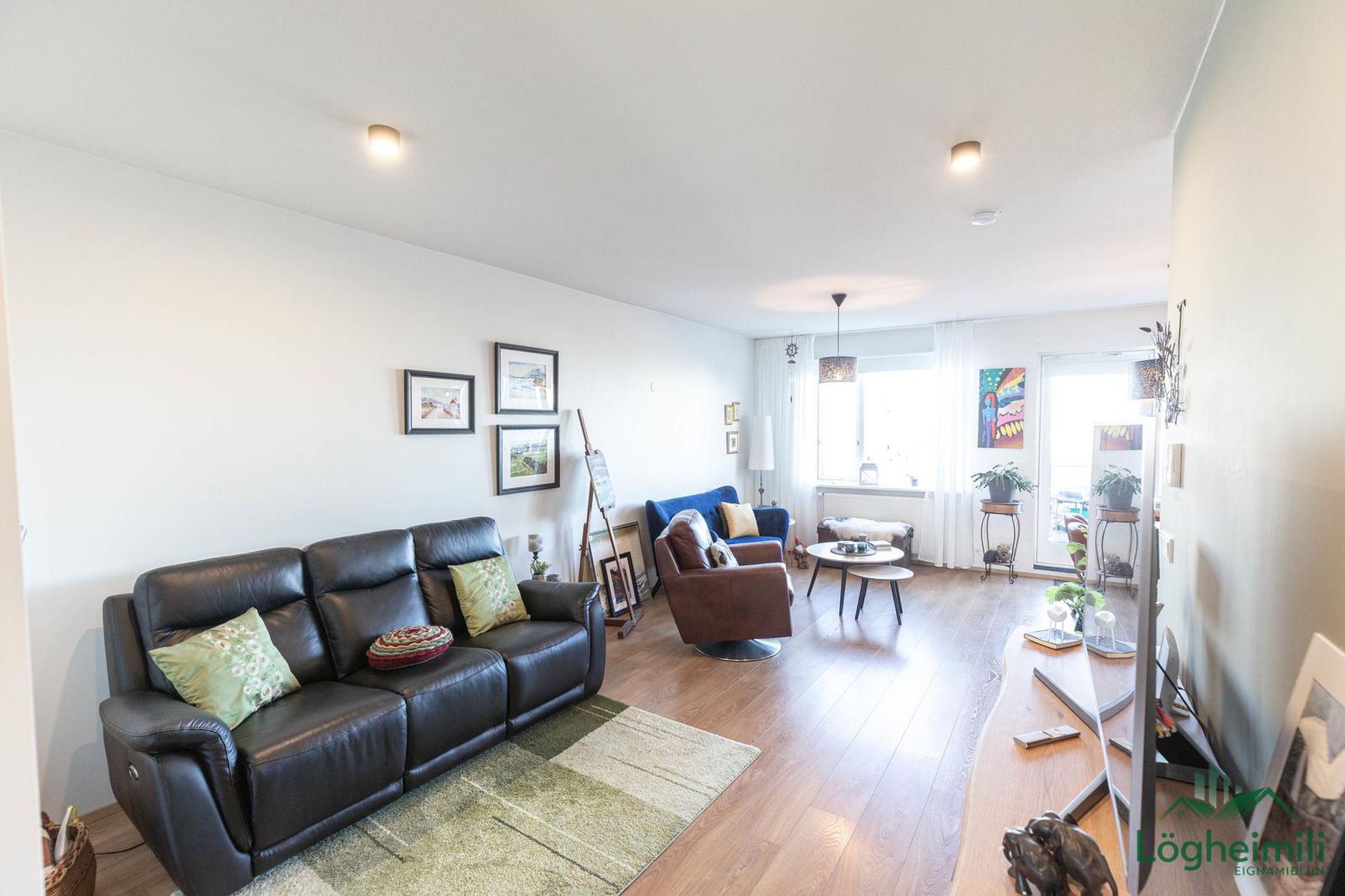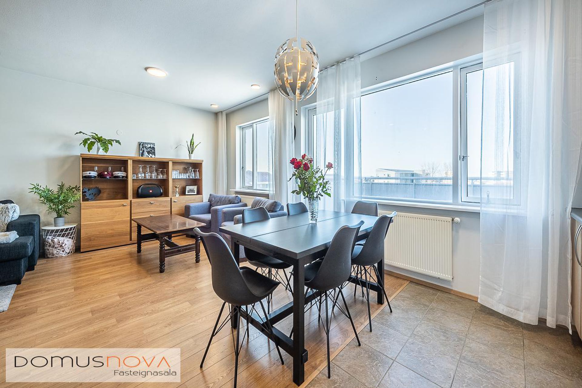 Vel skipulagt eldhús með hvítmálaðri innréttingu, ofni í vinnuhæð. Endurnýjuð borðplata og 'eldunareyja' með keramik helluborði (2021). Parket á gólfi. Útgangur á svalir með timburflísalegu svalagólfi.