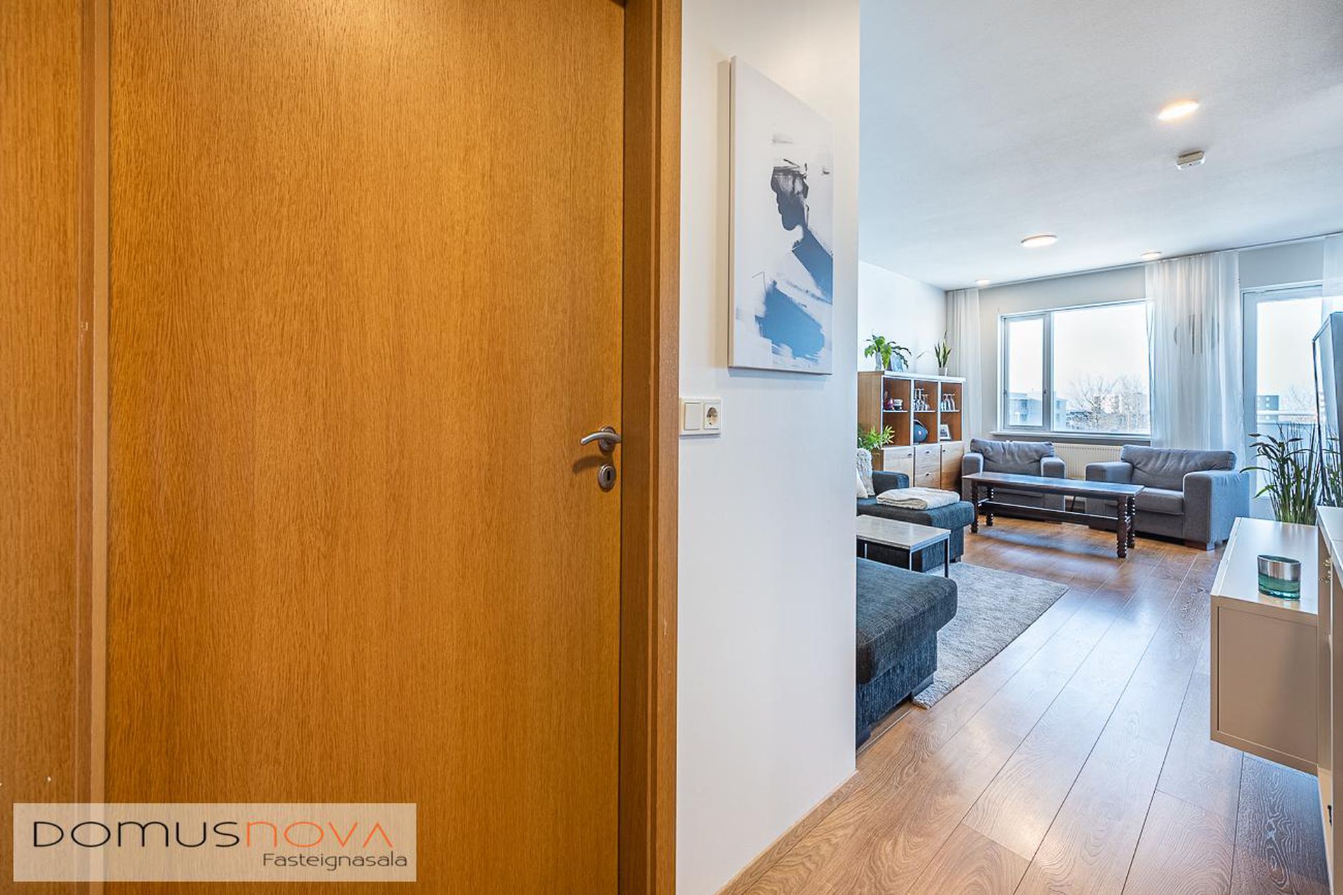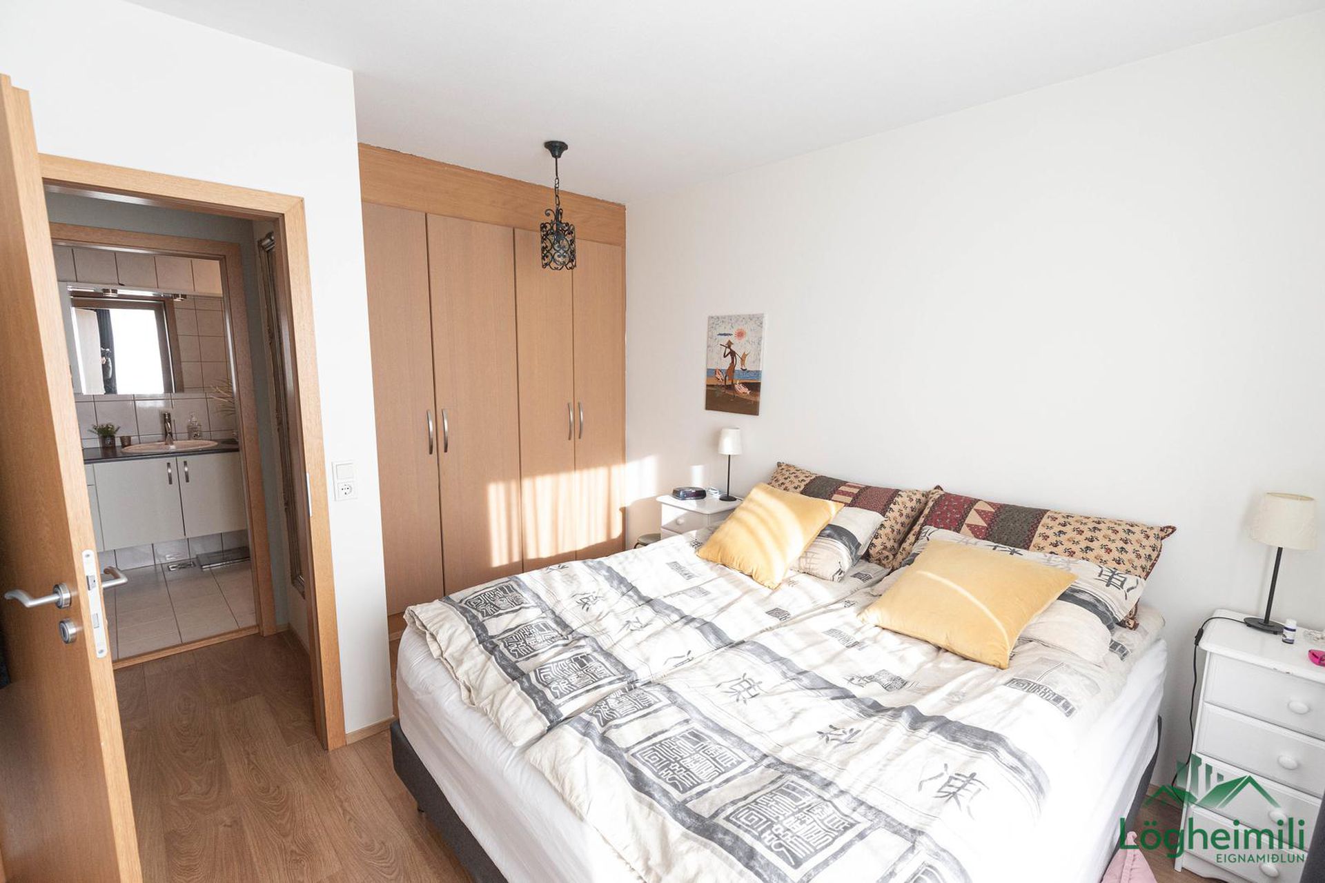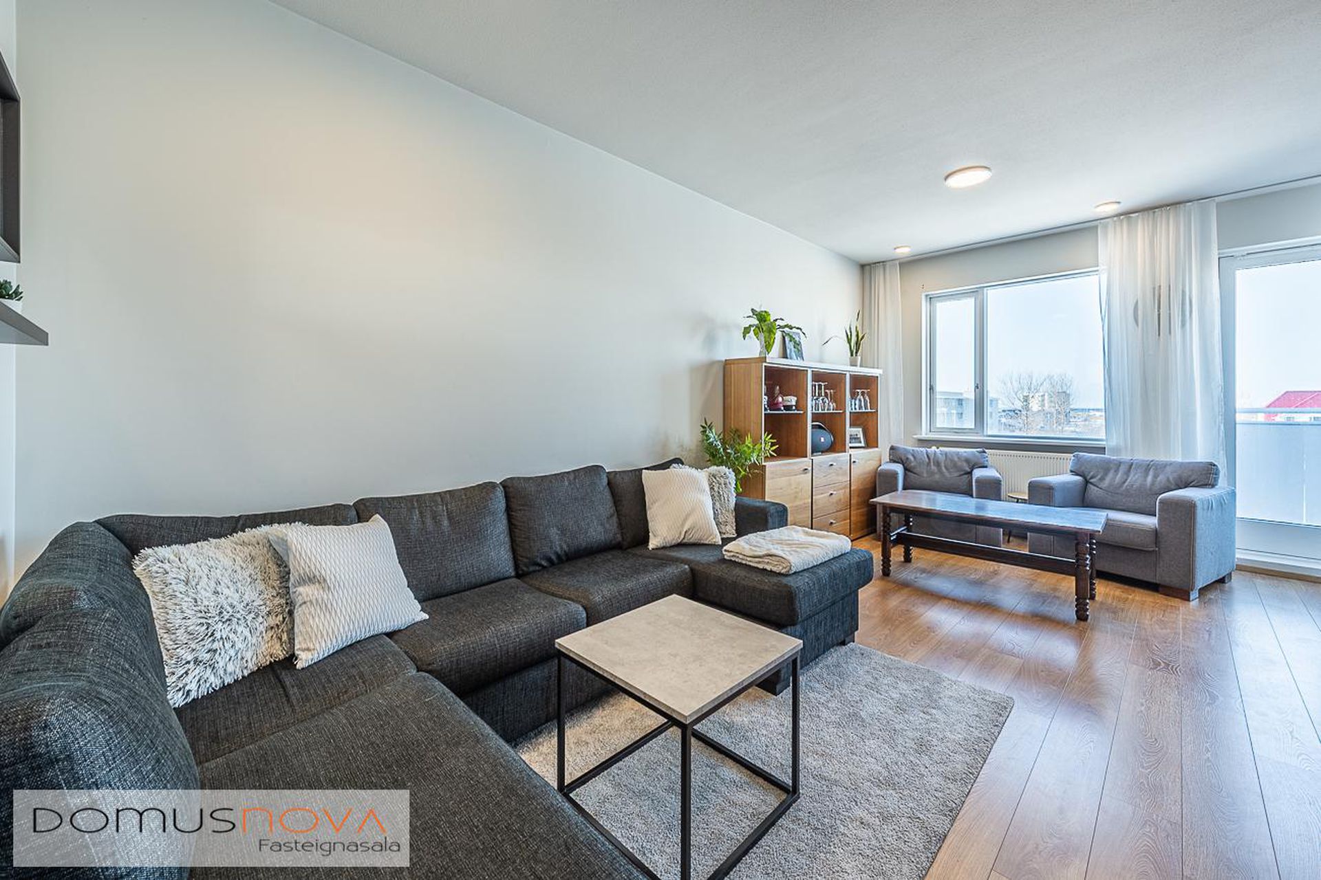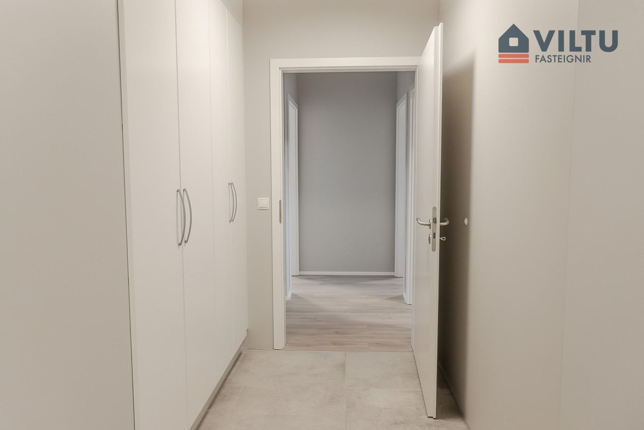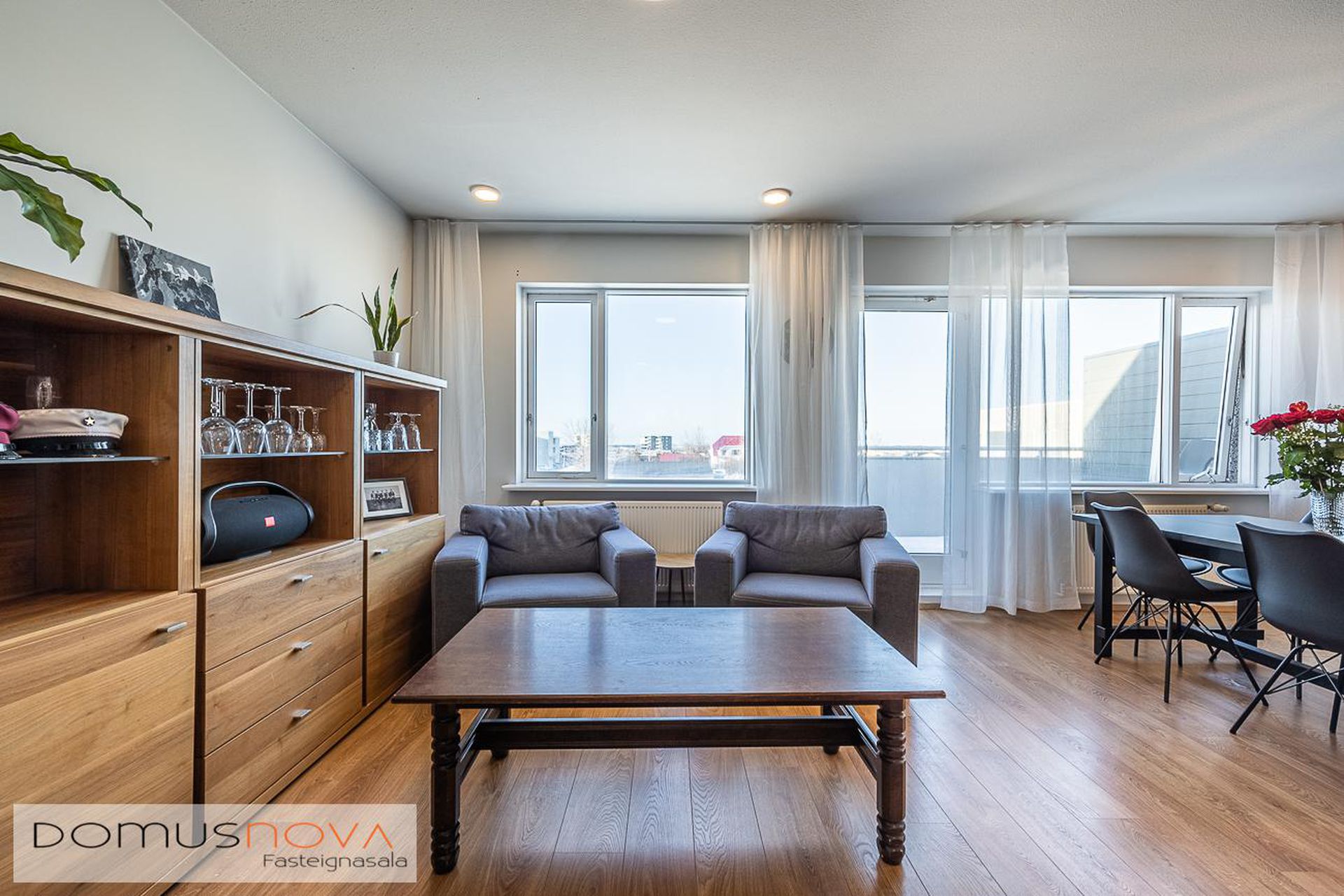 Vel skipulagt eldhús með hvítmálaðri innréttingu, ofni í vinnuhæð. Endurnýjuð borðplata og 'eldunareyja' með keramik helluborði (2021). Parket á gólfi. Útgangur á svalir með timburflísalegu svalagólfi.