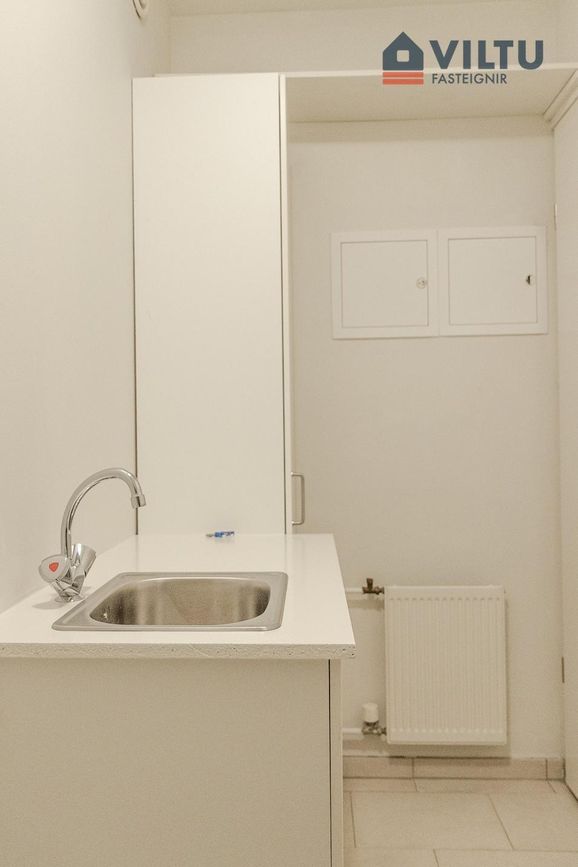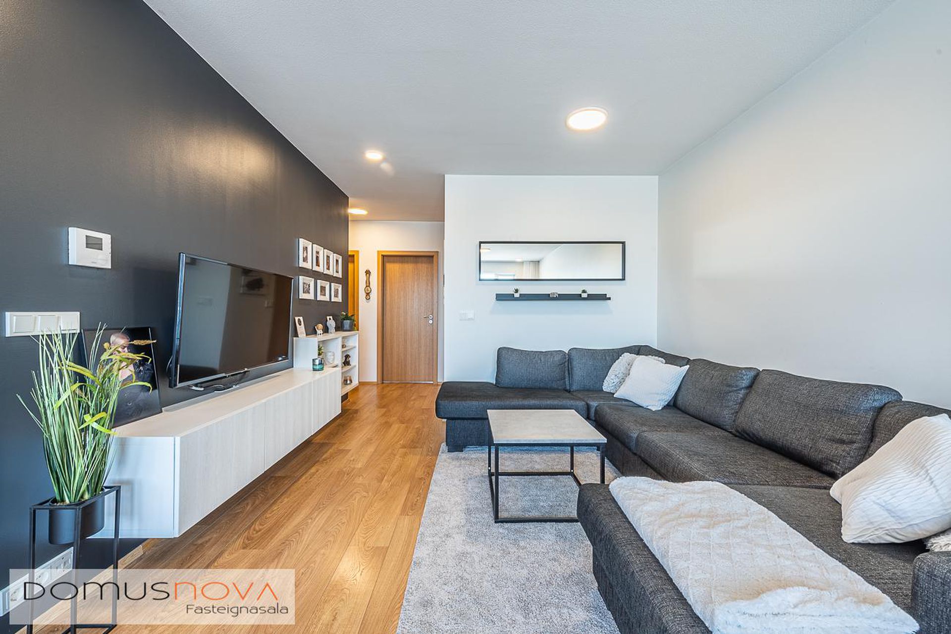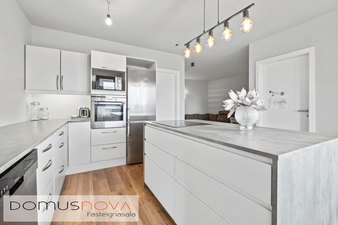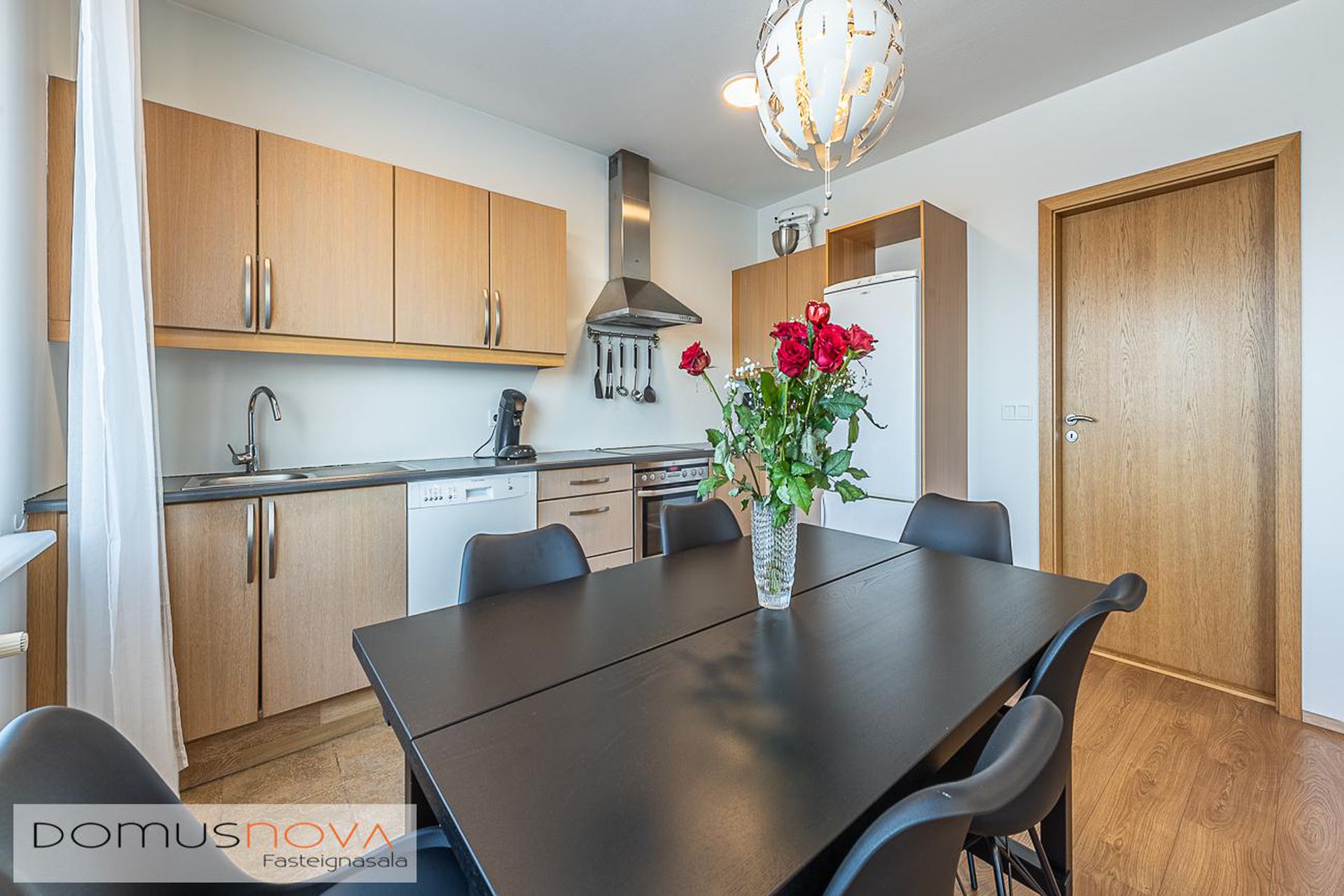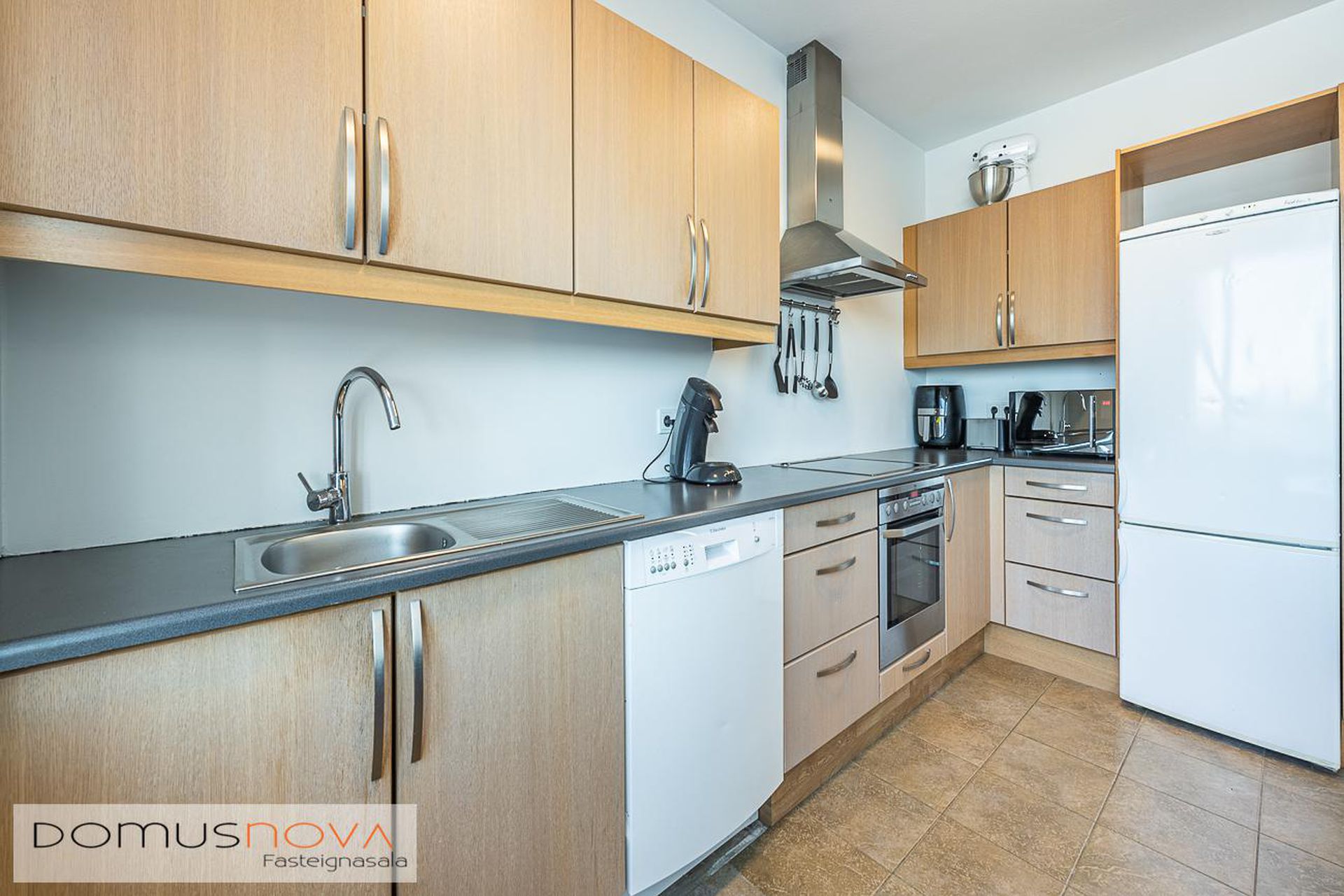 Vel skipulagt eldhús með hvítmálaðri innréttingu, ofni í vinnuhæð. Endurnýjuð borðplata og 'eldunareyja' með keramik helluborði (2021). Parket á gólfi. Útgangur á svalir með timburflísalegu svalagólfi.