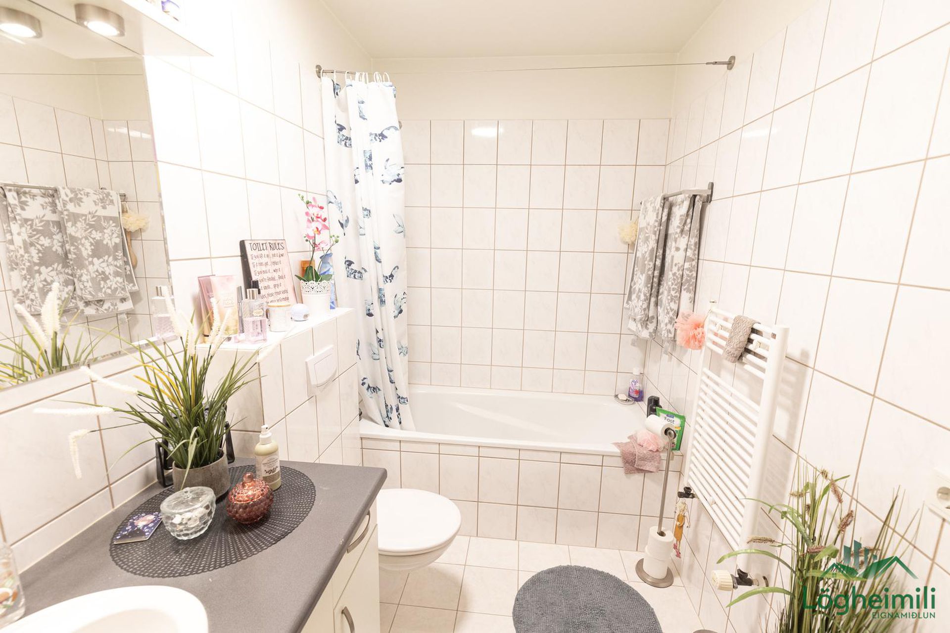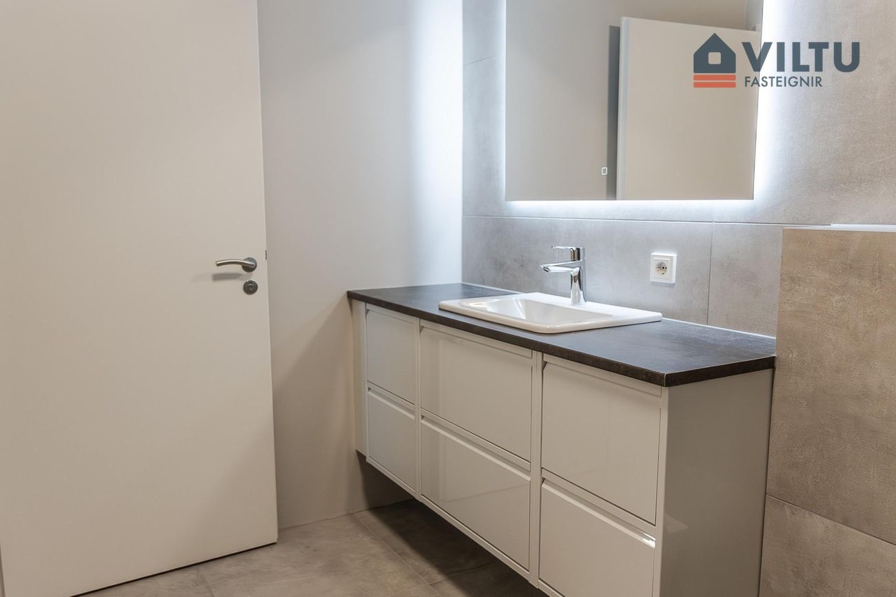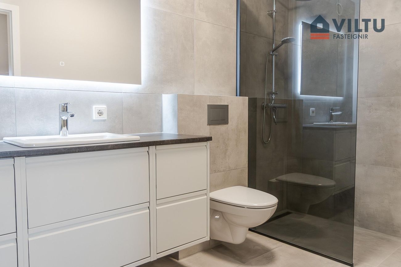 Baðherbergi allt nýuppgert (2026) með hvítri skáparinnréttingu, walk-in sturtu, upphengt salerni, handklæðaofni. Flísar á gólfi og hluta veggja.