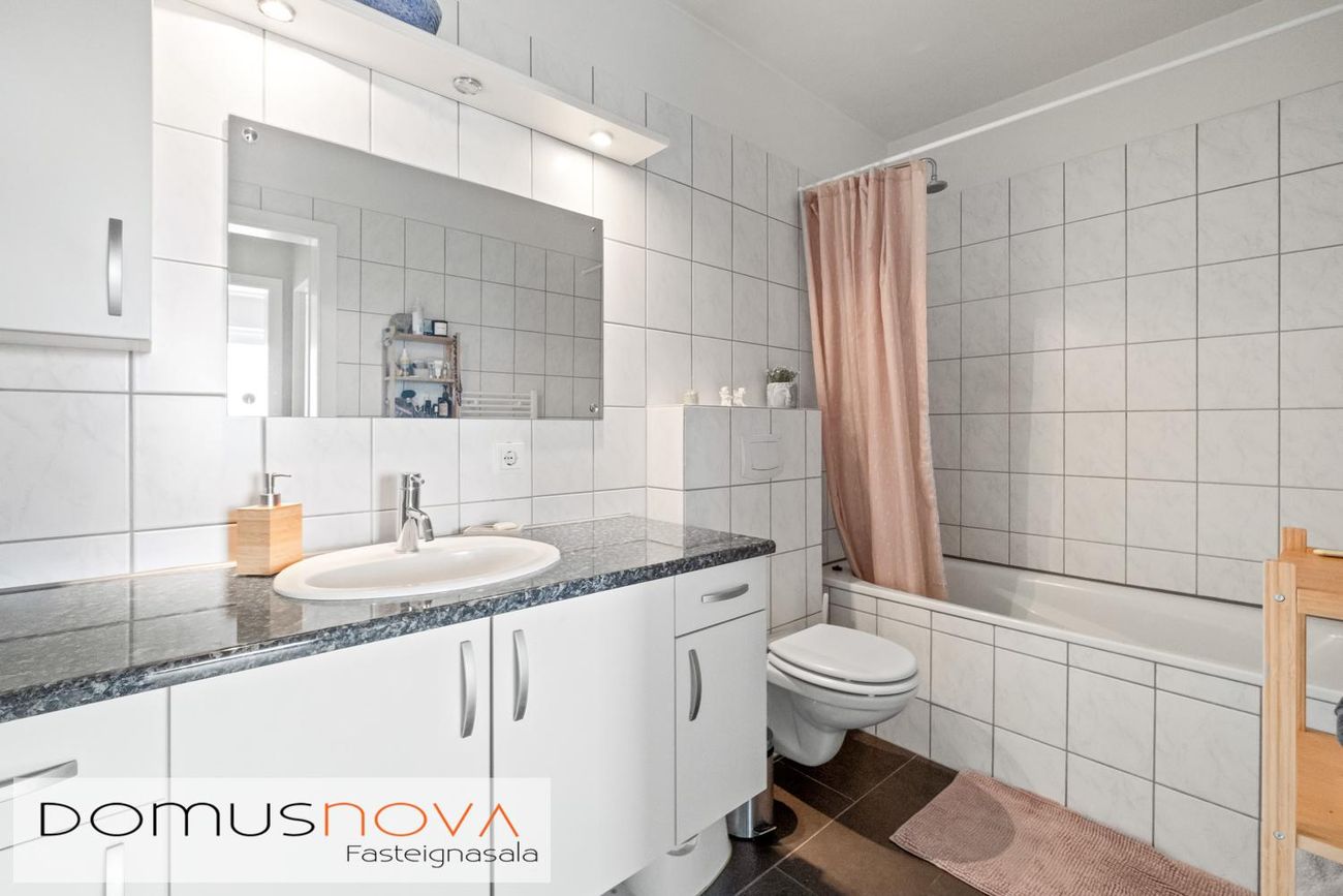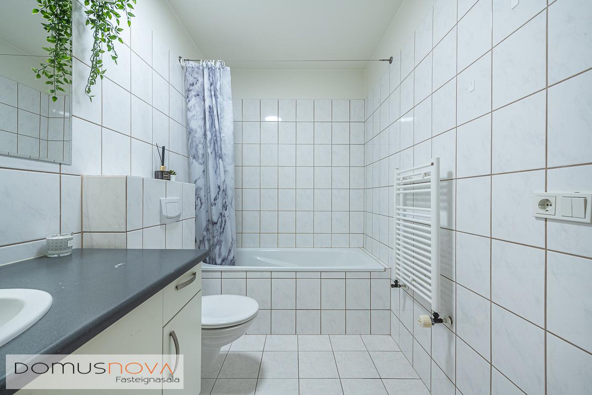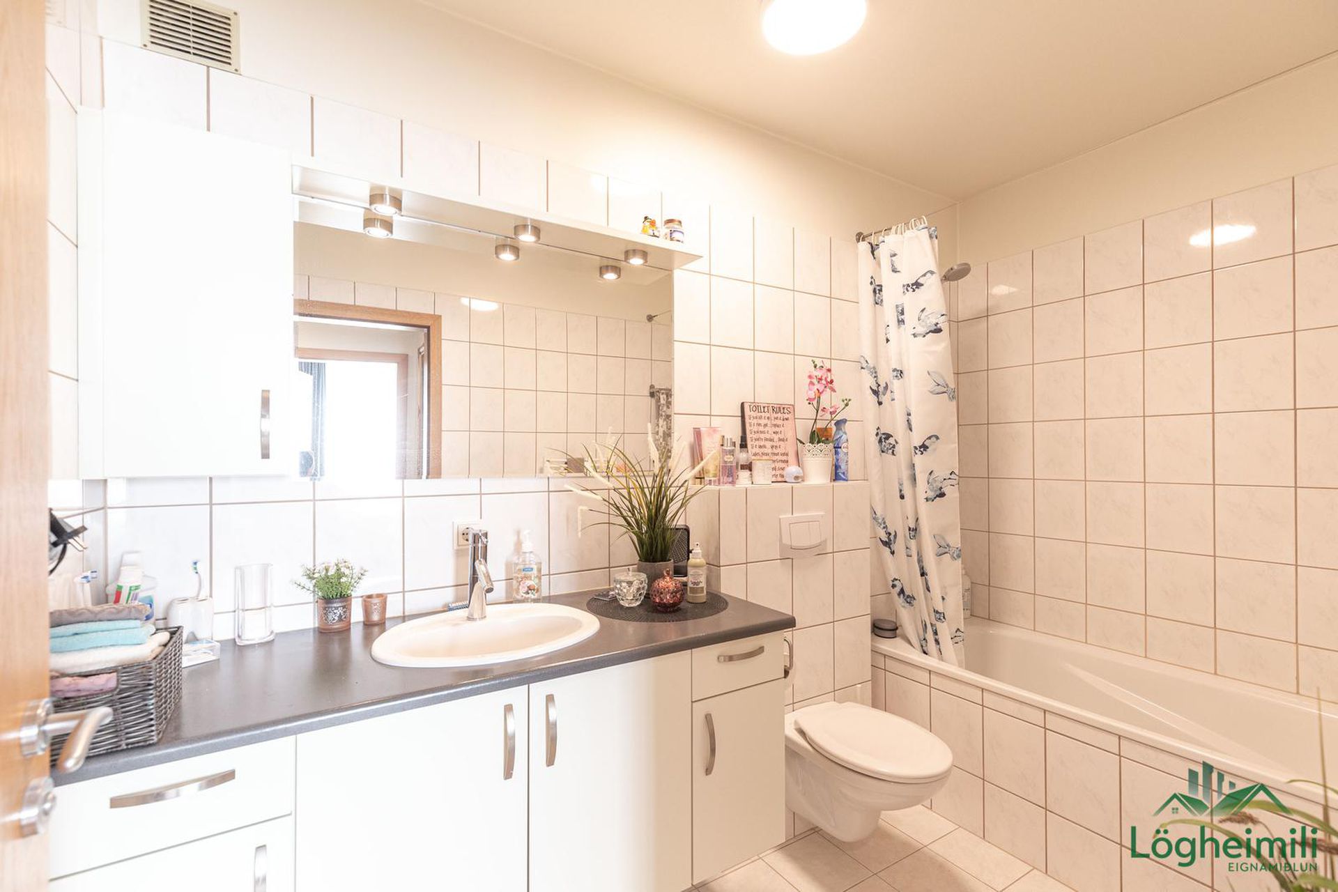 Baðherbergi allt nýuppgert (2026) með hvítri skáparinnréttingu, walk-in sturtu, upphengt salerni, handklæðaofni. Flísar á gólfi og hluta veggja.