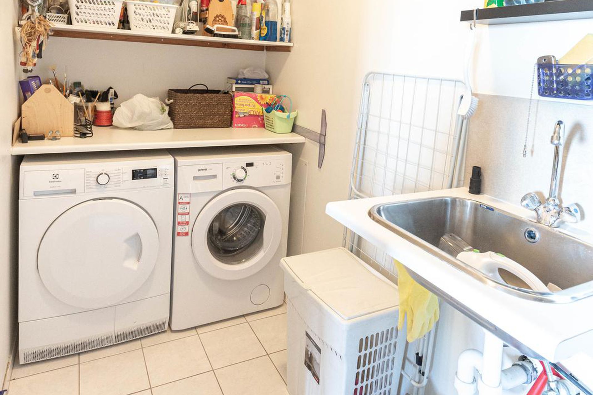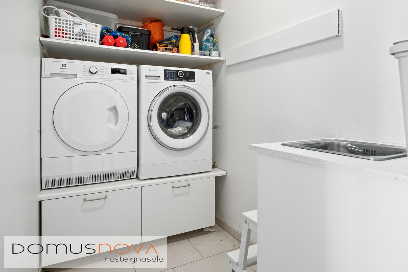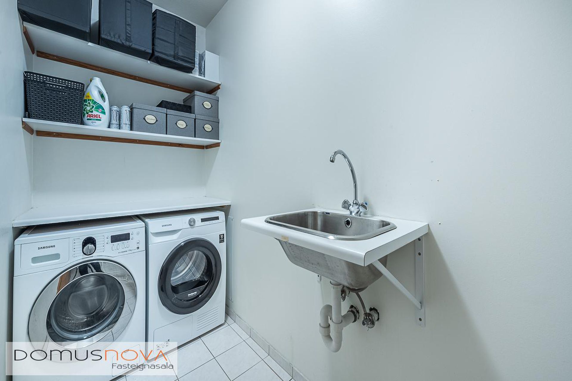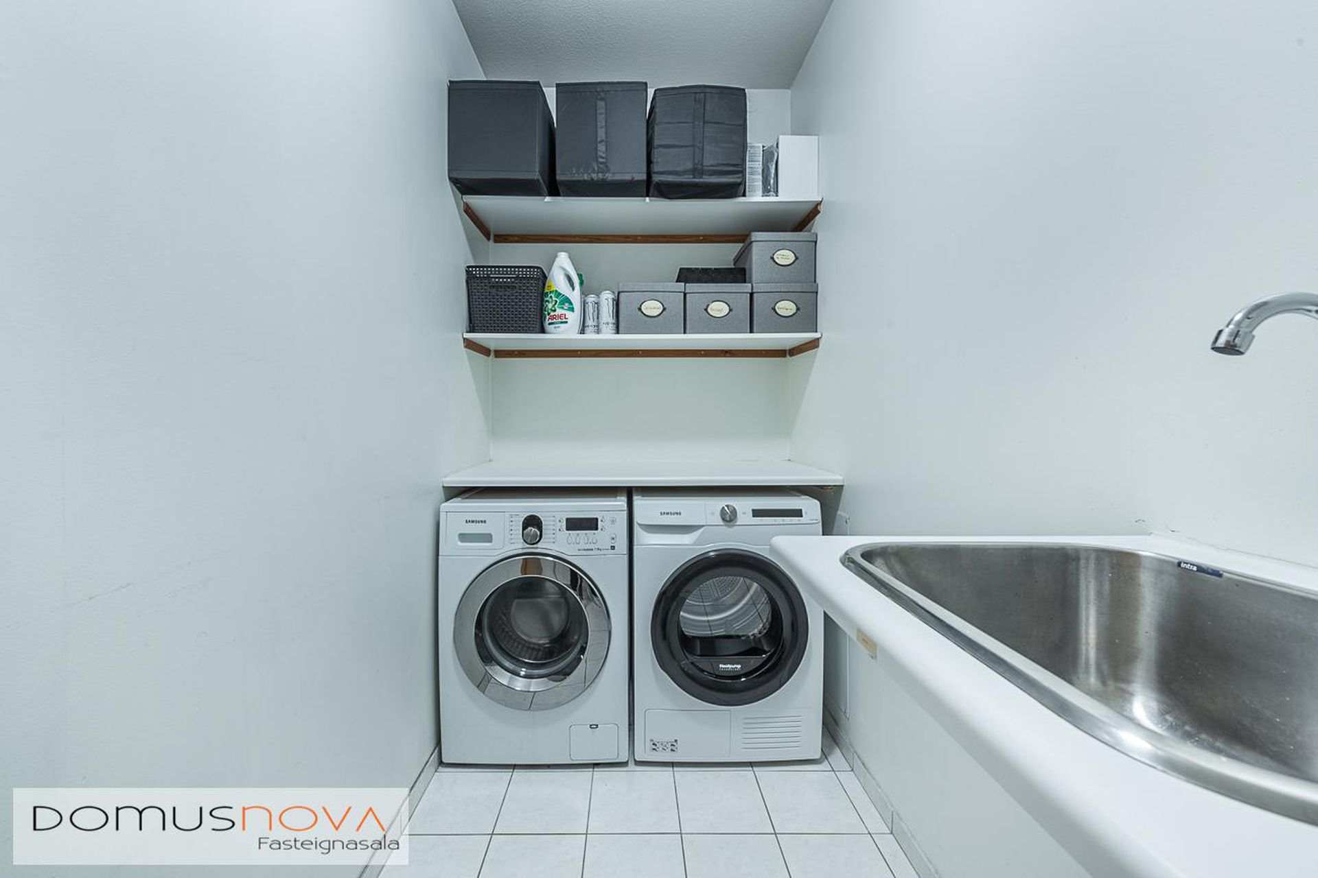 Sér þvottahús innan íbúðar við hlið eldhúss með skúffum, hillum, skáp og vaski.