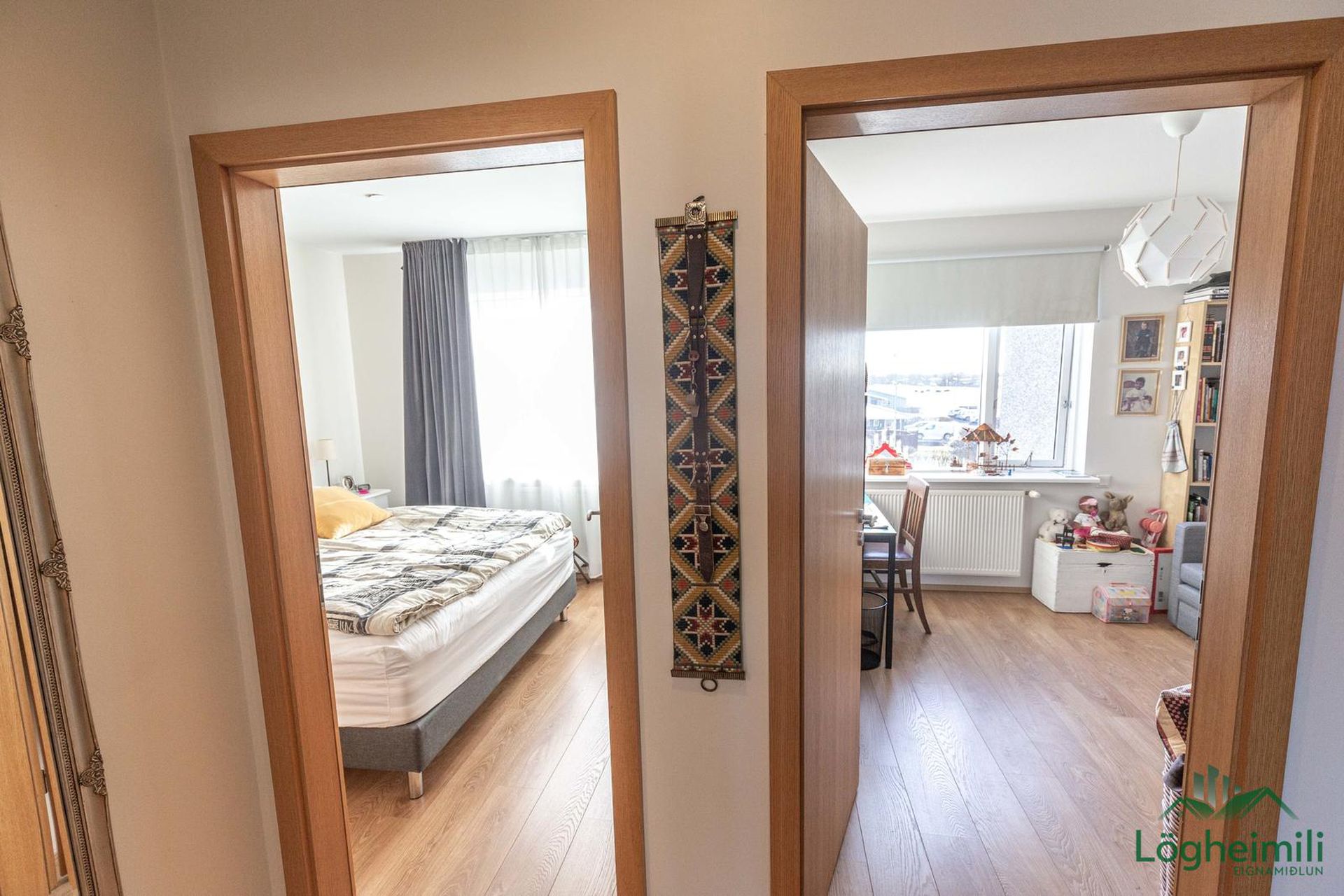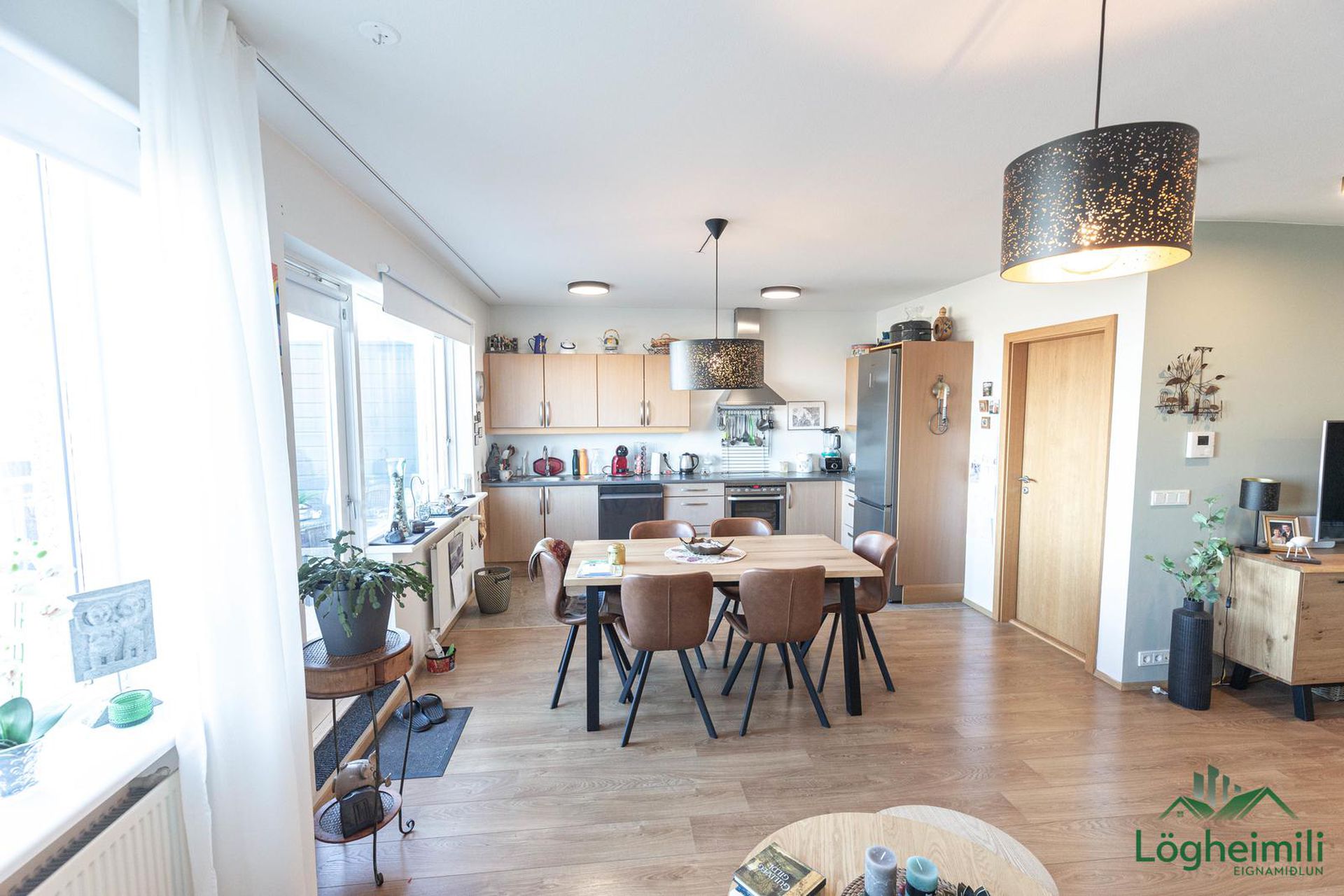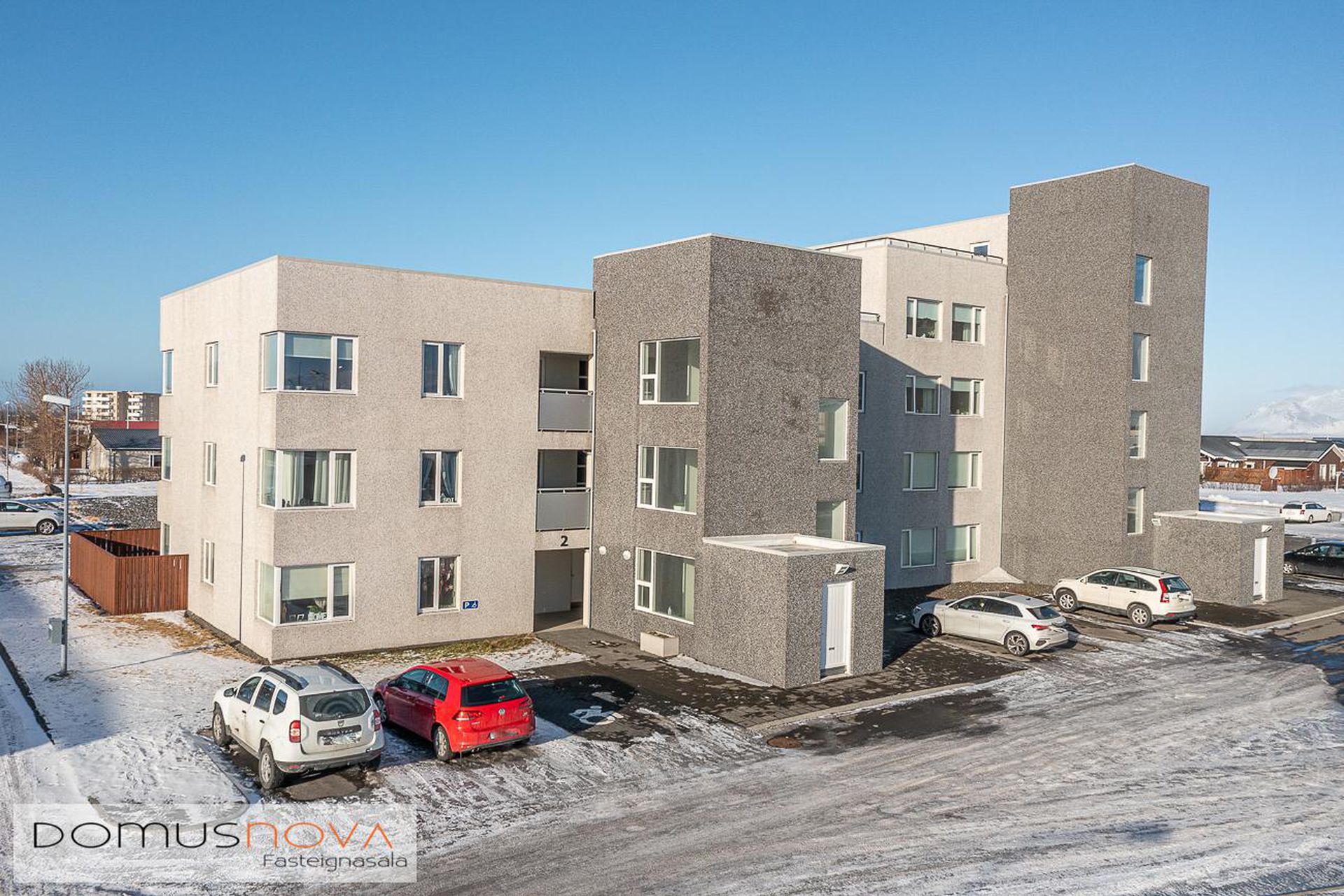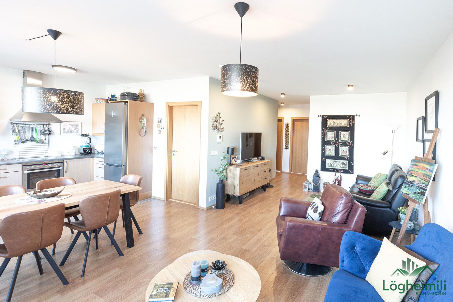Íbúðin skiptist í forstofu, eldhús, stofu með útgang út á svalir, hjónaherbergi, barnaherbergi, baðherbergi og sér þvottahús innan íbúðar. Geymsla og hjóla/vagnageymsla á jarðhæð. Fjórar rafhleðslustöðvar á bílaplani.