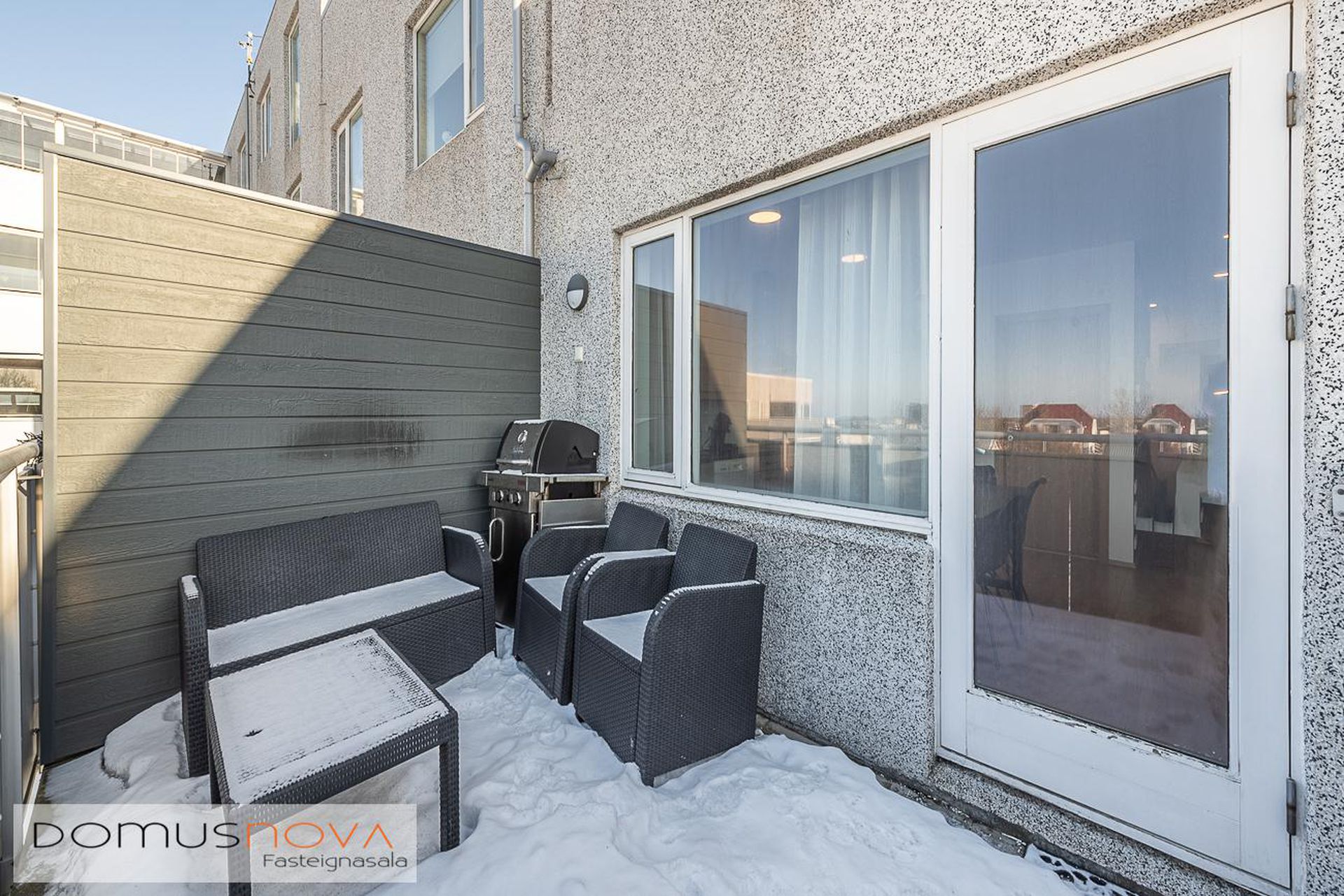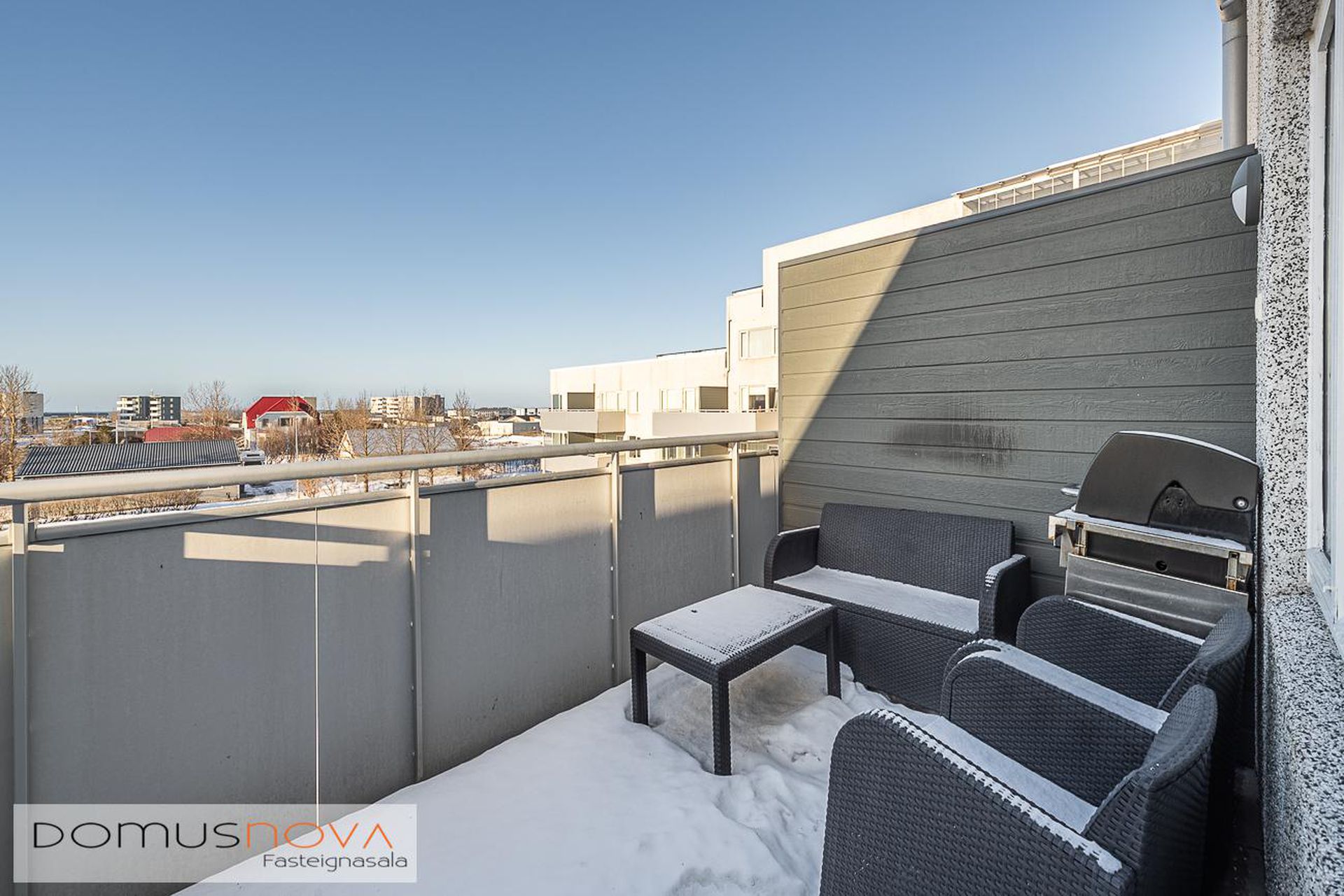 Svalir með timburflísum á svalagólfi. Útgangur úr eldhúsi.