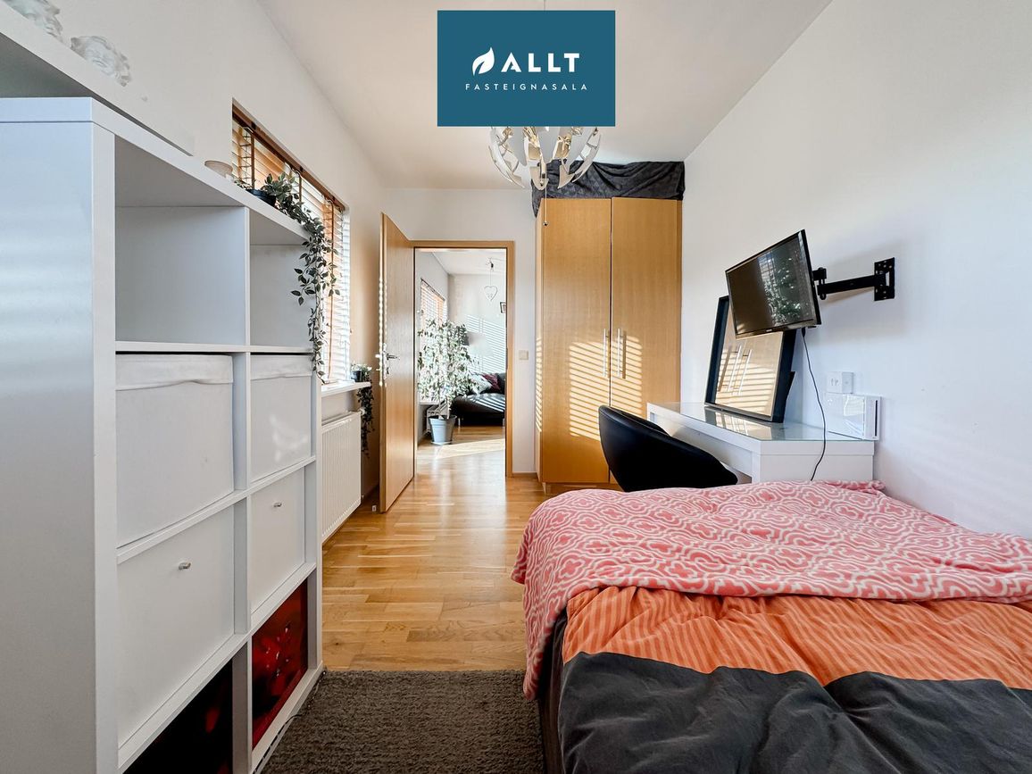Hjónaherbergi: Rúmgott með harðparket á gólfum og góðum fataskáp.