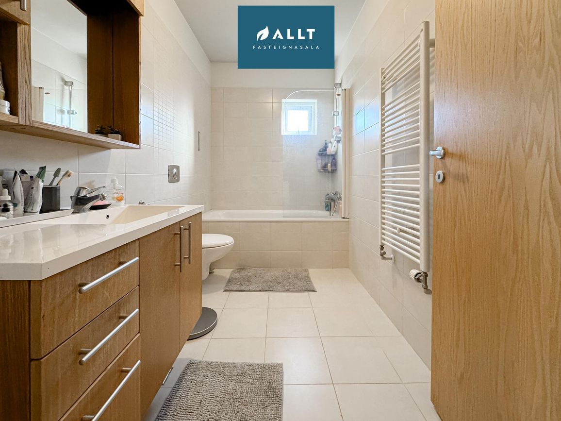 Baðherbergi: Ljósar flísar í hólf og gólf. Innrétting með eikar vaskaskáp og spegla skáp fyrir ofan. Baðkar með sturtu, upphengt salerni og handklæða ofn.