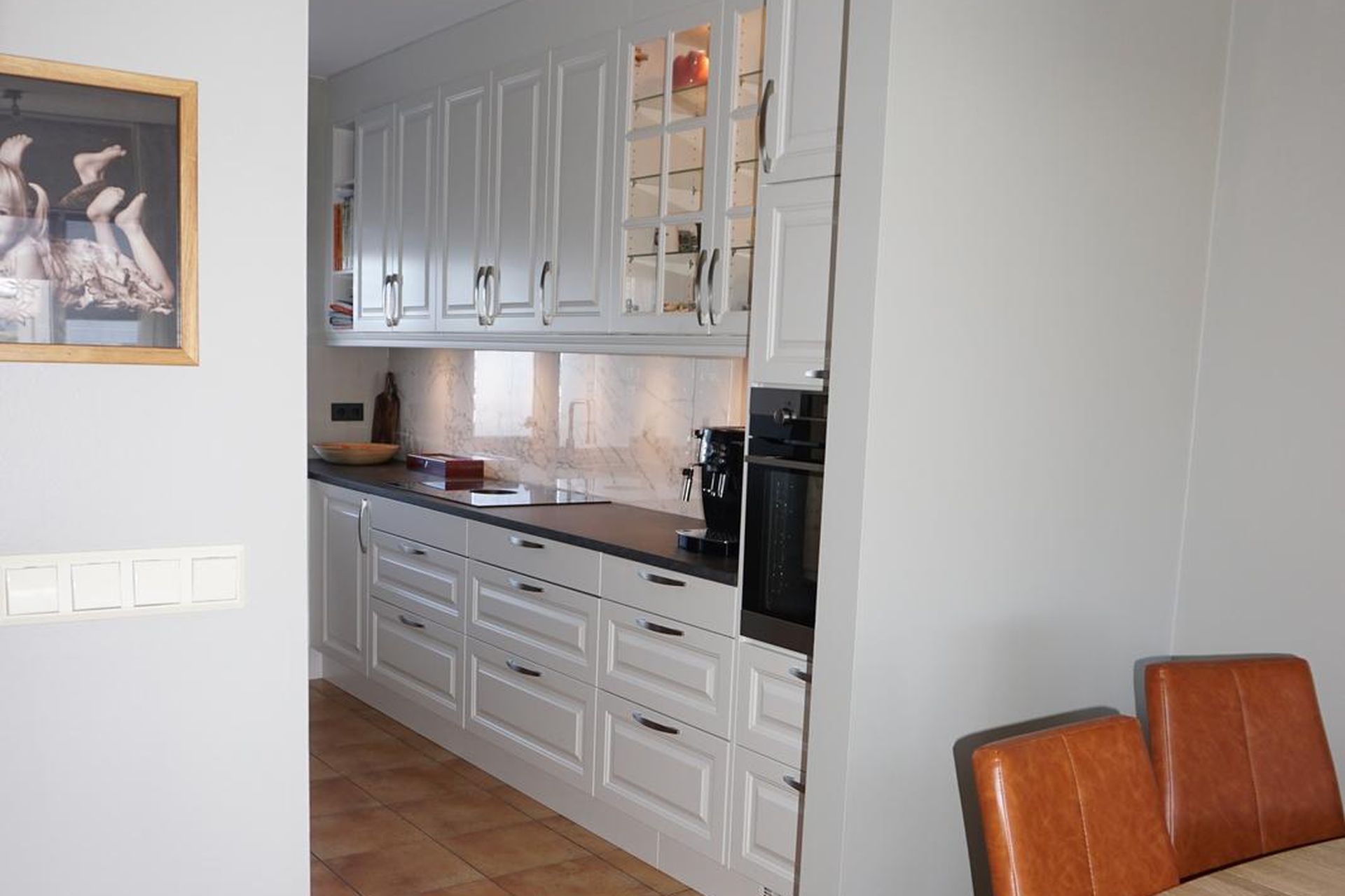 Eldhús: Eikar innrétting með dökkri borðplötu. Uppþvottavél og ísskápur fylgja.