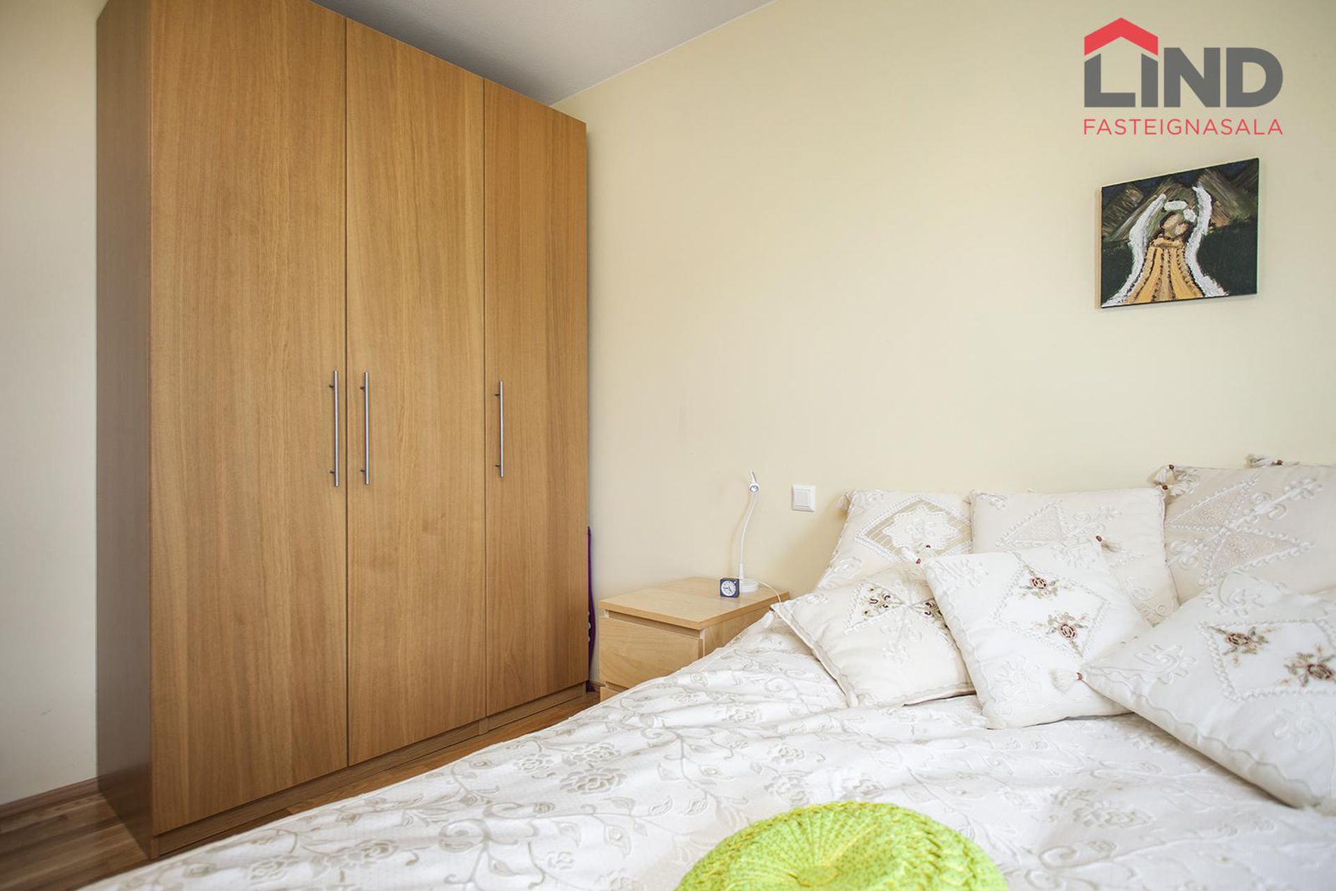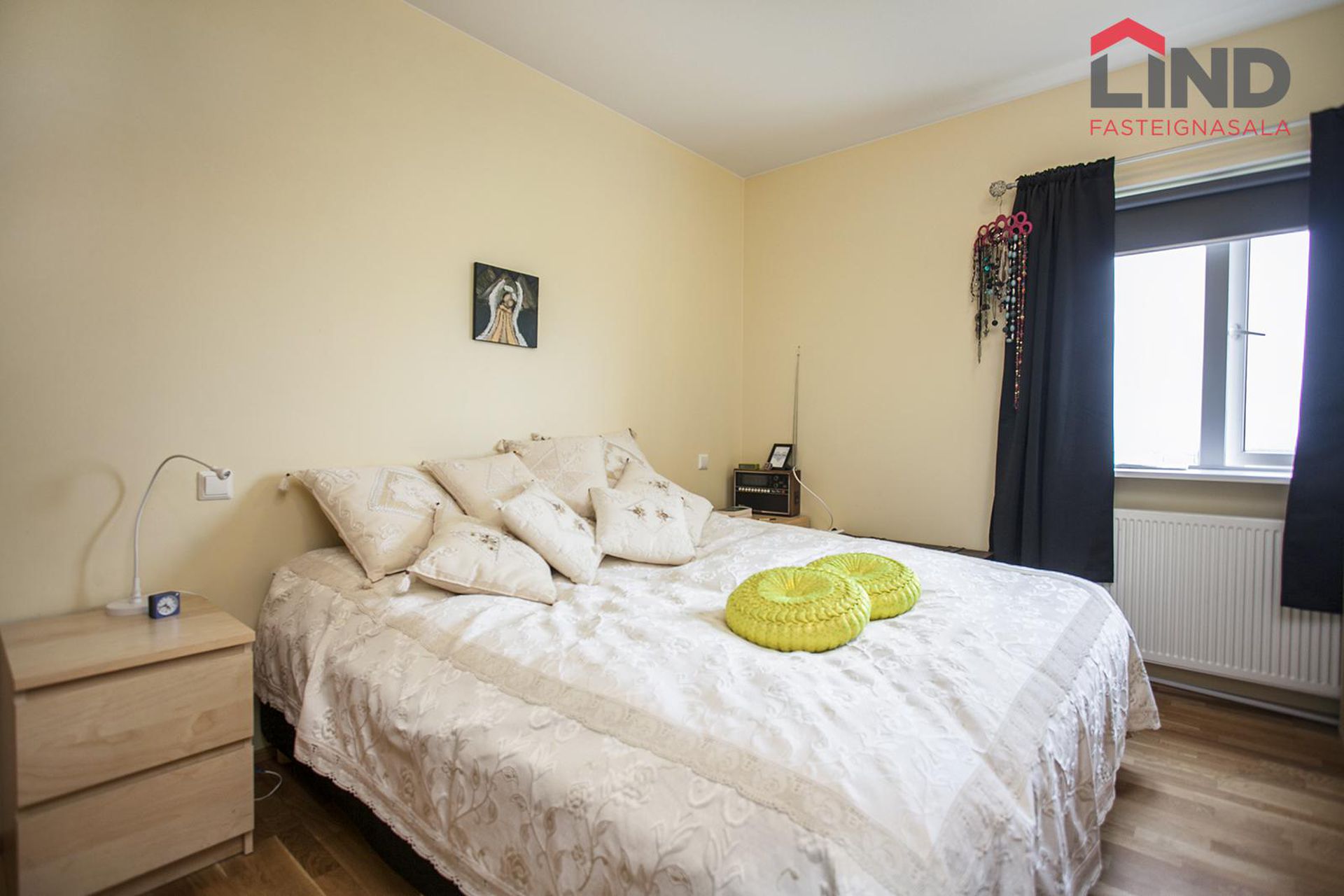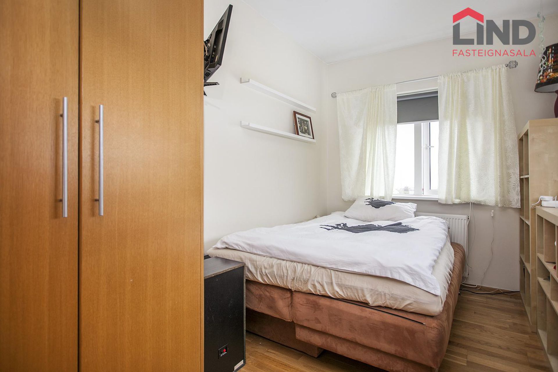 Hjónaherbergi: Rúmgott með harðparket á gólfum og góðum fataskáp.