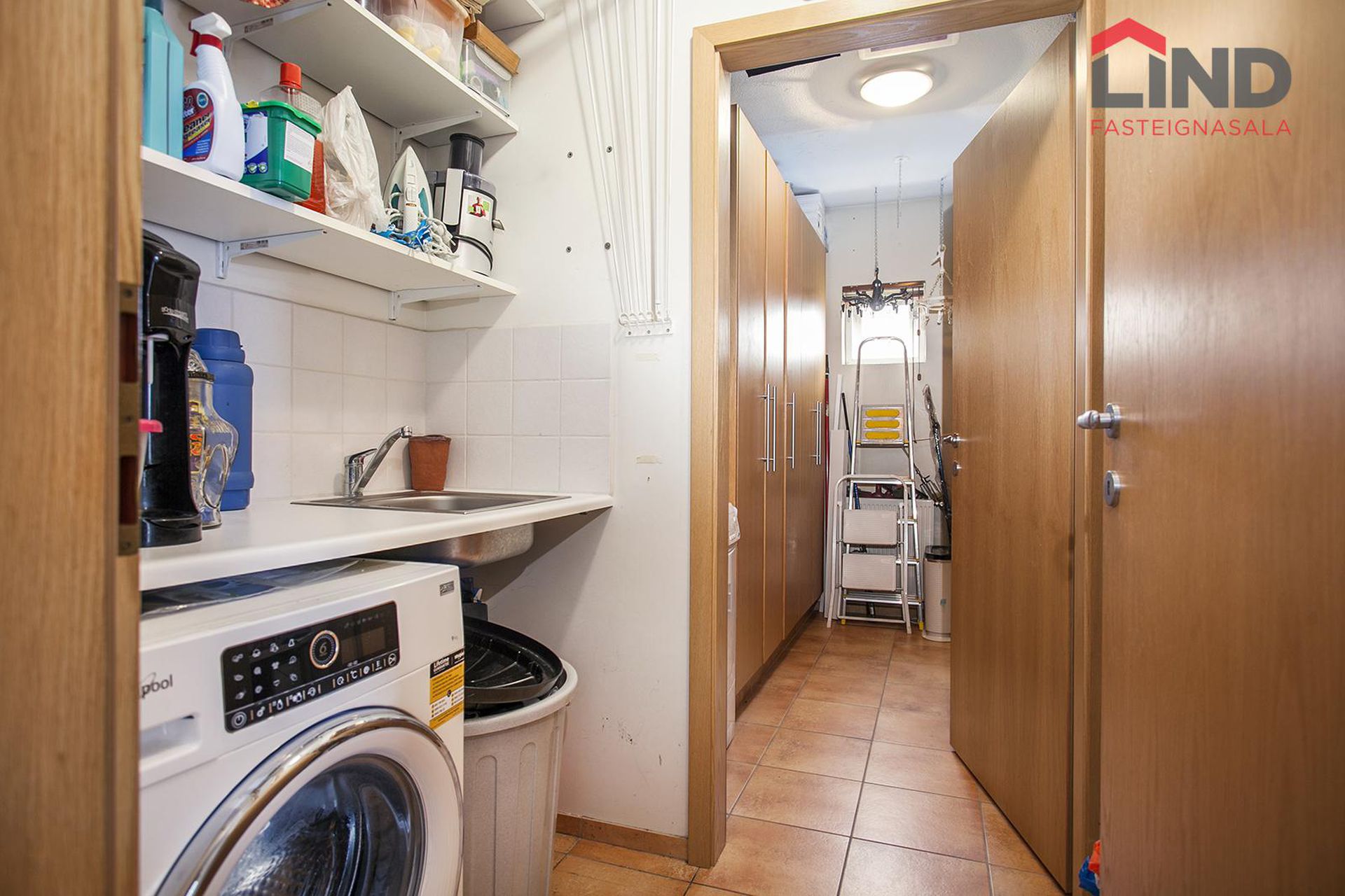 Þvottahús: Rúmar þvottavél og þurrkara. Innaf þvottahúsi er svo rúmgóð geymsla.