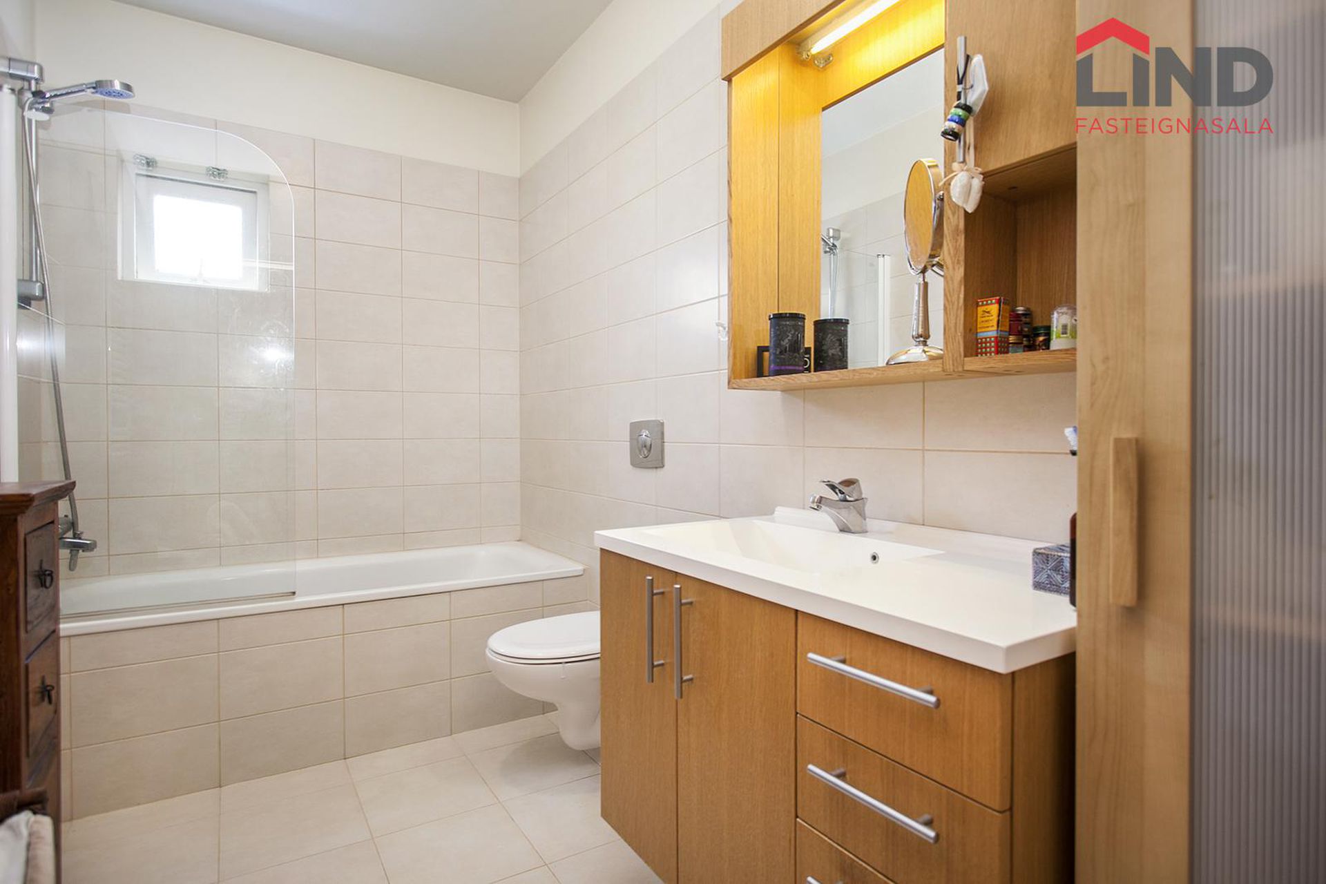 Baðherbergi: Ljósar flísar í hólf og gólf. Innrétting með eikar vaskaskáp og spegla skáp fyrir ofan. Baðkar með sturtu, upphengt salerni og handklæða ofn.