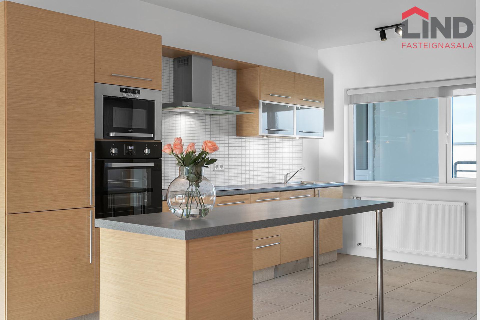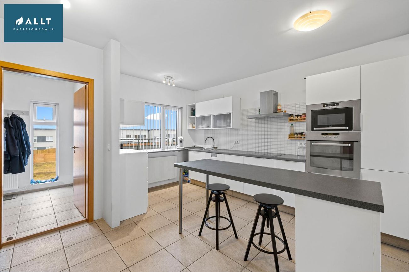 Eldhús: með hvítlakkaðri innréttingu með góðu borðplássi, helluborð, háf, ásamt combi ofnum. Örbylgju og bakarofn. Eyja með skúffum. Flísar á gólfi
