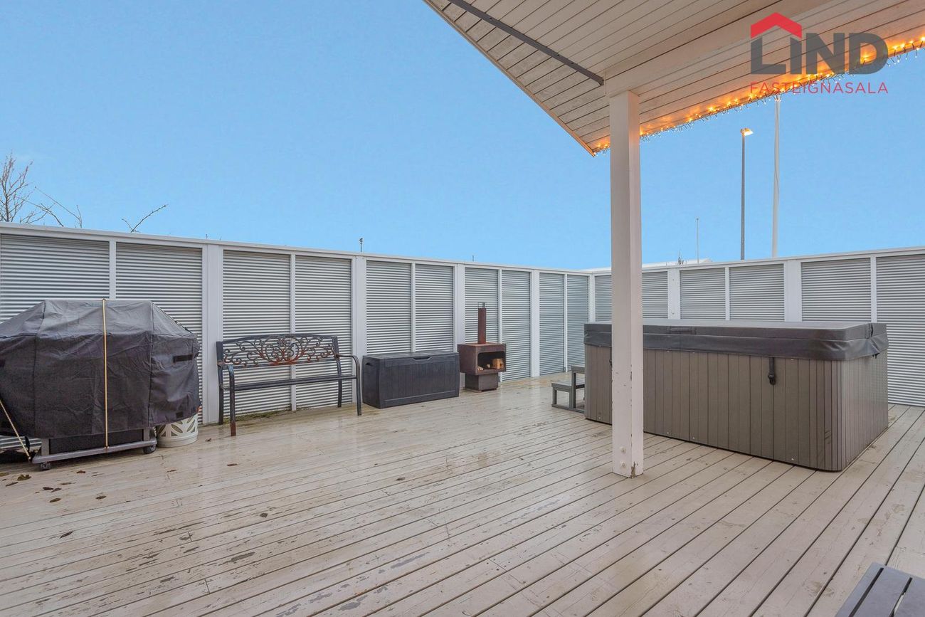 Heitur pottur á verönd.