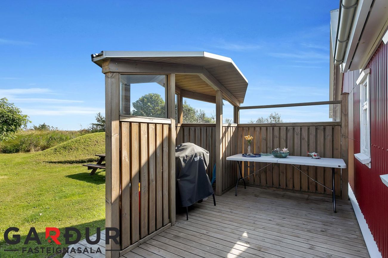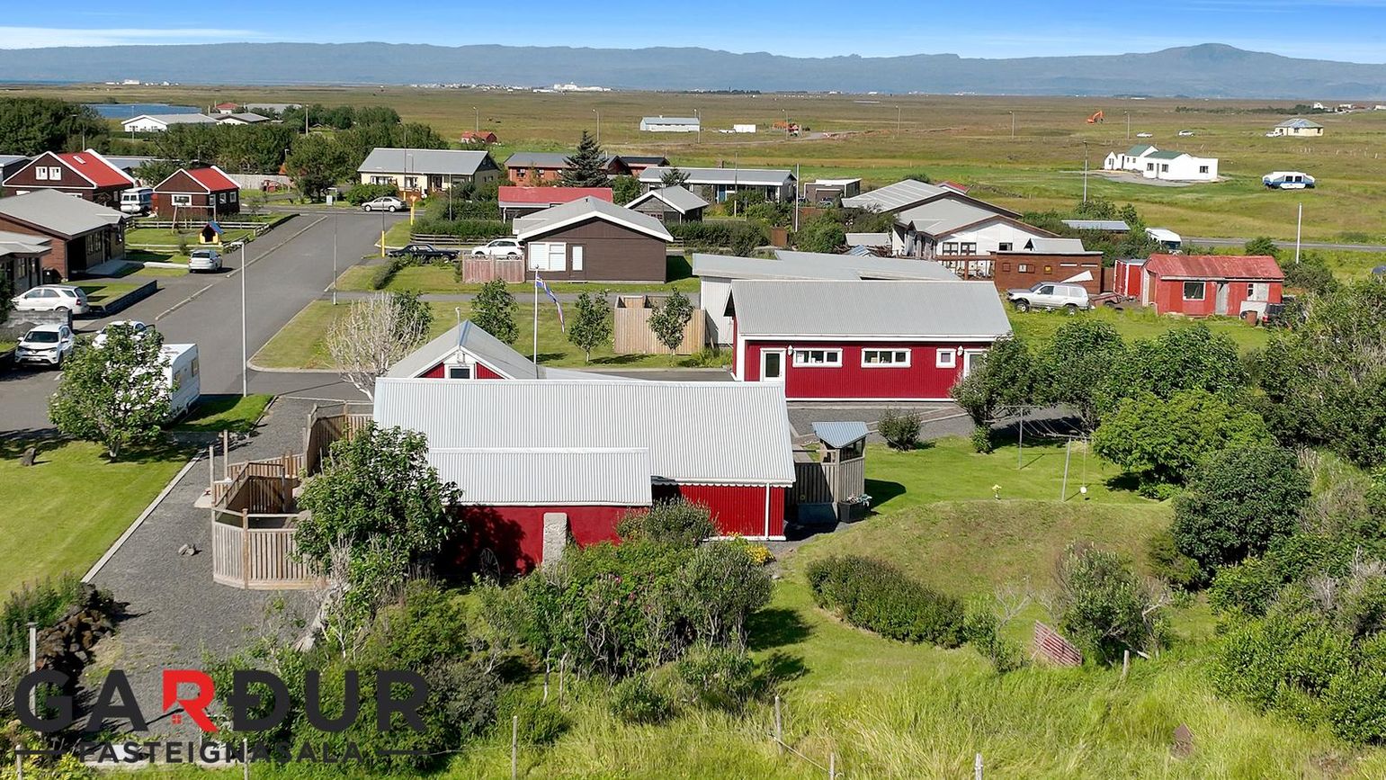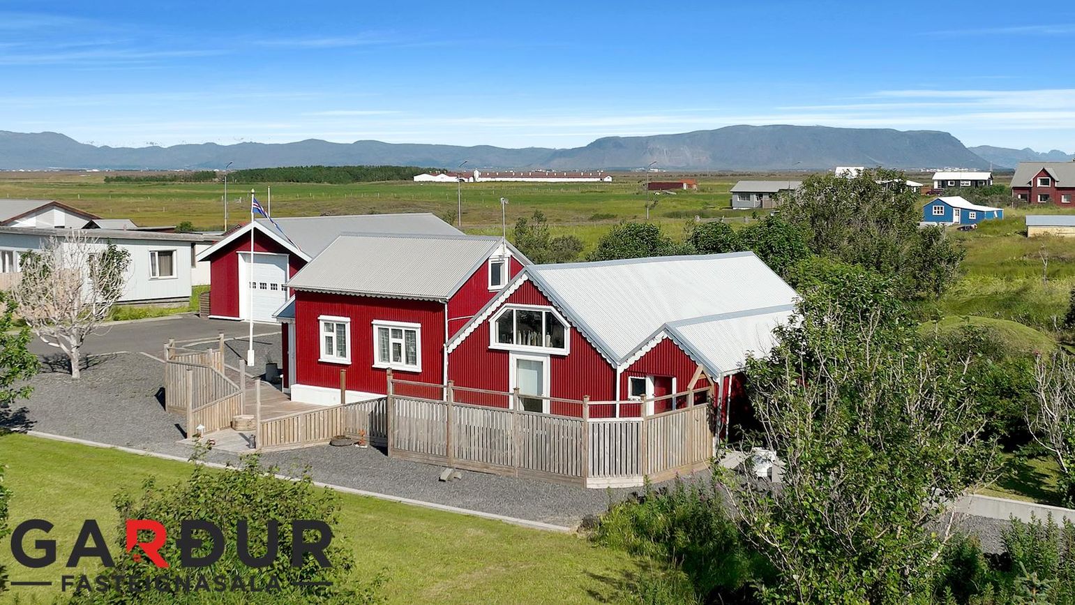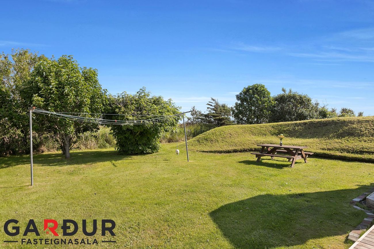 Upprunalegar tvær ágætar geymslur, gengið inn í geymslur frá verönd í austasta hluta hússins. Veglegur steyptur veggur eftir austanverðu lóðinni og allri suðurhliðinni. Falleg fánastöng er að framan.