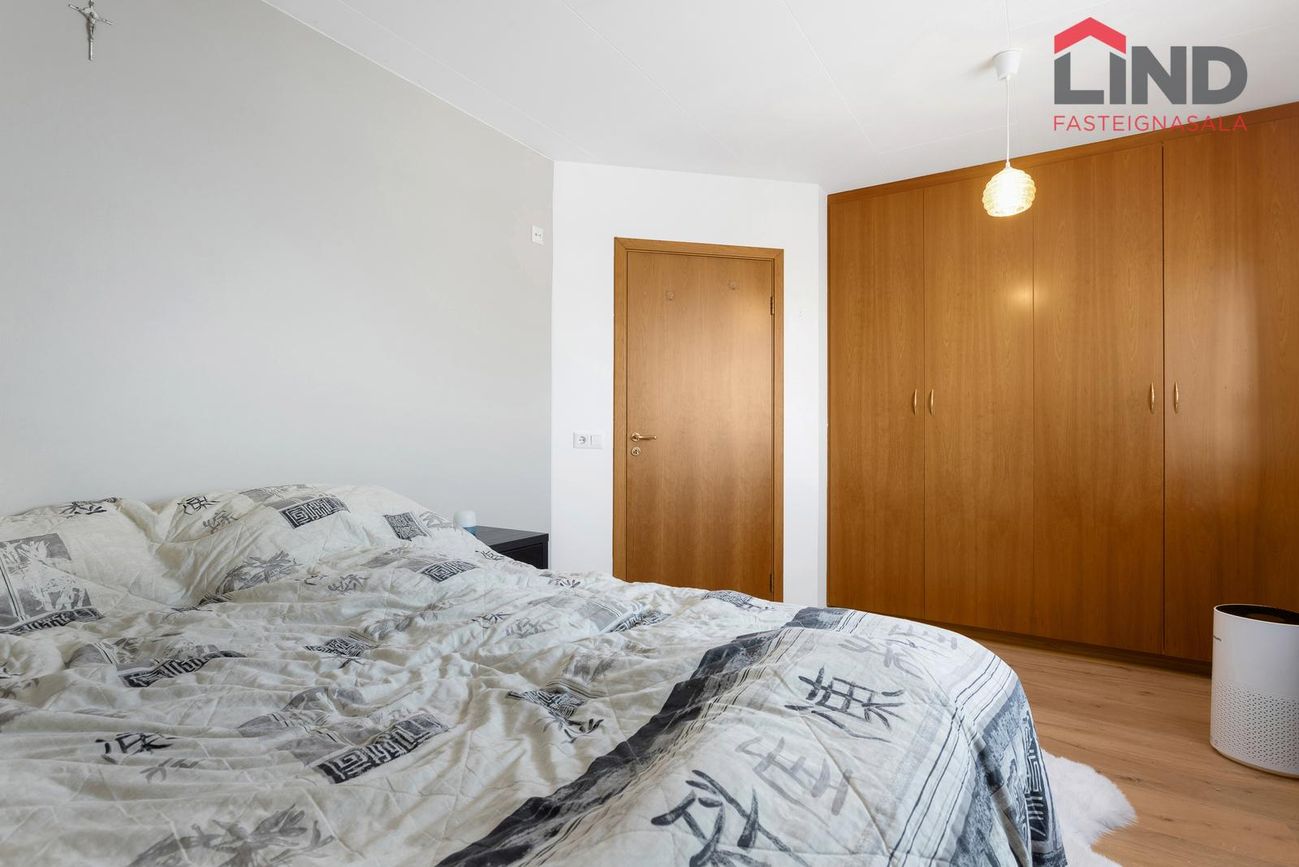 Hjónaherbergi er sérlega rúmgott með parketi á gólfi og fataskápum. Úr hjónaherbergi er glæsilegt útsýni til sjávar og yfir Esjuna.