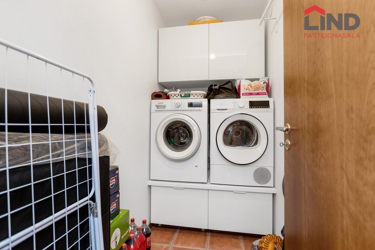 Þvottahús er staðsett innan íbúðar. Í þvottahúsi eru flísar á gólfi og hvít innrétting þar sem gert er ráð fyrir þvottavél og þurrkara.