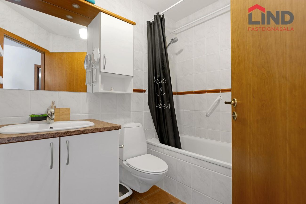 Baðherbergi er flísalagt. Þar er baðkar með sturtuaðstöðu.