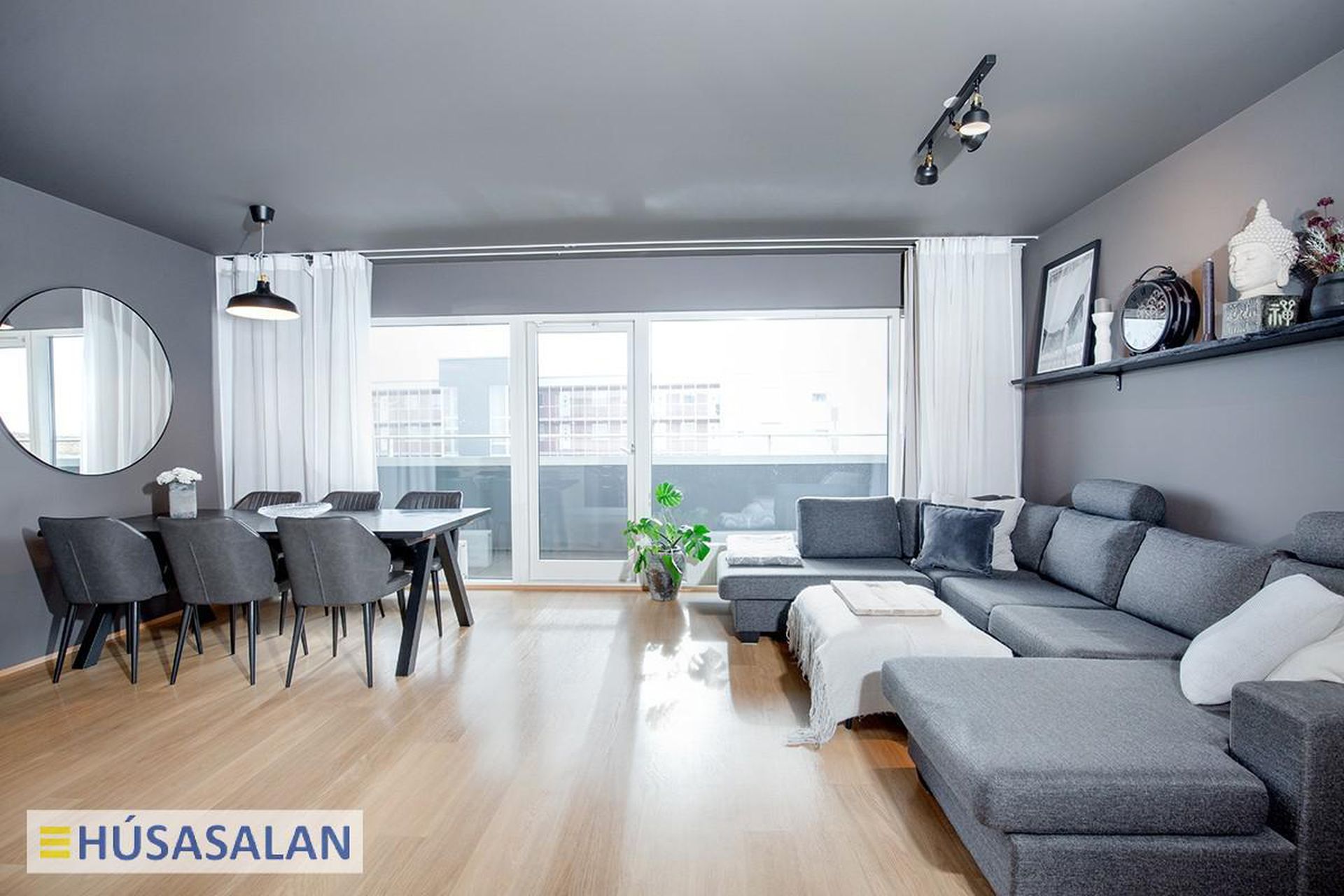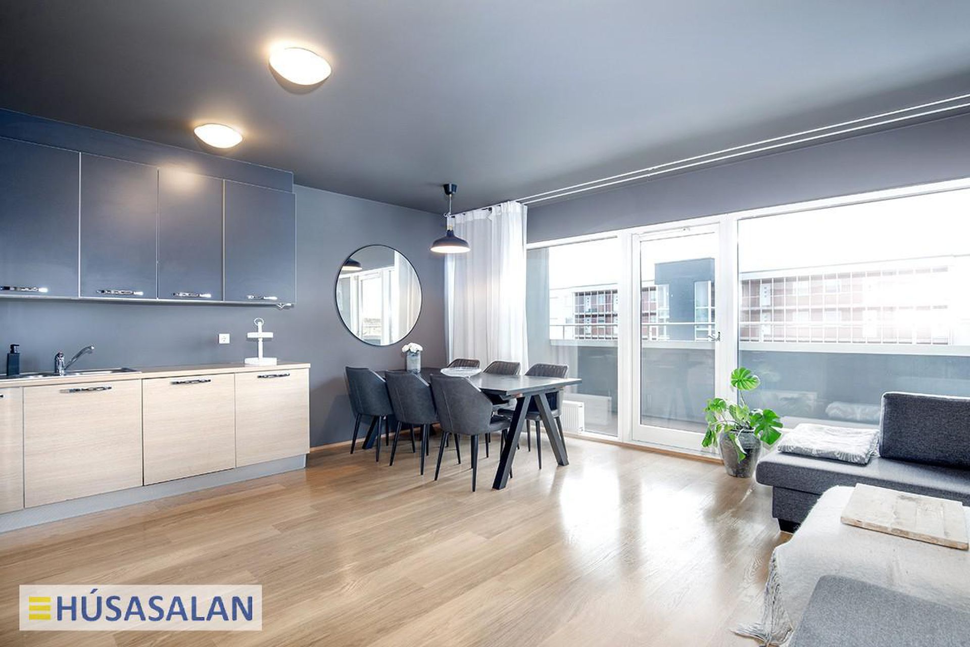 Samliggjandi stofa, borðstofa og eldhús. Stórt og bjart rými með parketi á gólfi. Úr stofu er útgengt út á stórar svalir til suðurs.
