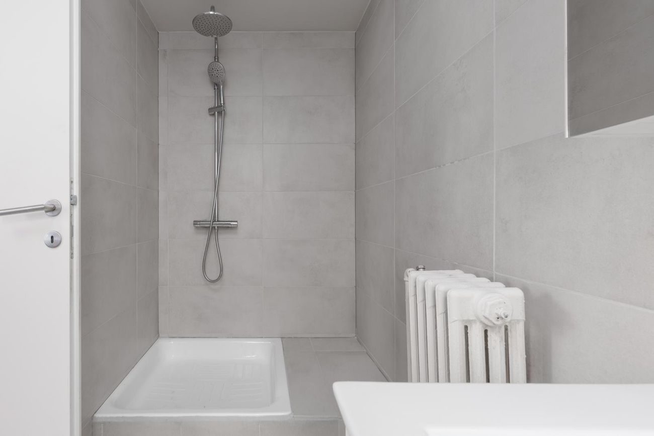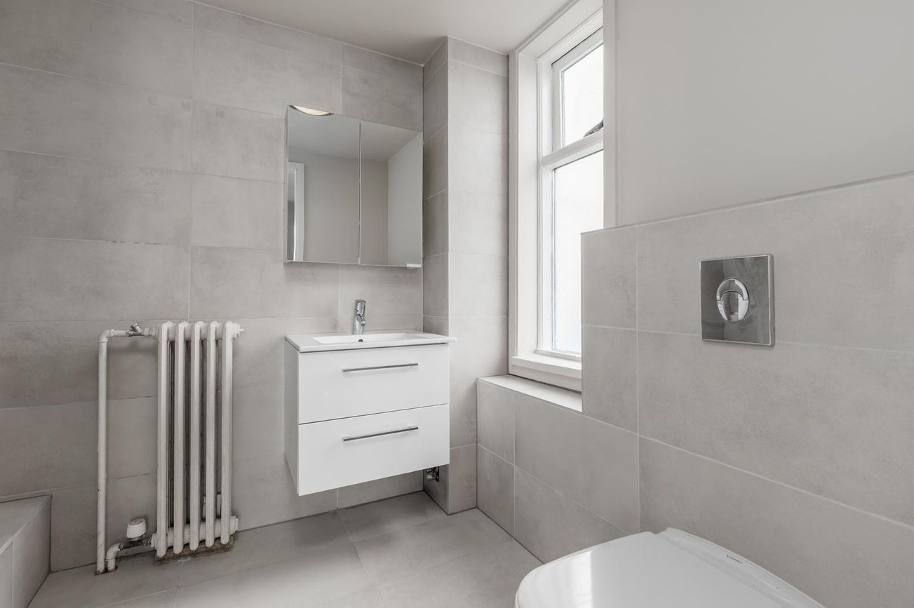 Baðherbergi: Flísalagt í hólf og gólf. Sturta. Innrétting með handlaug og efri skáp með speglagleri. Upphengt salerni.