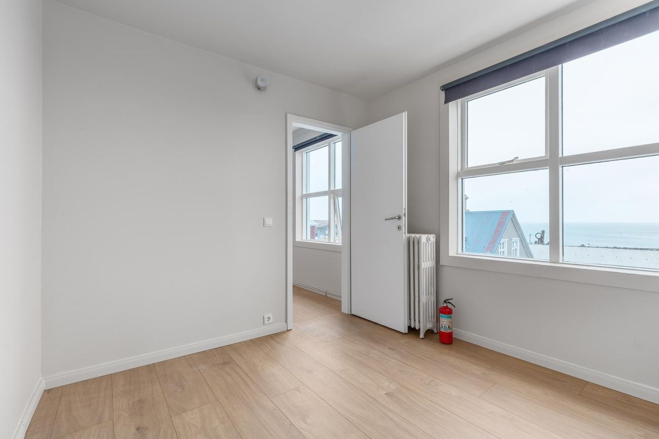 Svefnherbergi: Parket á gólfi. Útsýni til sjávar.