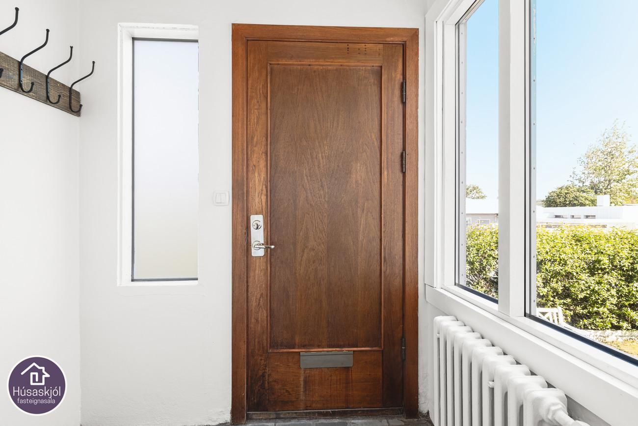 Lýsing eignar: Gengið er inn um sérinngang og komið inn í forstofu með flísum á gólfi og fataskáp. Til vinstri er rúmgott eldhús með U-laga eldhúsinnréttingu, efri og neðri skápum ásamt innréttingu á öðrum vegg, góður borðkrókur í eldhúsi, flísar á gólfi. Stórir gluggar í eldhúsi sem hleypa inn góðri birtu. Við hlið eldhúss eru 2 samliggjandi stofur með stórum gluggum, parket á gólfi. 2 svefnherbergi, bæði með parketi og hjónaherbergi með innbyggðum tékkskápum. Baðherbergi er flísalagt í hólf og gólf með sturtu, handklæðaofni, innréttingu og glugga. Frá gangi er niðurgengt í sameign og þaðan inn í kjallaraíbúðina. Stór og gróinn sameiginlegur garður fylgir eigninni.