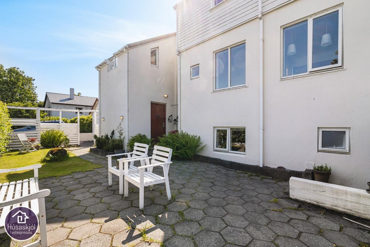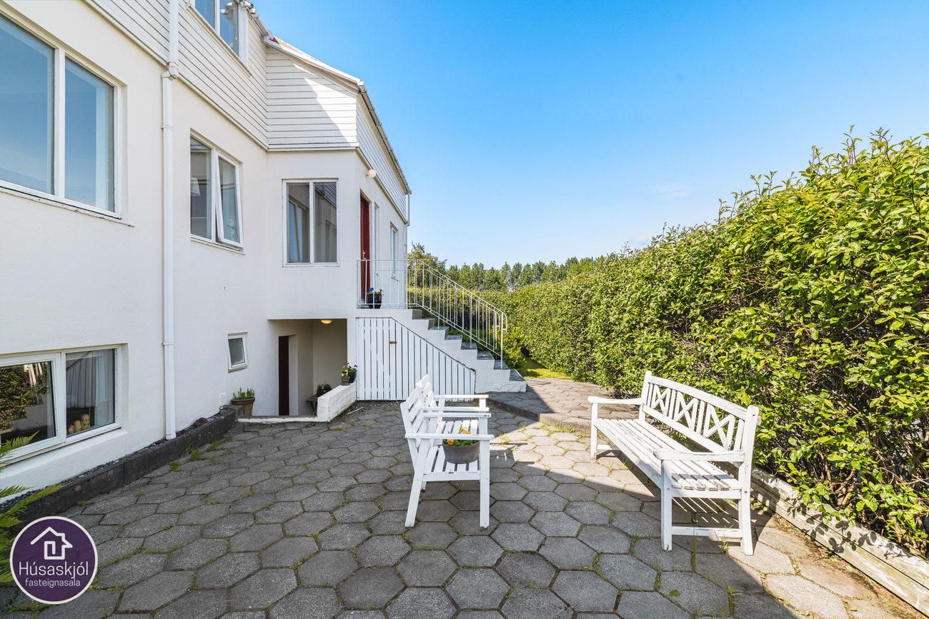 Lýsing eignar: Gengið er inn um sérinngang og komið inn í forstofu með flísum á gólfi og fataskáp. Til vinstri er rúmgott eldhús með U-laga eldhúsinnréttingu, efri og neðri skápum ásamt innréttingu á öðrum vegg, góður borðkrókur í eldhúsi, flísar á gólfi. Stórir gluggar í eldhúsi sem hleypa inn góðri birtu. Við hlið eldhúss eru 2 samliggjandi stofur með stórum gluggum, parket á gólfi. 2 svefnherbergi, bæði með parketi og hjónaherbergi með innbyggðum tékkskápum. Baðherbergi er flísalagt í hólf og gólf með sturtu, handklæðaofni, innréttingu og glugga. Frá gangi er niðurgengt í sameign og þaðan inn í kjallaraíbúðina. Stór og gróinn sameiginlegur garður fylgir eigninni.