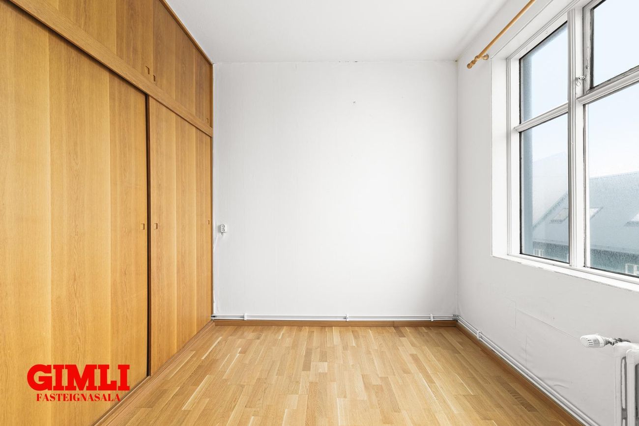 alrými með parketlögðu gólfi og eru gluggar á tvo vegu, fataskápur fyrir yfirhafnir við hurð