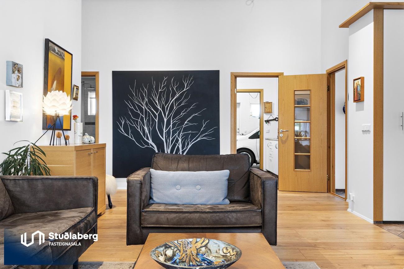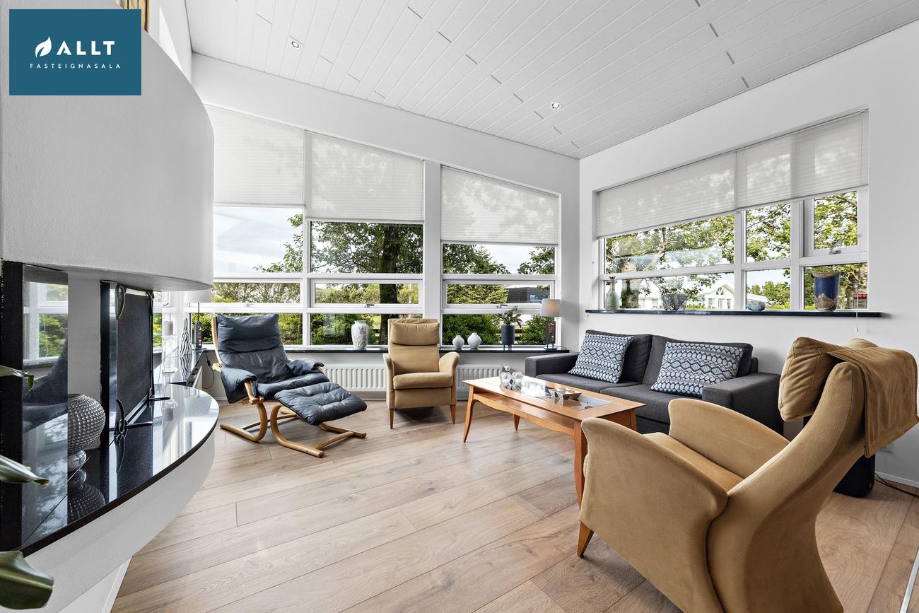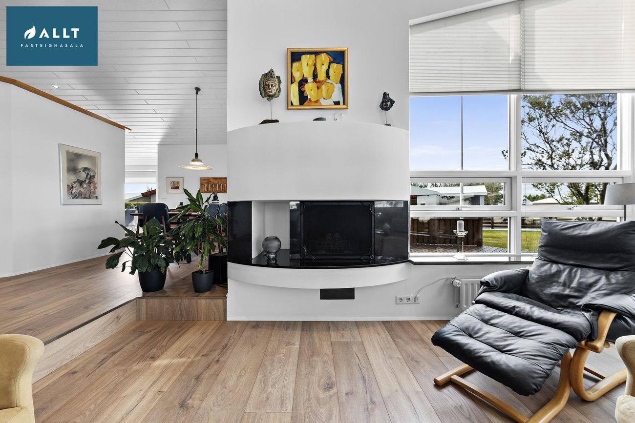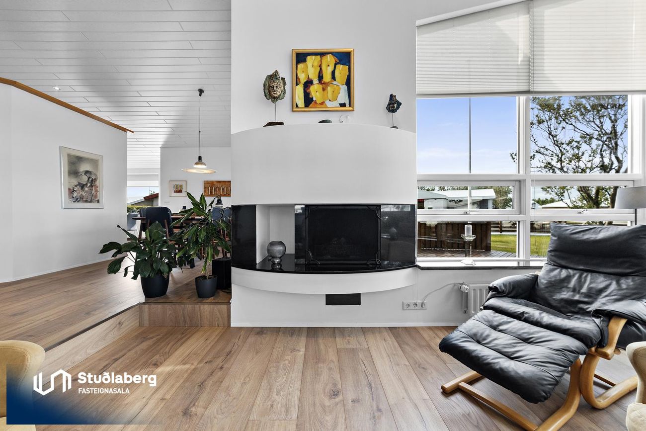 Sjónvarpshol með hurð út á verönd. Neðristofa með arin.