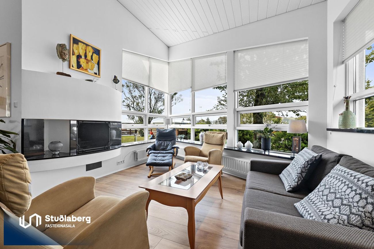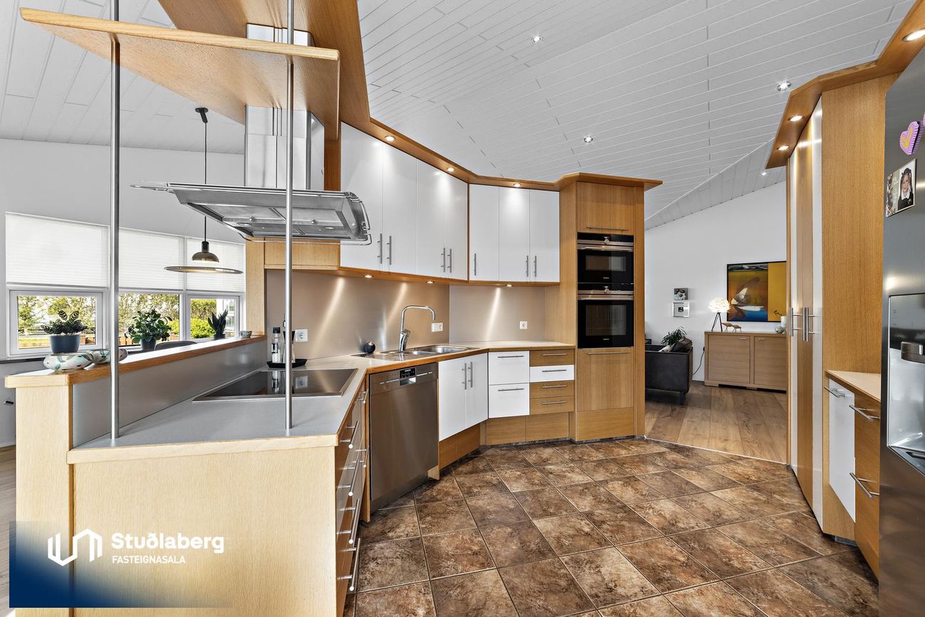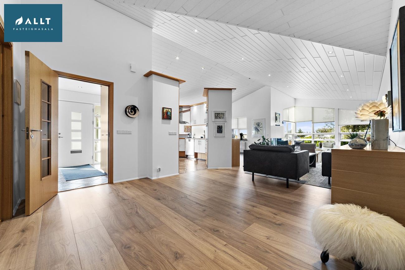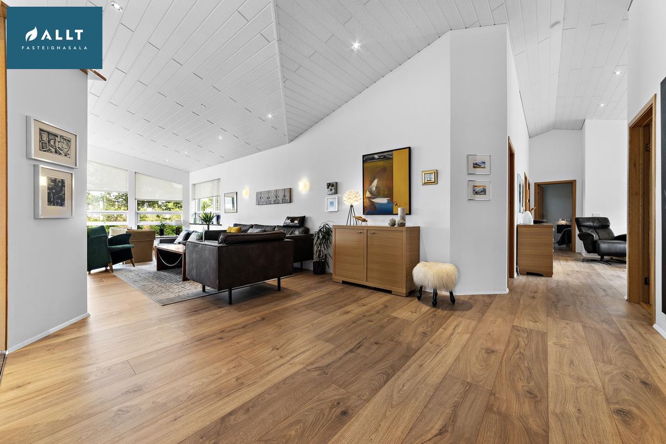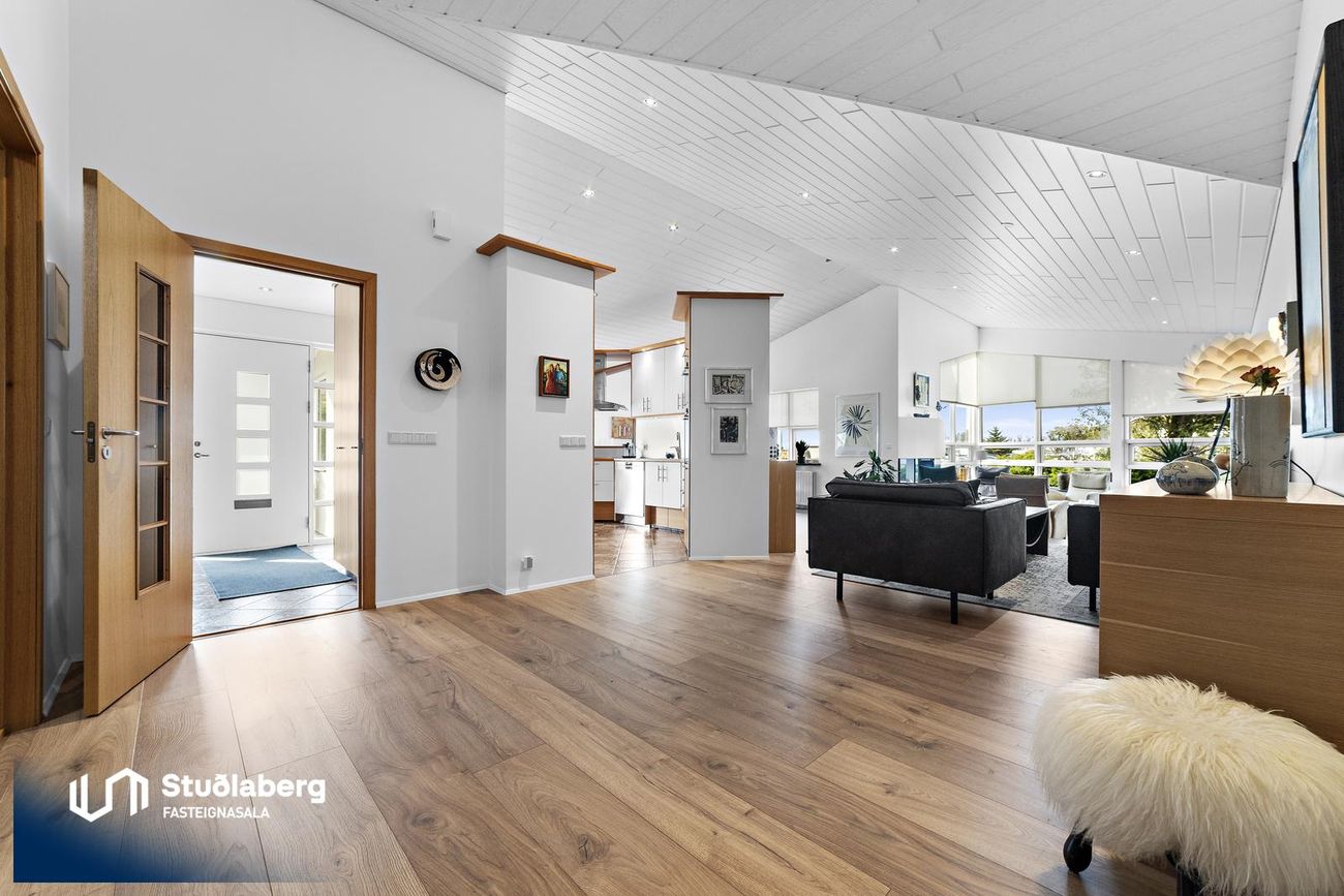 Hús skiptist í forstofu, þrjú barnaherbergi (tvö sameinuð), hjónaherbergi með baðherbergi, eldhús, borðstofu, tvær stofur, sjónvarpshol og þvottahús. Alrými loft með innbyggðri loftalýsingu.