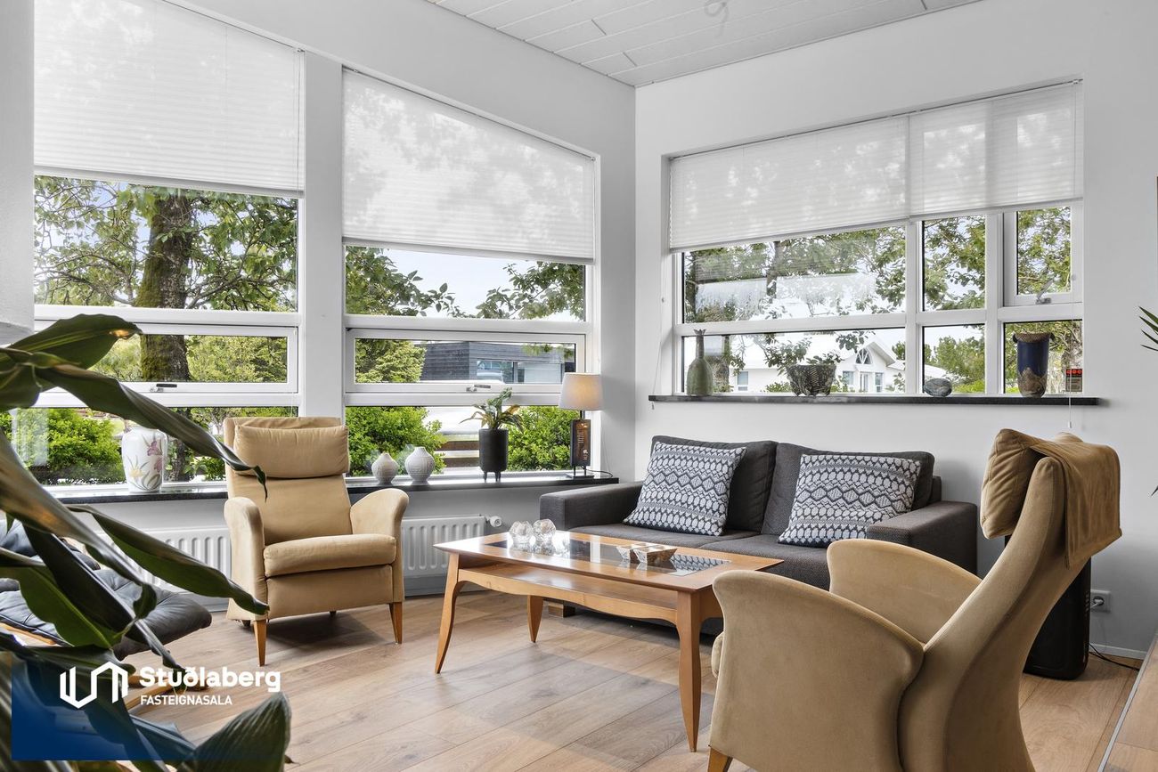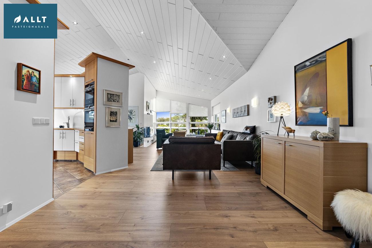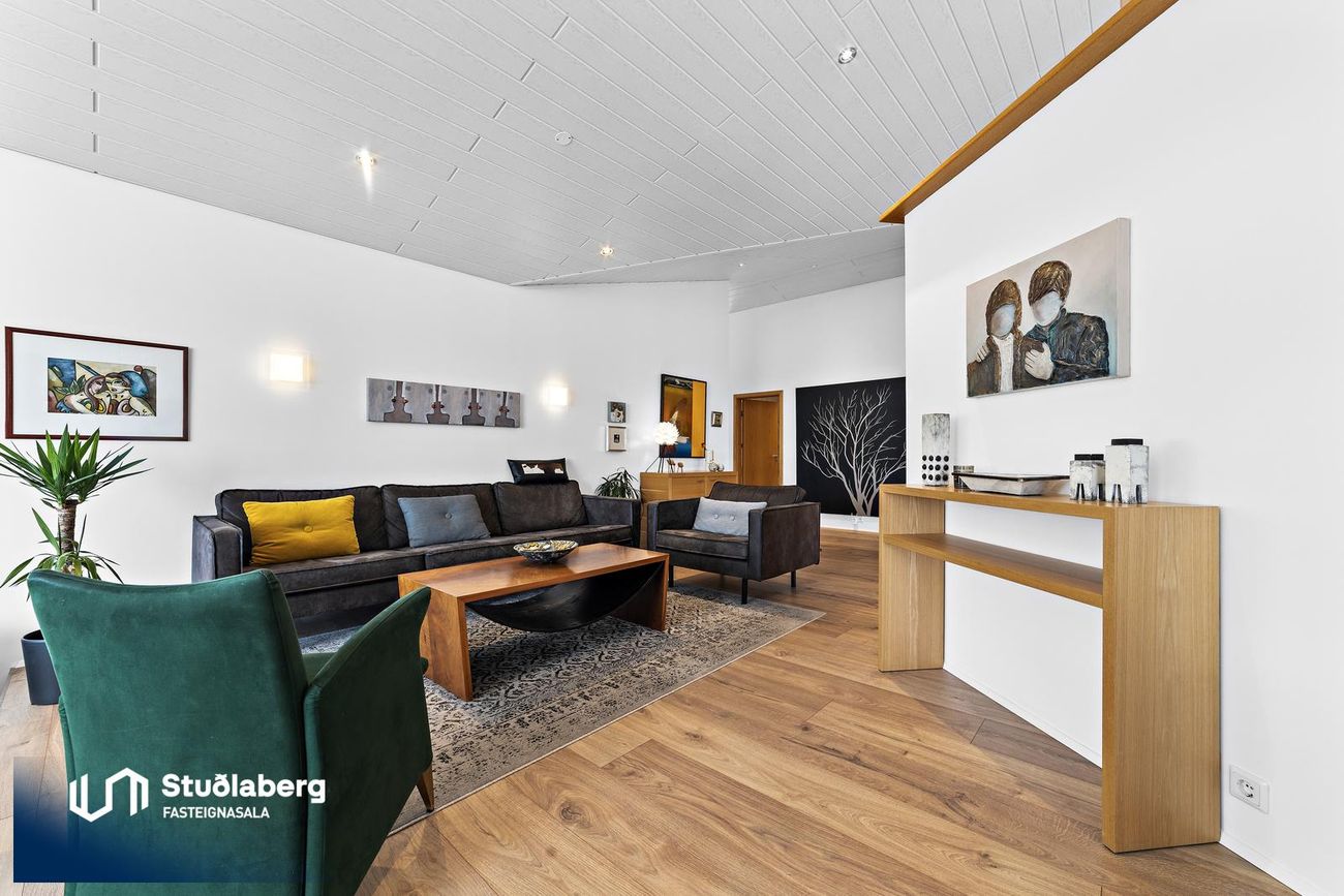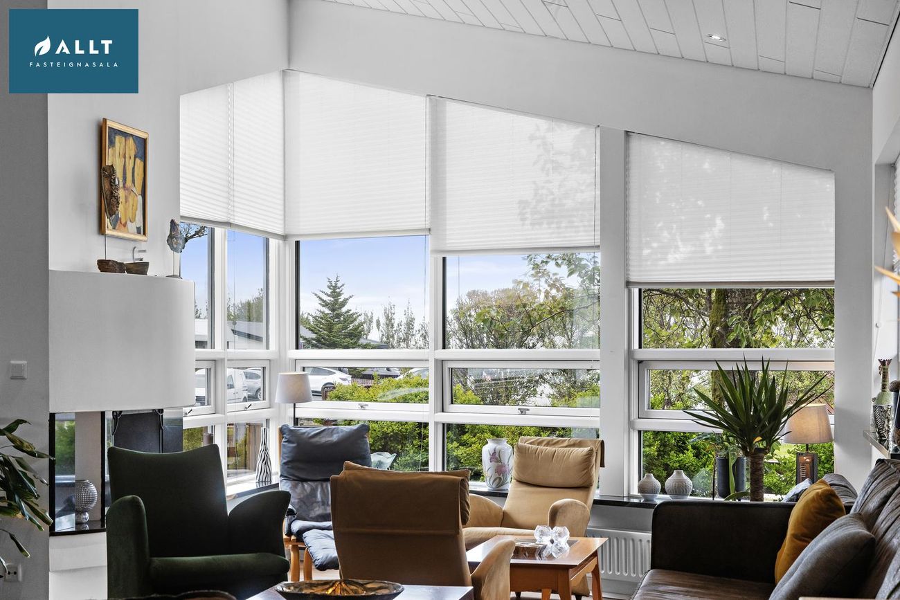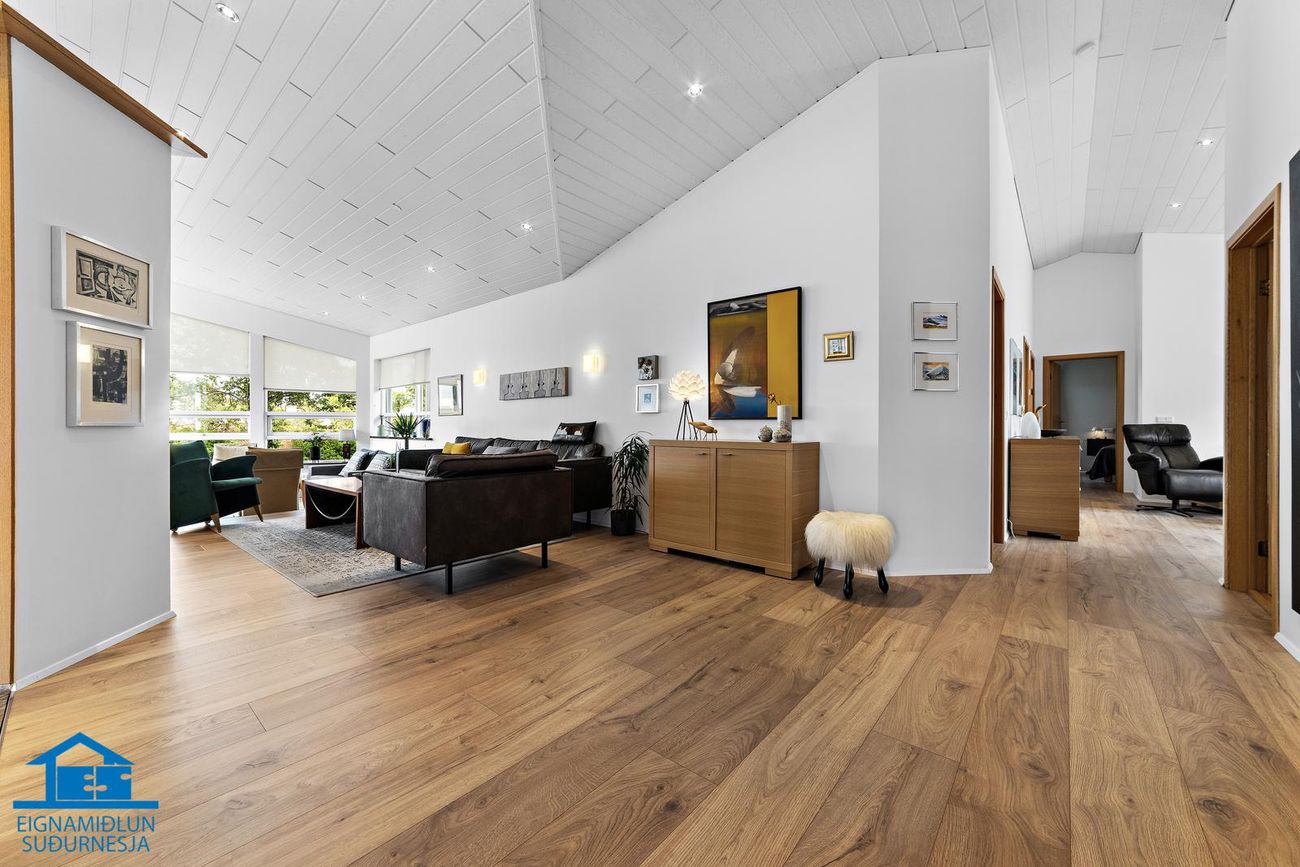 Hús skiptist í forstofu, þrjú barnaherbergi (tvö sameinuð), hjónaherbergi með baðherbergi, eldhús, borðstofu, tvær stofur, sjónvarpshol og þvottahús. Alrými loft með innbyggðri loftalýsingu.