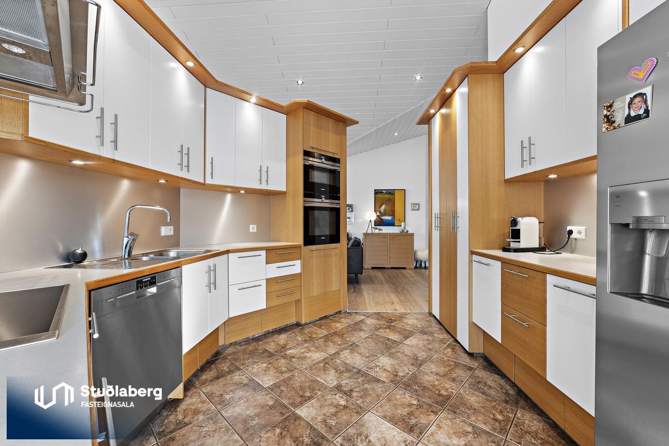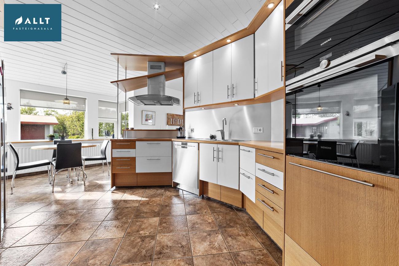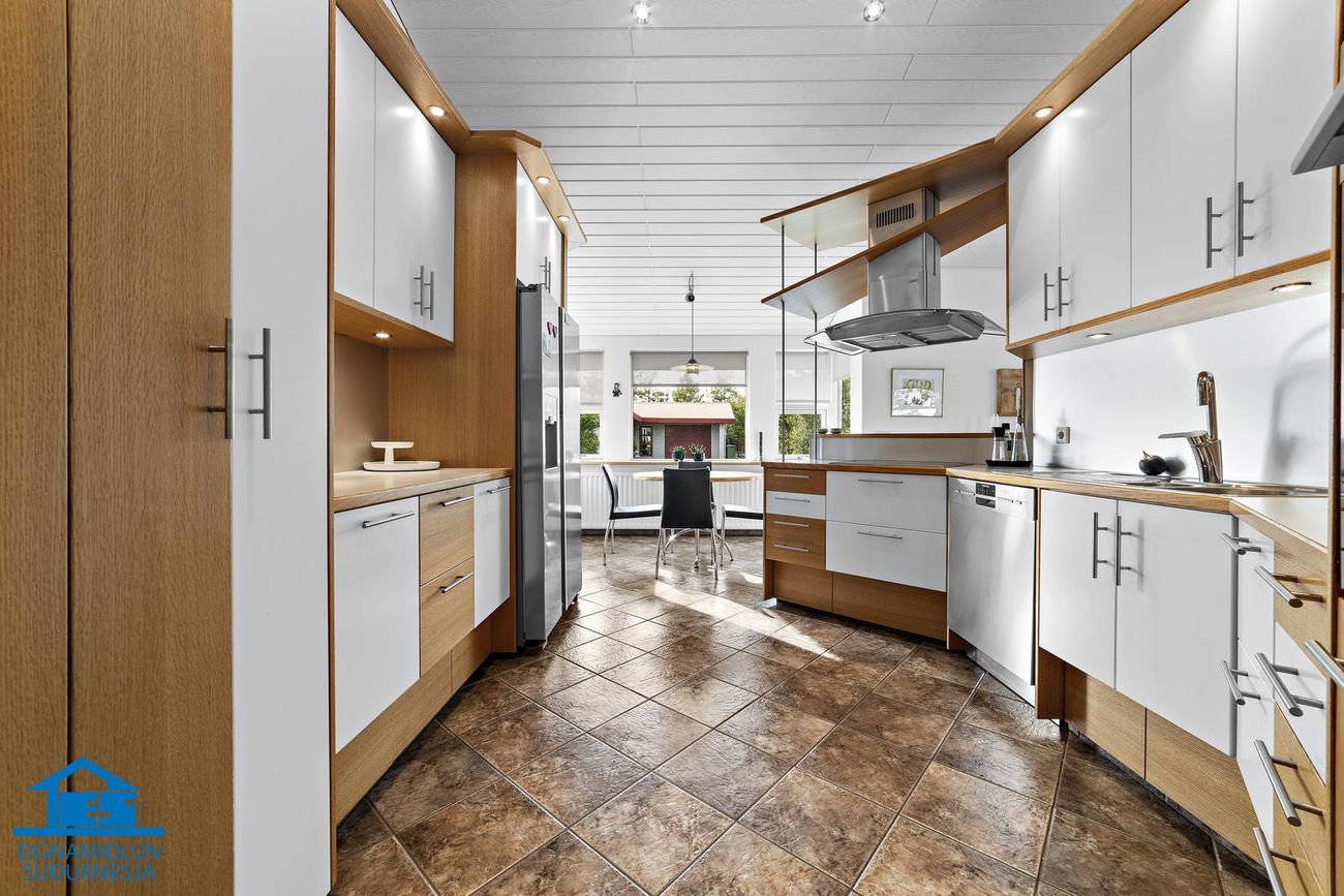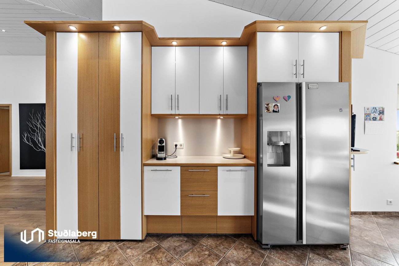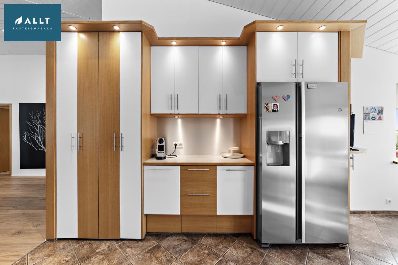 Sérsmíðuð innrétting með miklu skápaplássi, góð eldhústæki og flísalögðu gólfi. Borðkrókur inn af eldhúsinu.