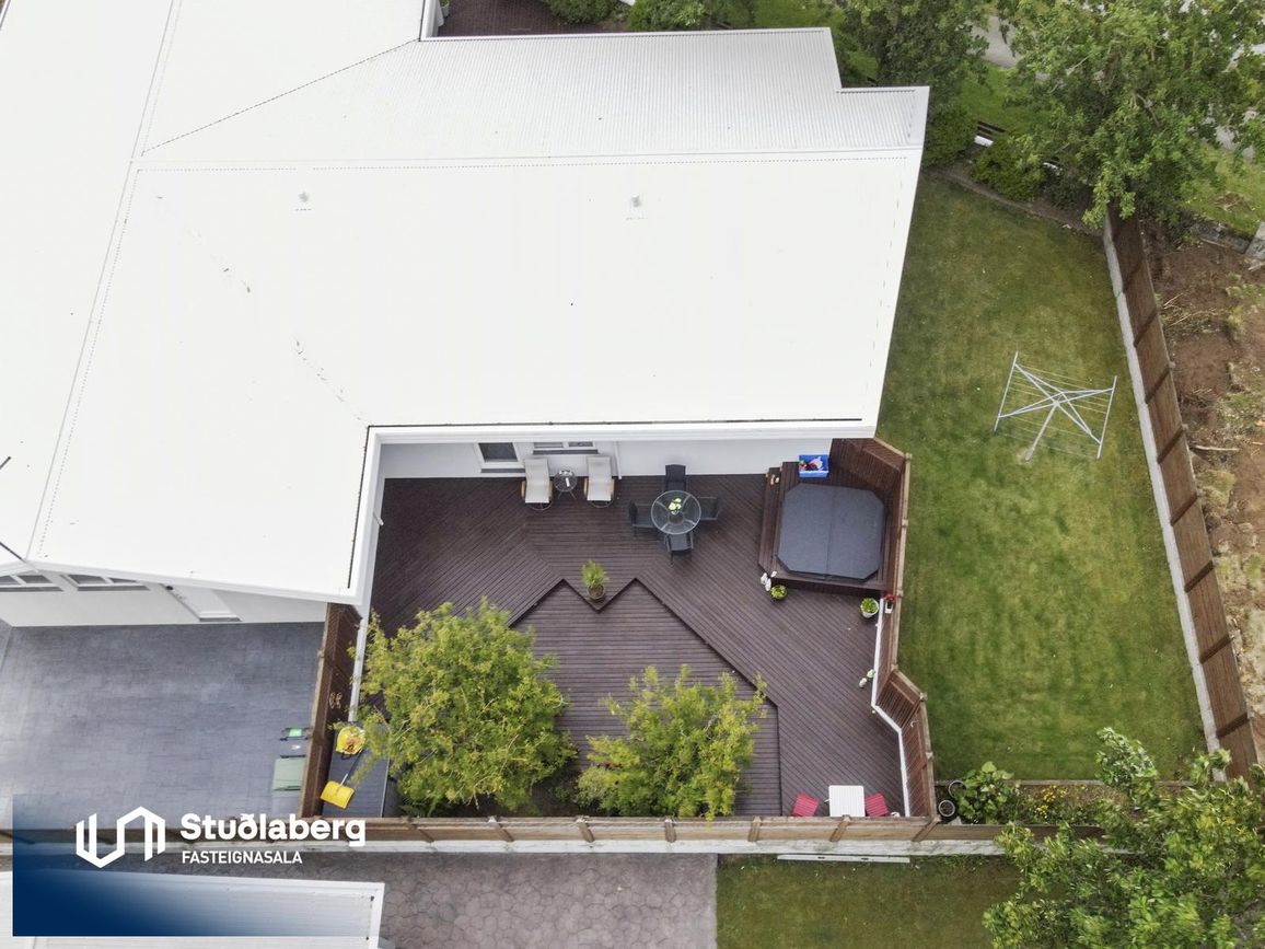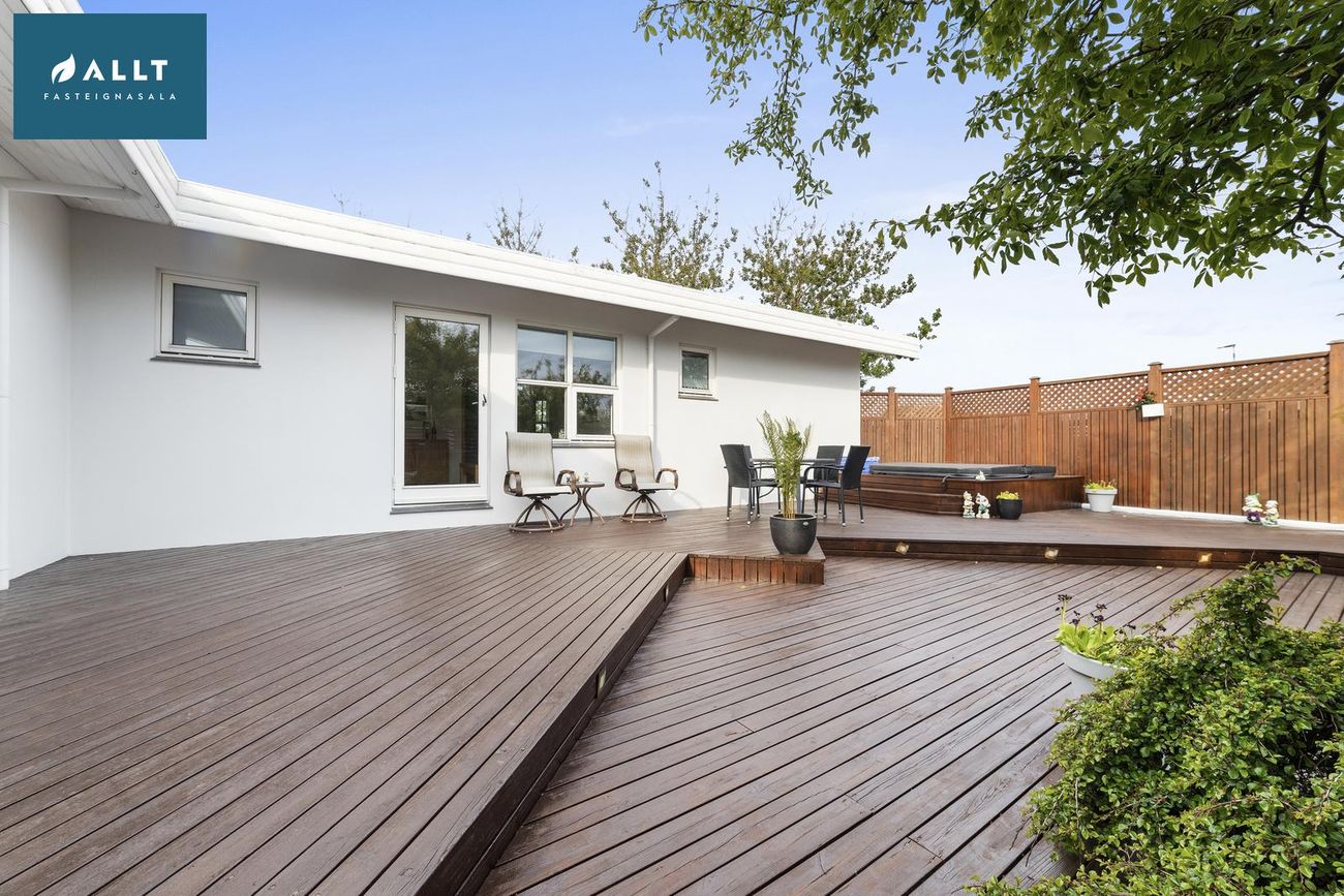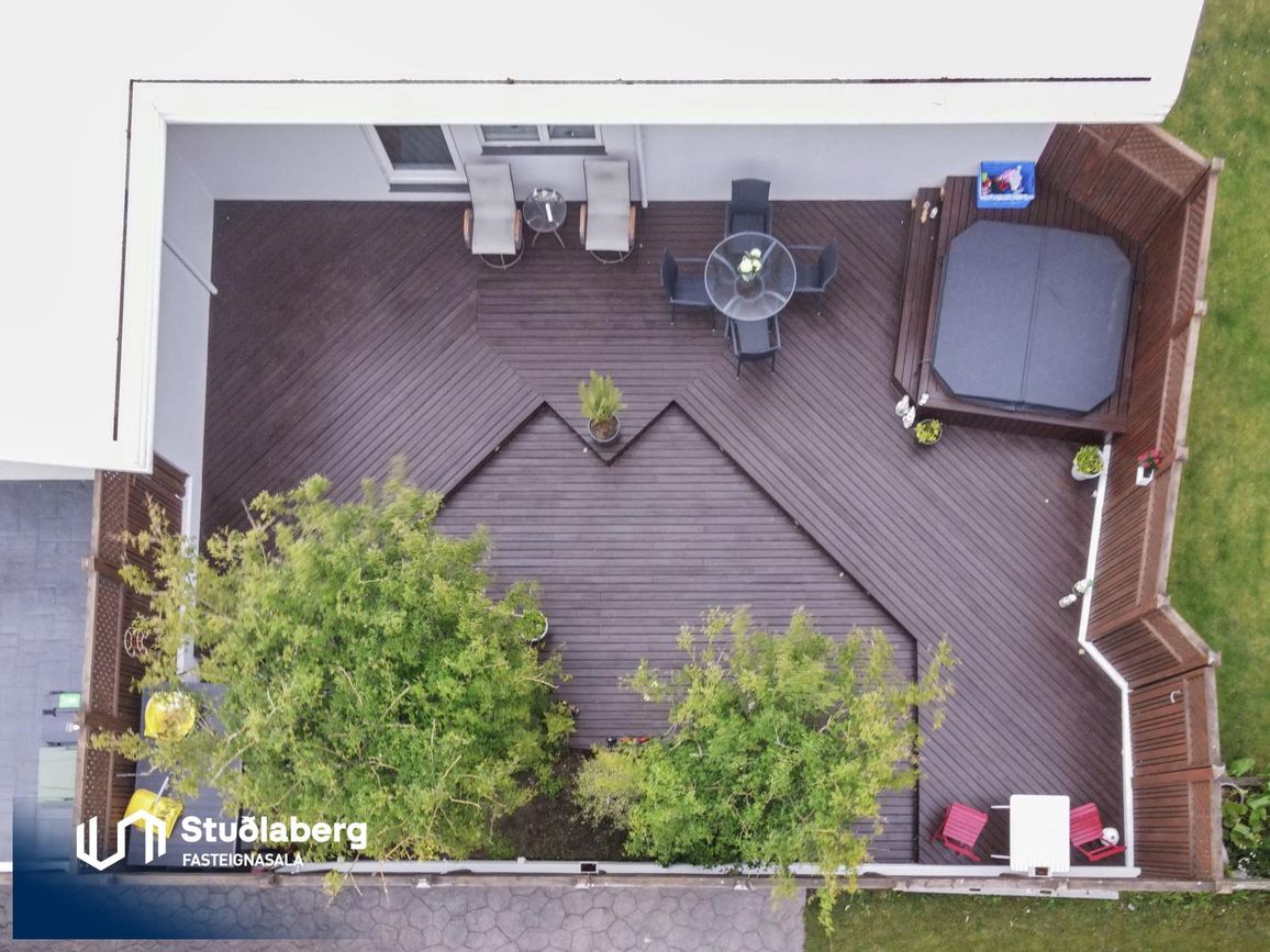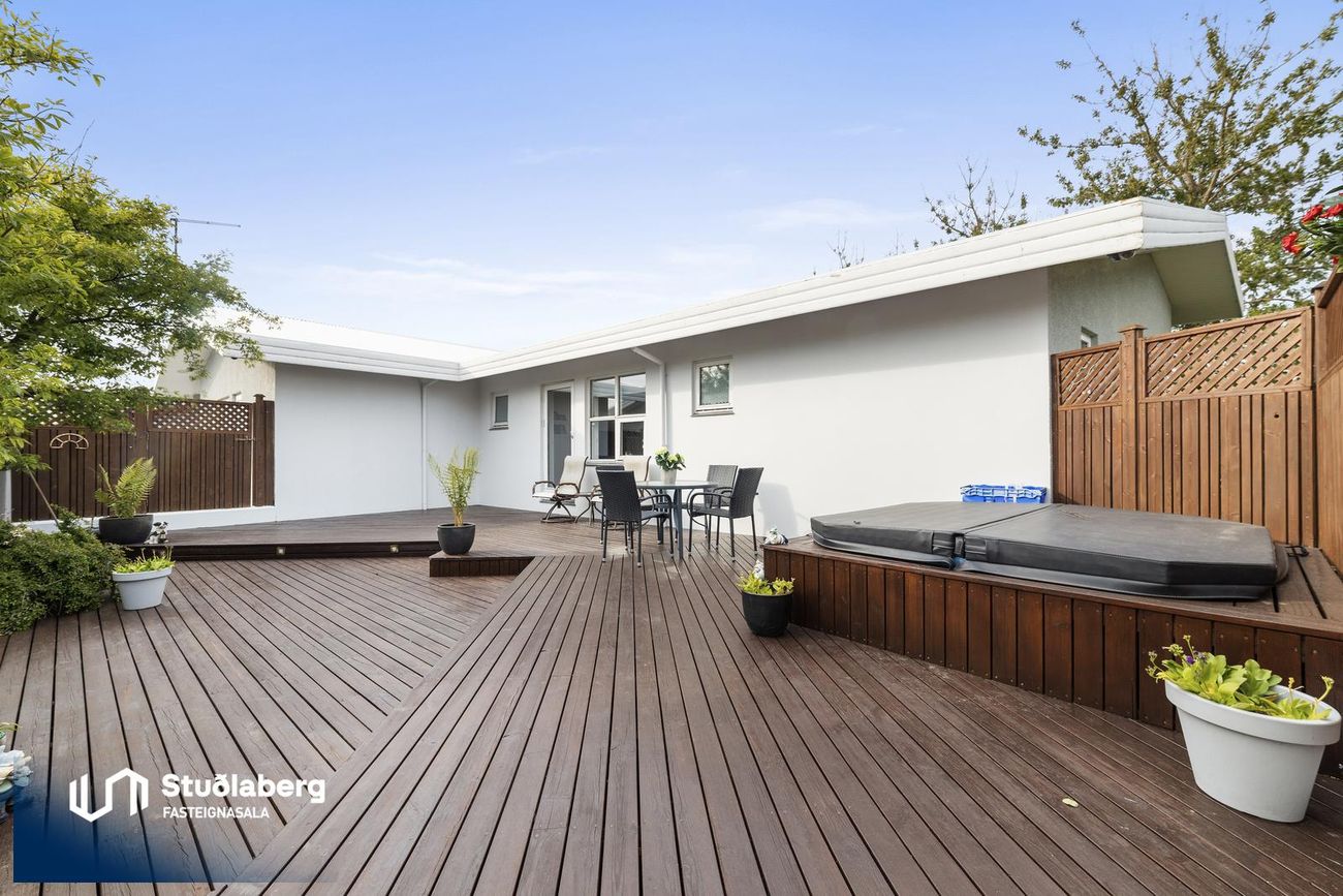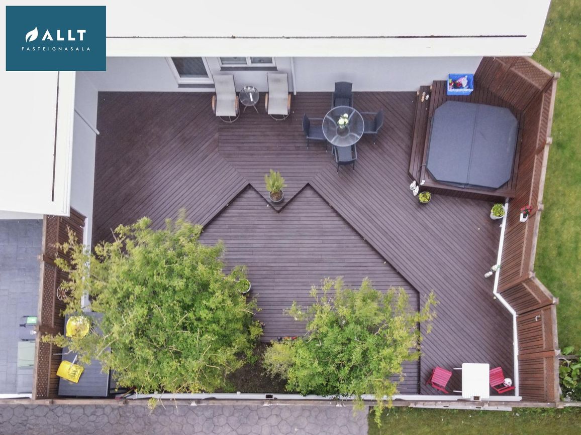 Fullu frágengin lóð með veröndum á þrjá vegu, heitum potti og gróinni lóð.
