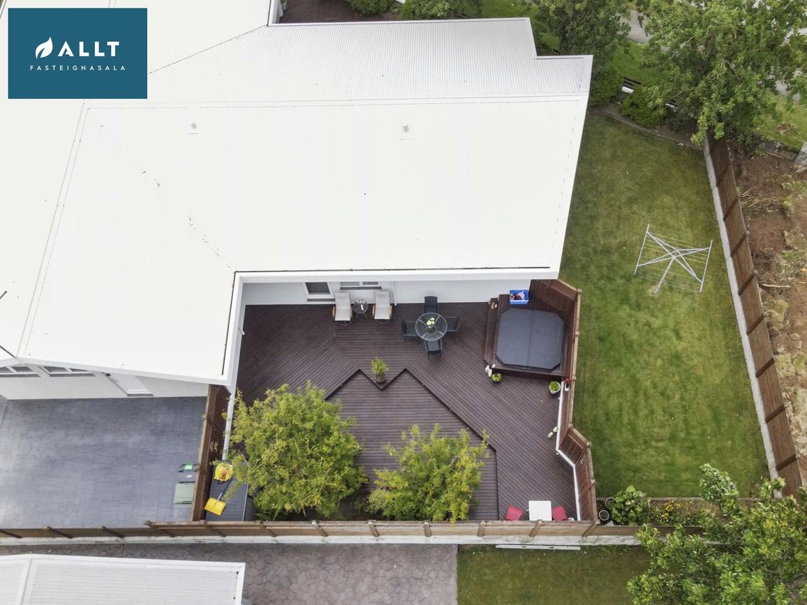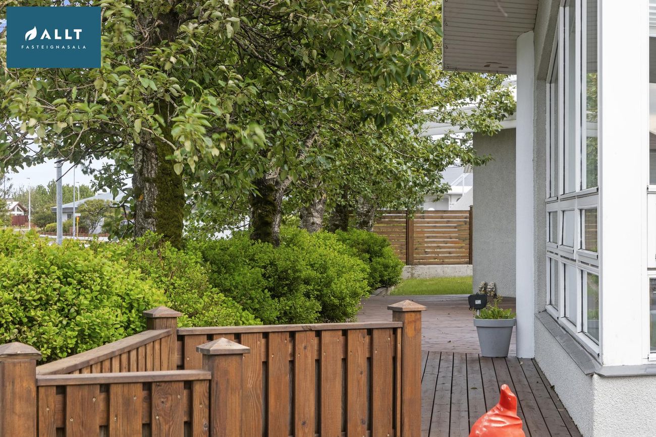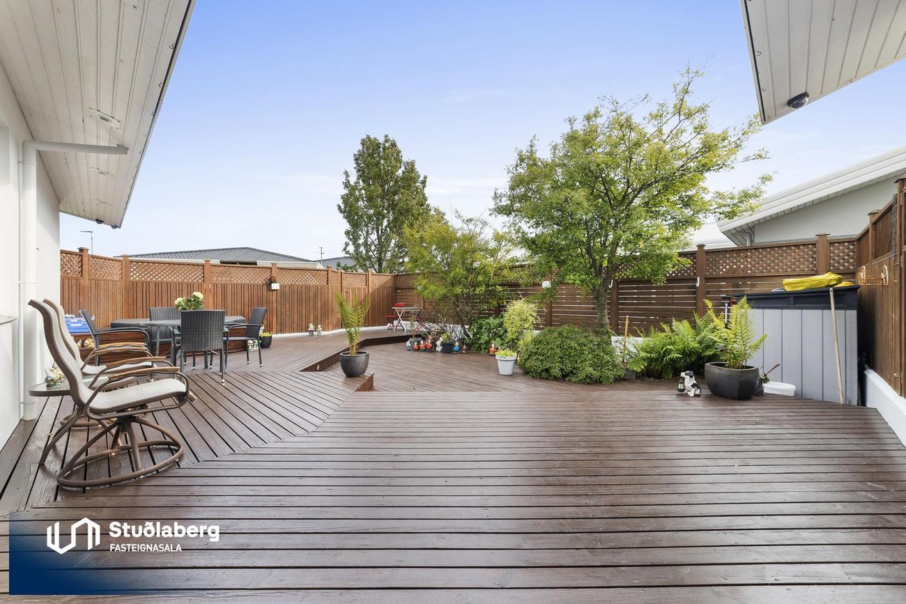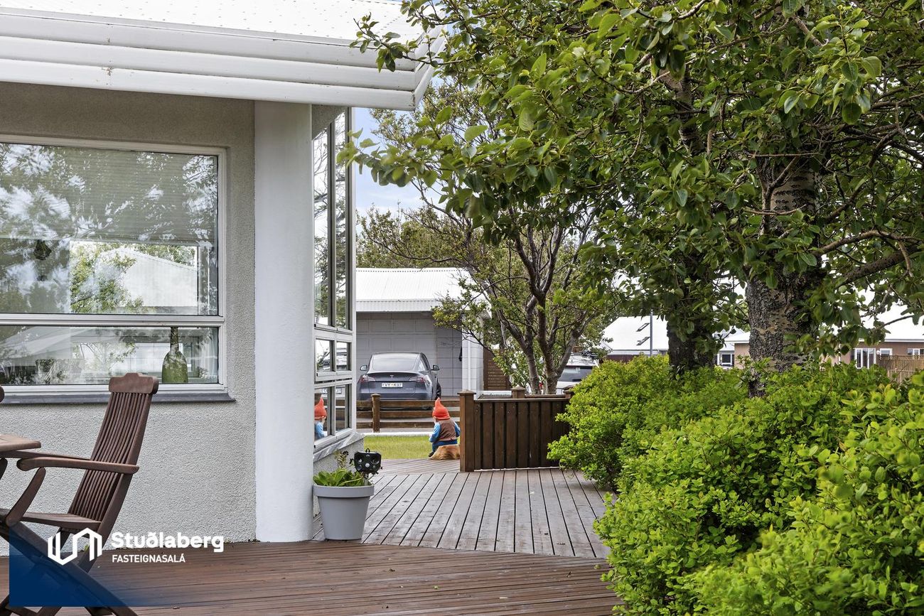 Fullu frágengin lóð með veröndum á þrjá vegu, heitum potti og gróinni lóð.
