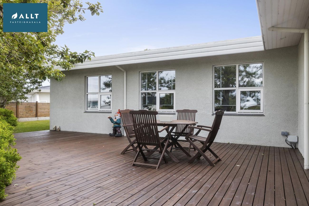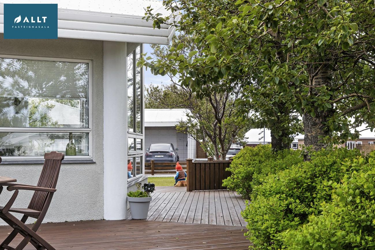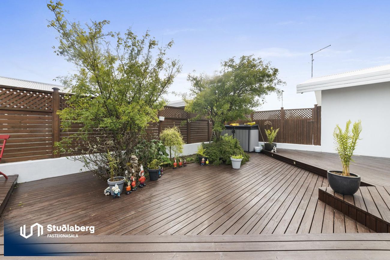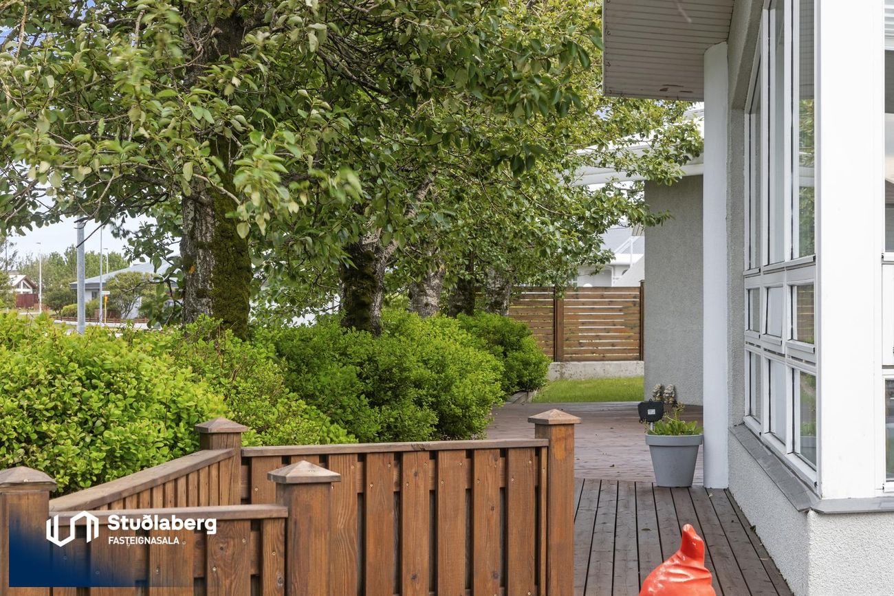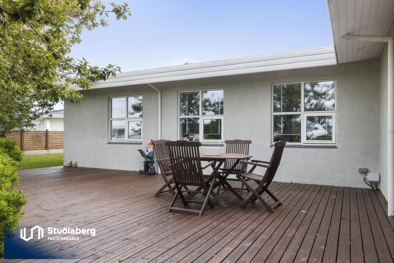 Fullu frágengin lóð með veröndum á þrjá vegu, heitum potti og gróinni lóð.