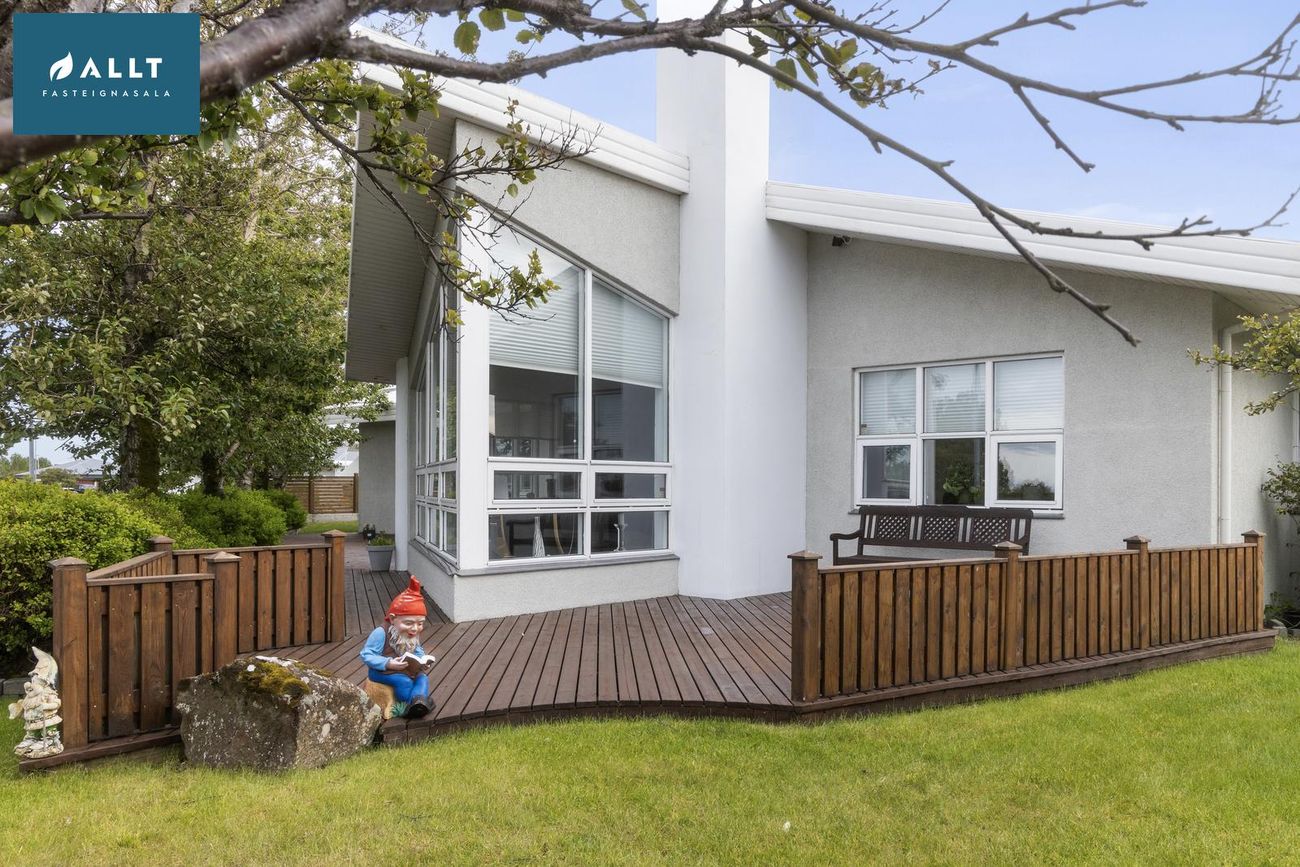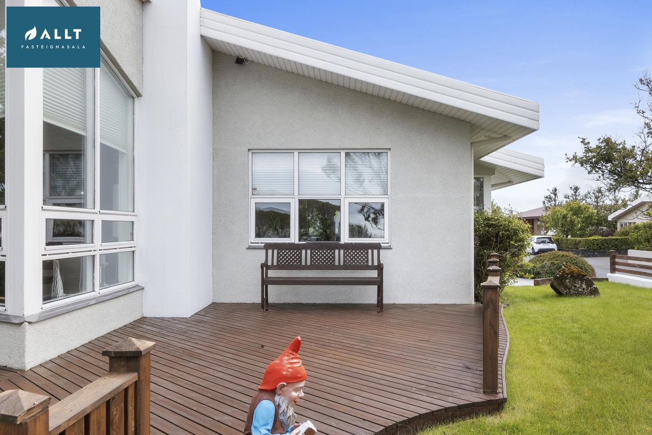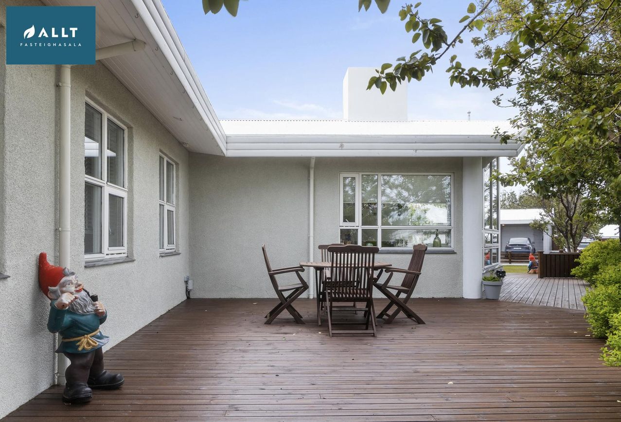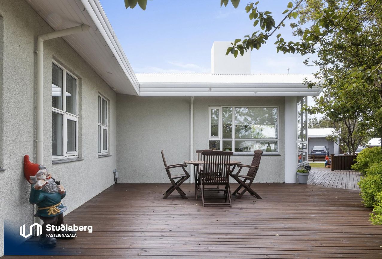 Fullu frágengin lóð með veröndum á þrjá vegu, heitum potti og gróinni lóð.