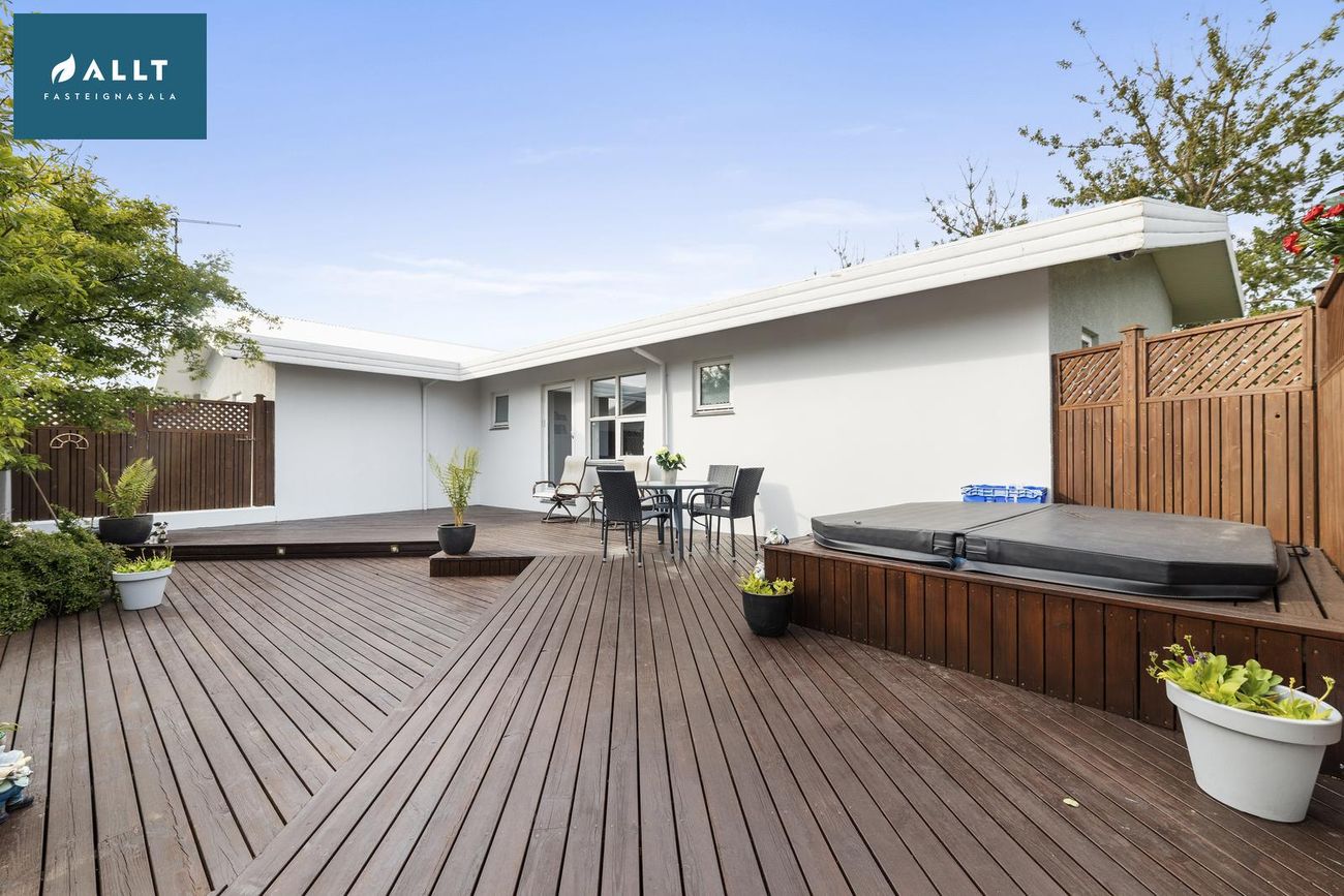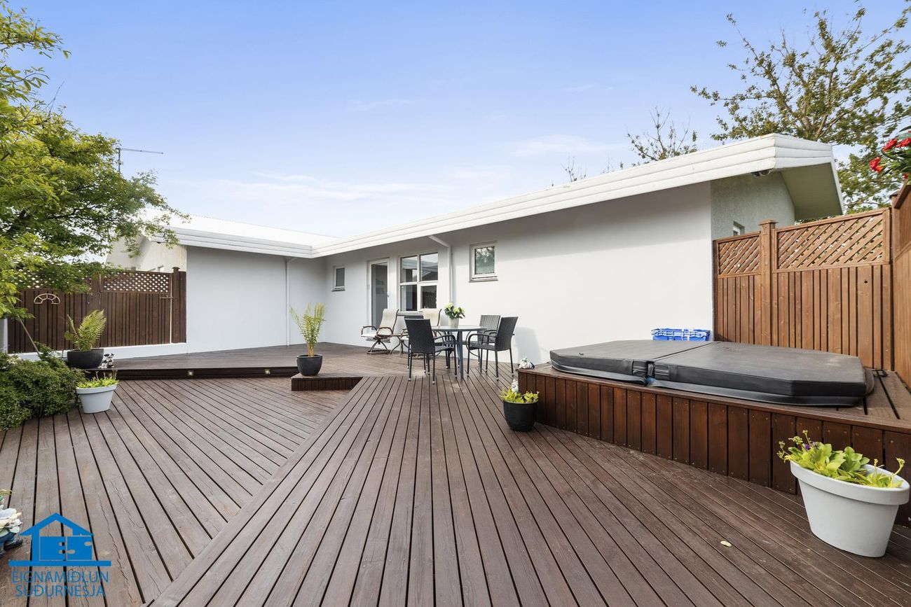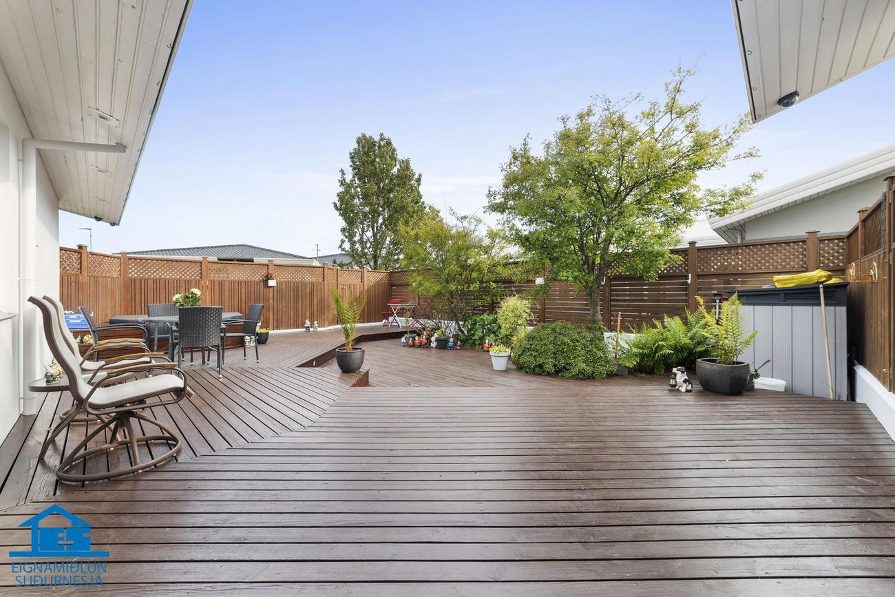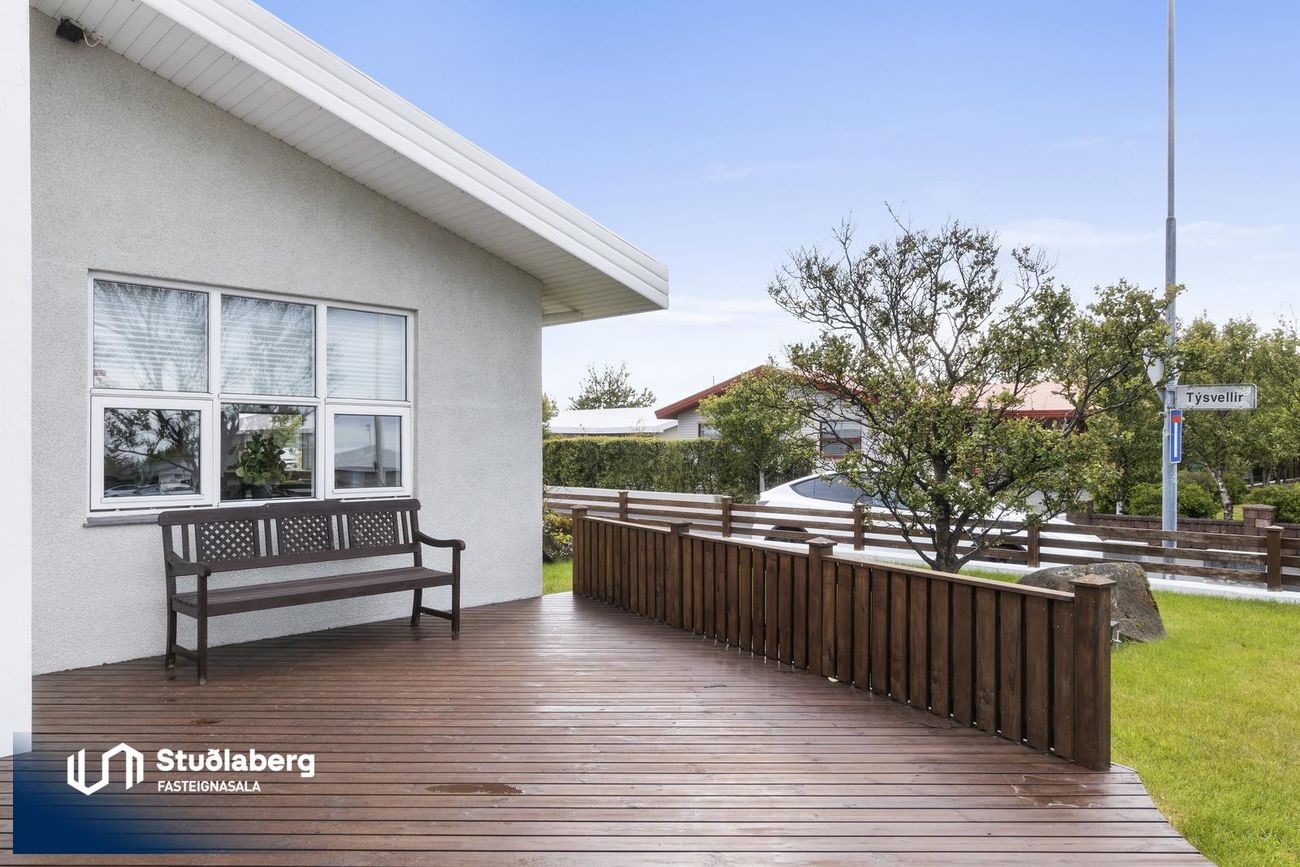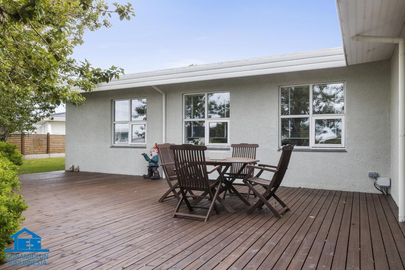 Fullu frágengin lóð með veröndum á þrjá vegu, heitum potti og gróinni lóð.