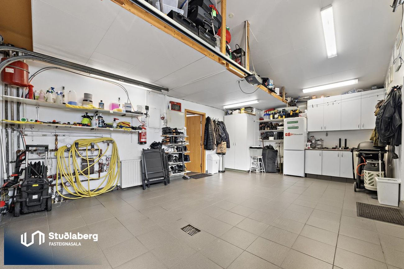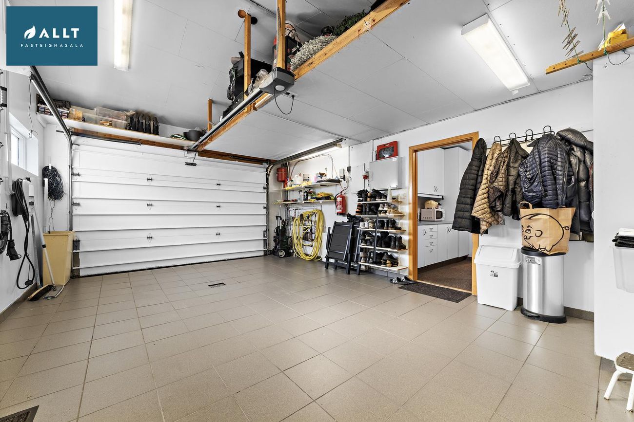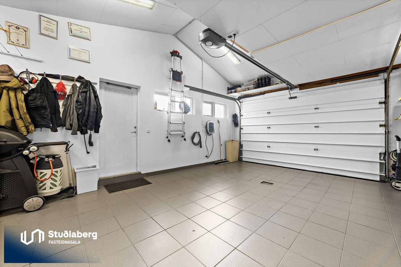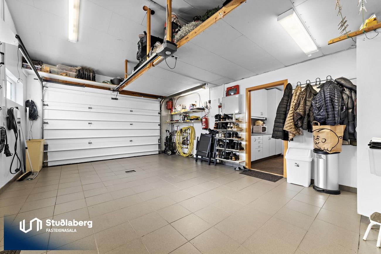 Innangengur bílskúr með flísalögðu gólfi, rafmagnsopnun á hurð og útgönguhurð út á stimplað bílaplan.
