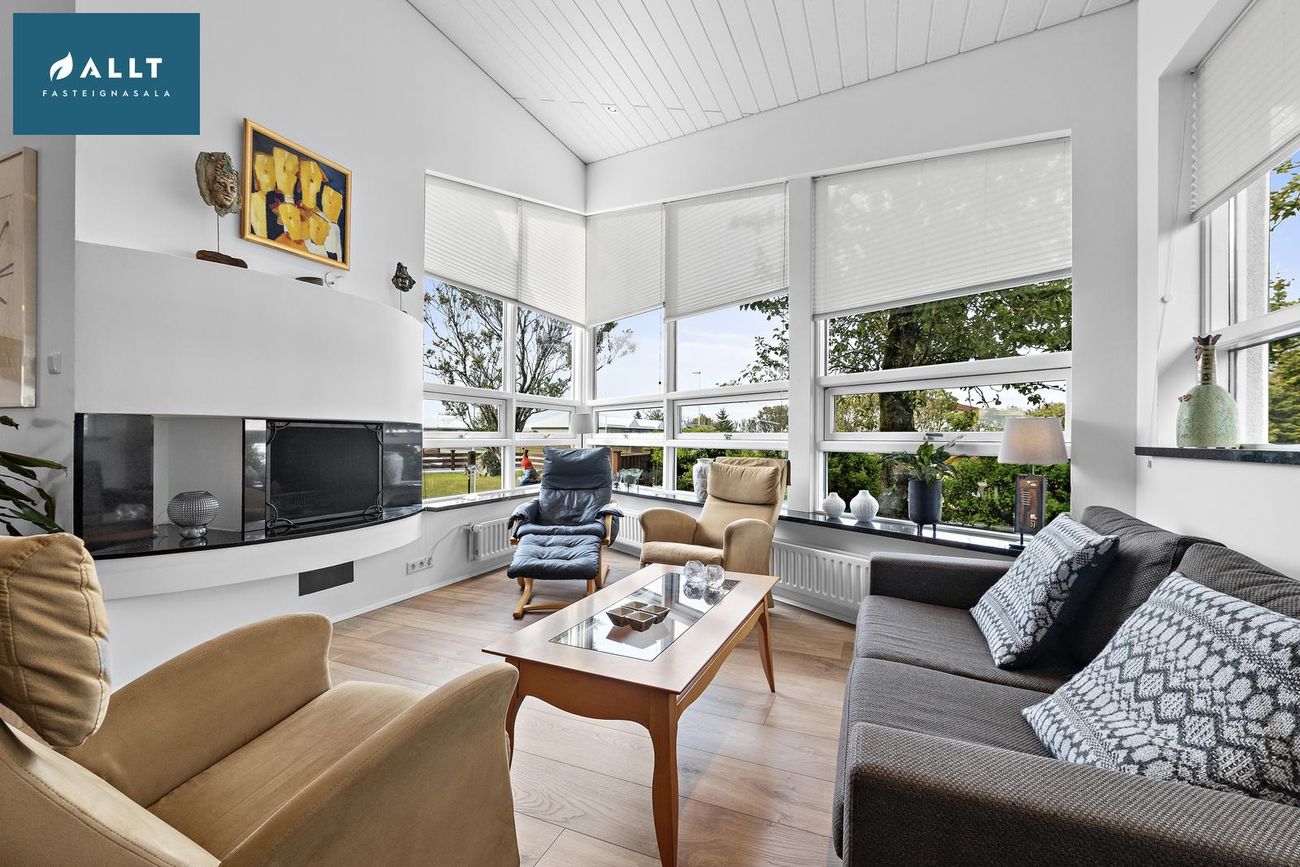 Tvær stofur með parketgólfi, háum gluggum og björtu rými. Neðristofa með arin.