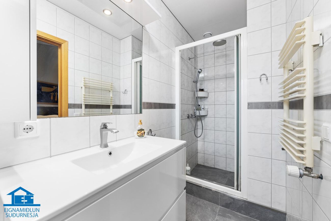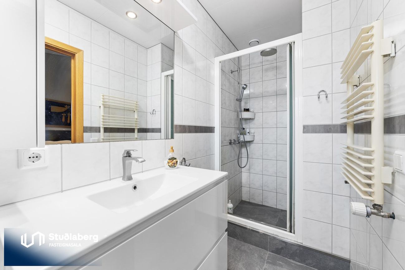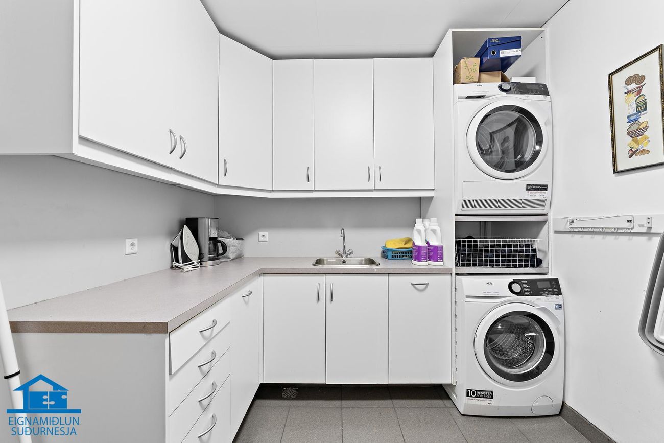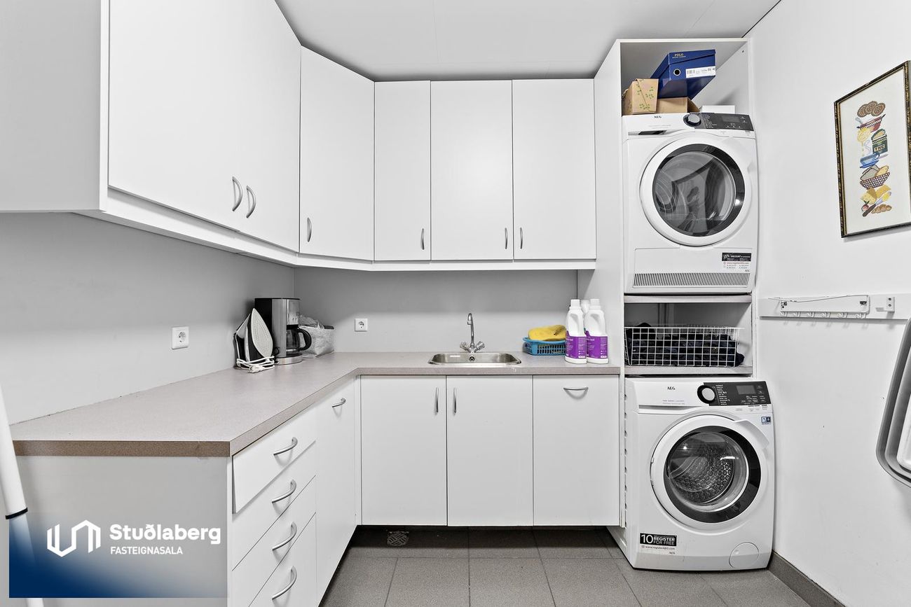 Flísalagt þvottahús með skápaplássi og aðstöðu fyrir þvottavél og þurrkara. Tengir inn í bílskúr.