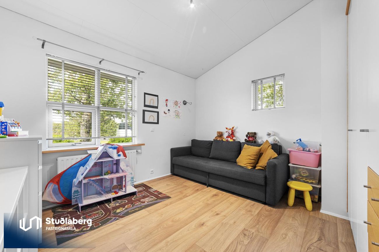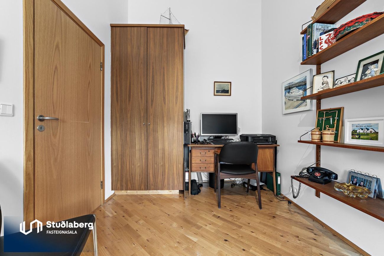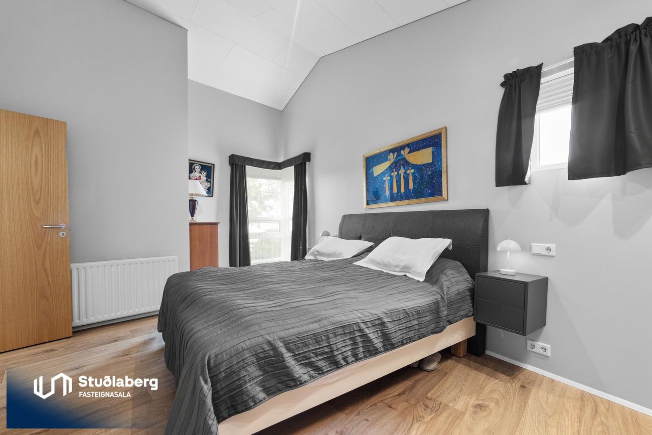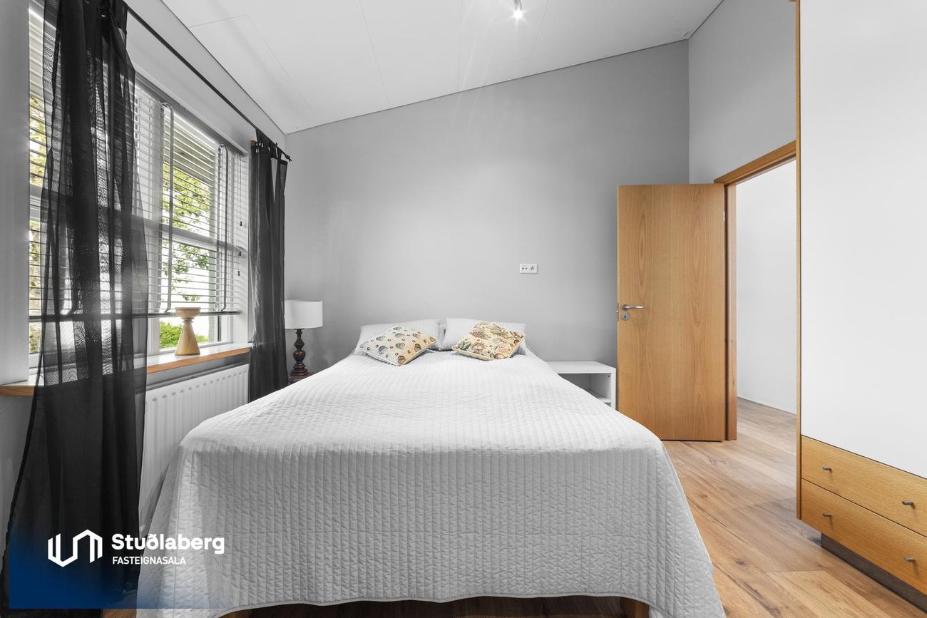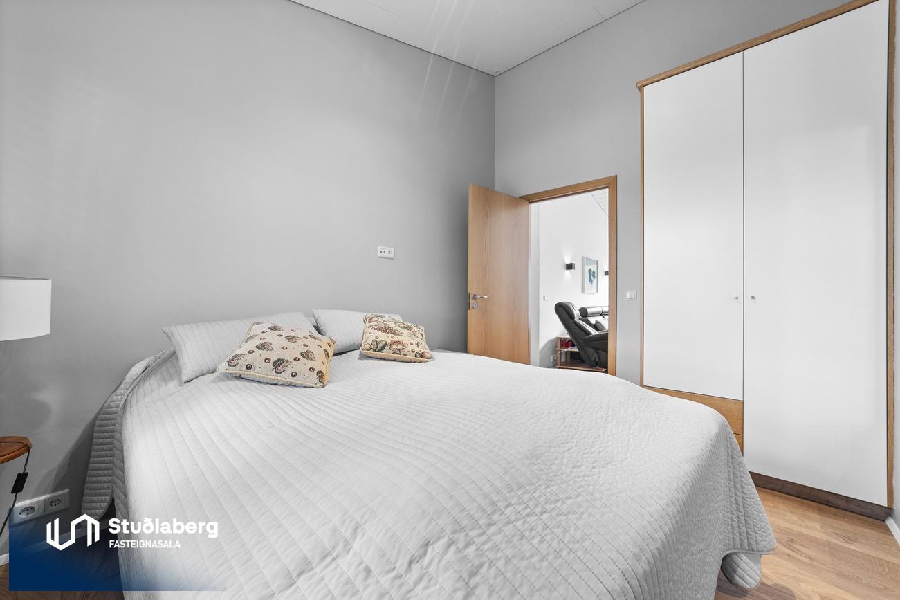 Hjónaherbergi með parketgólfi og baðherbergi. Barnaherbergi með skápum og parketgólfi. Tvö herbergi sameinuð en auðvelt að loka aftur.