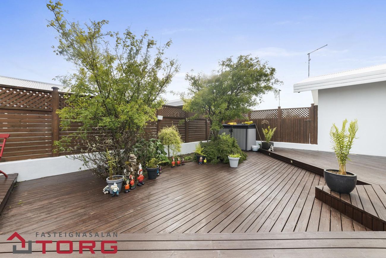 Að utan er stór og afgirt verönd með fallegum viðarpalli og heitum potti.