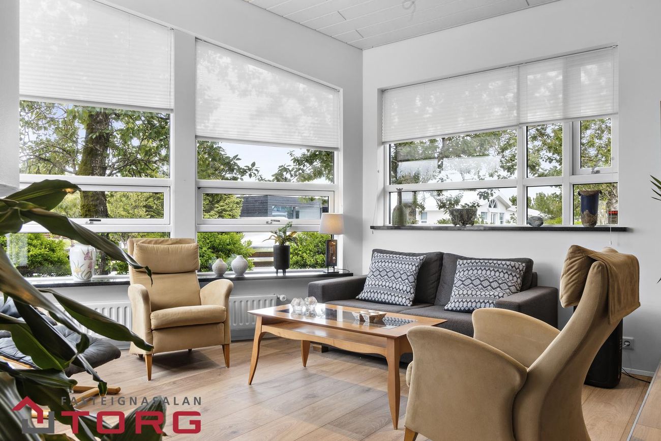 Stofan er björt og rúmgóð með mikilli lofthæð og stórum gluggum sem hleypa inn góðri birtu. Þar er einnig arinn og sjónvarpsrými með útgengi út á verönd.