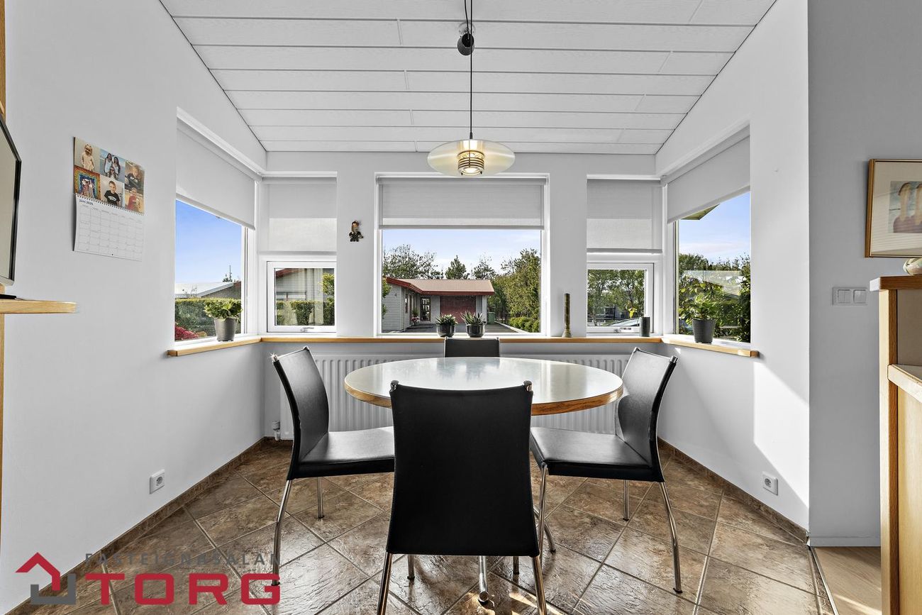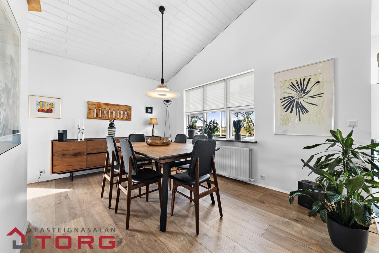 Borðstofa er í opnu rými og parketlögð, hentug fyrir stærri samverustundir.